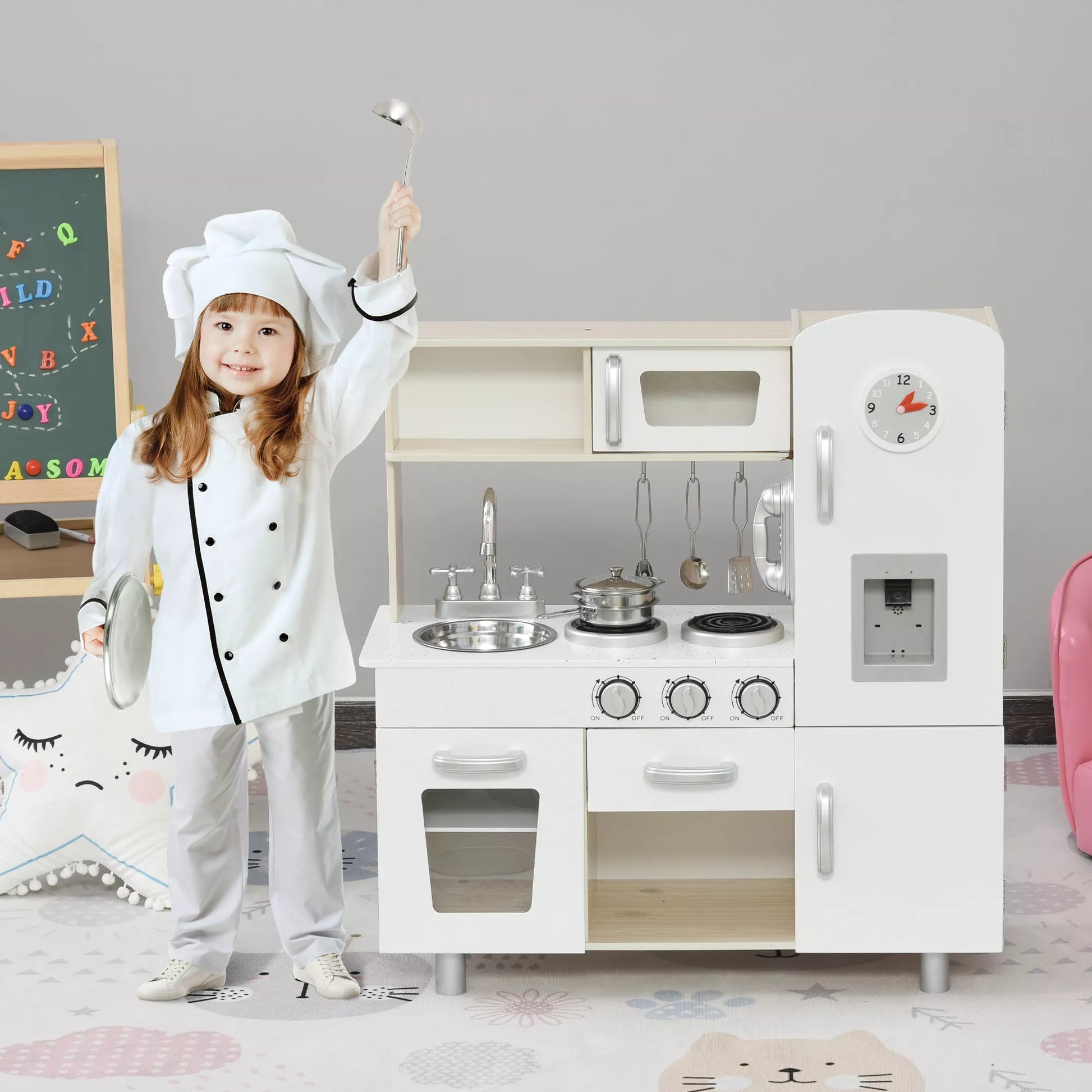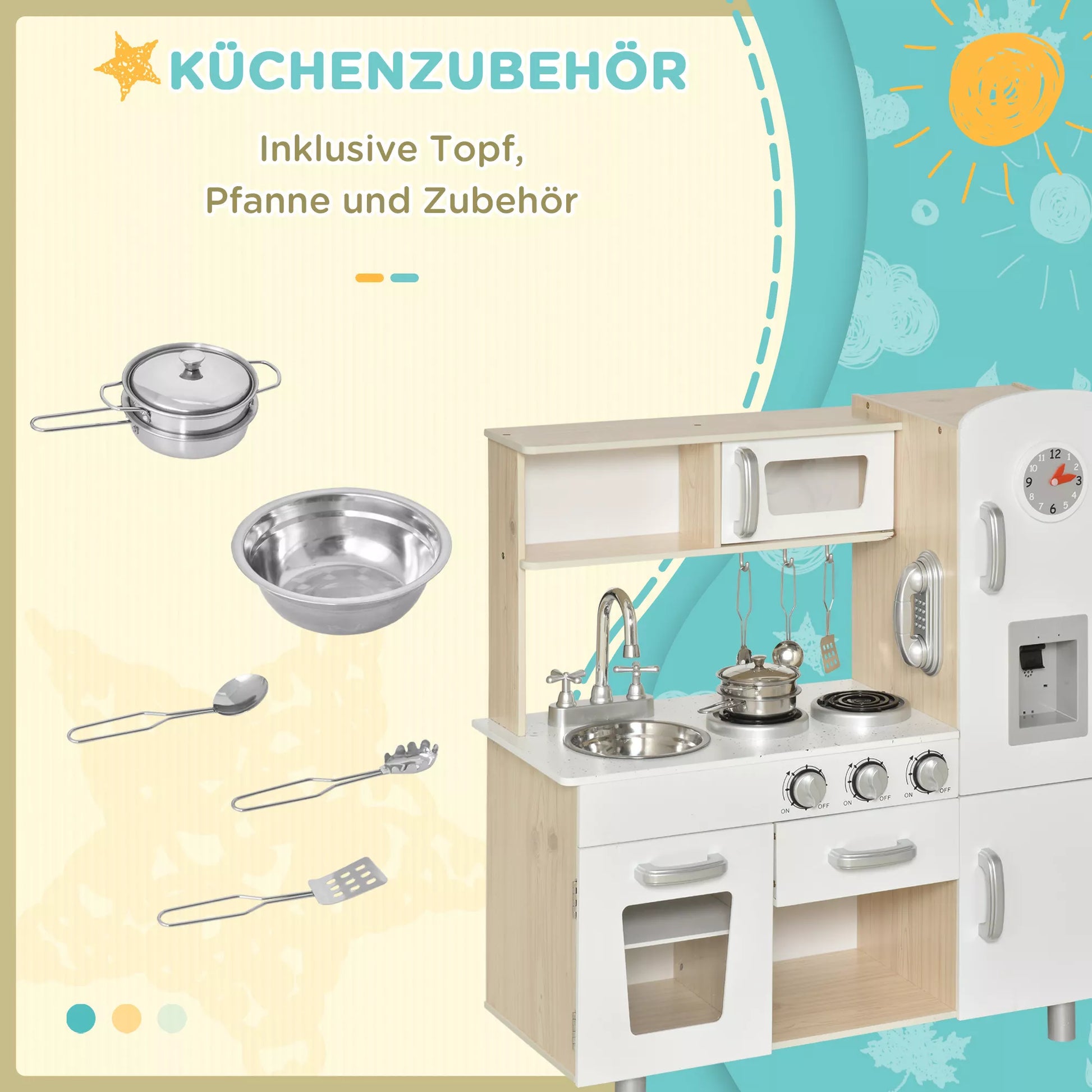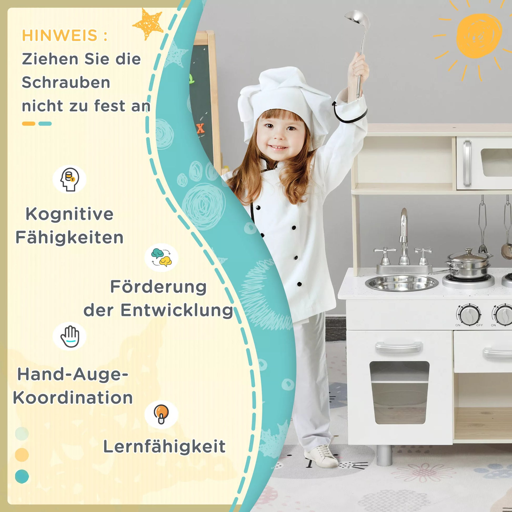 Šis vaikų virtuvėlės komplektas yra puikus pasirinkimas mažiesiems berniukams ir mergaitėms. Vaikai gali kurti savo vaizdingus patiekalus, panašius į tikrus virėjus, ir žaisdami lavinti smulkiąją motoriką, pažintinius gebėjimus bei skaičiavimo įgūdžius. Aukštos kokybės medinės virtuvėlės medžiagos užtikrina ilgalaikį naudojimą. Ko laukiate? Ateikite ir mėgaukitės tėvų ir vaikų bendravimo laiku, kurį suteikia ši žaislinė virtuvėlė!