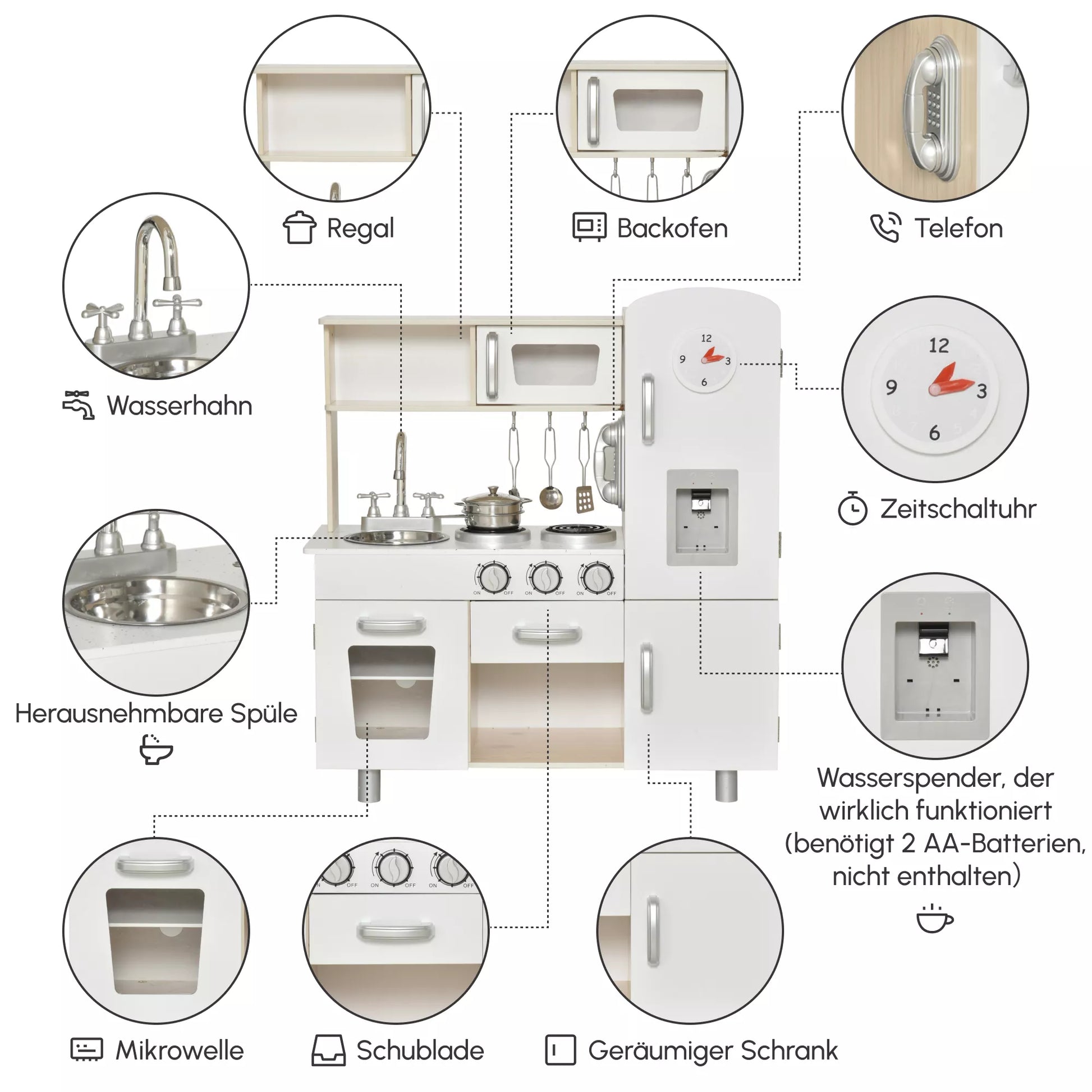 Vaikų virtuvėlė su priedais, svajonių virtuvėlė, žaidimų virtuvėlė, žaislinė virtuvėlė vaikams nuo 3 metų, pušies mediena, MDF, balta, 74 x 30 x 81 cm