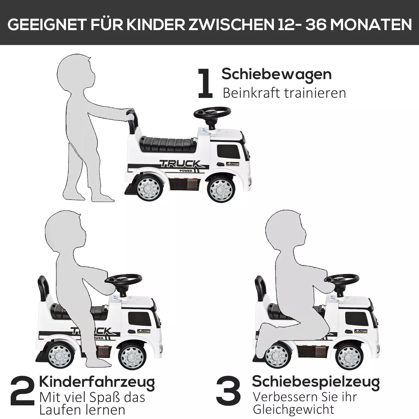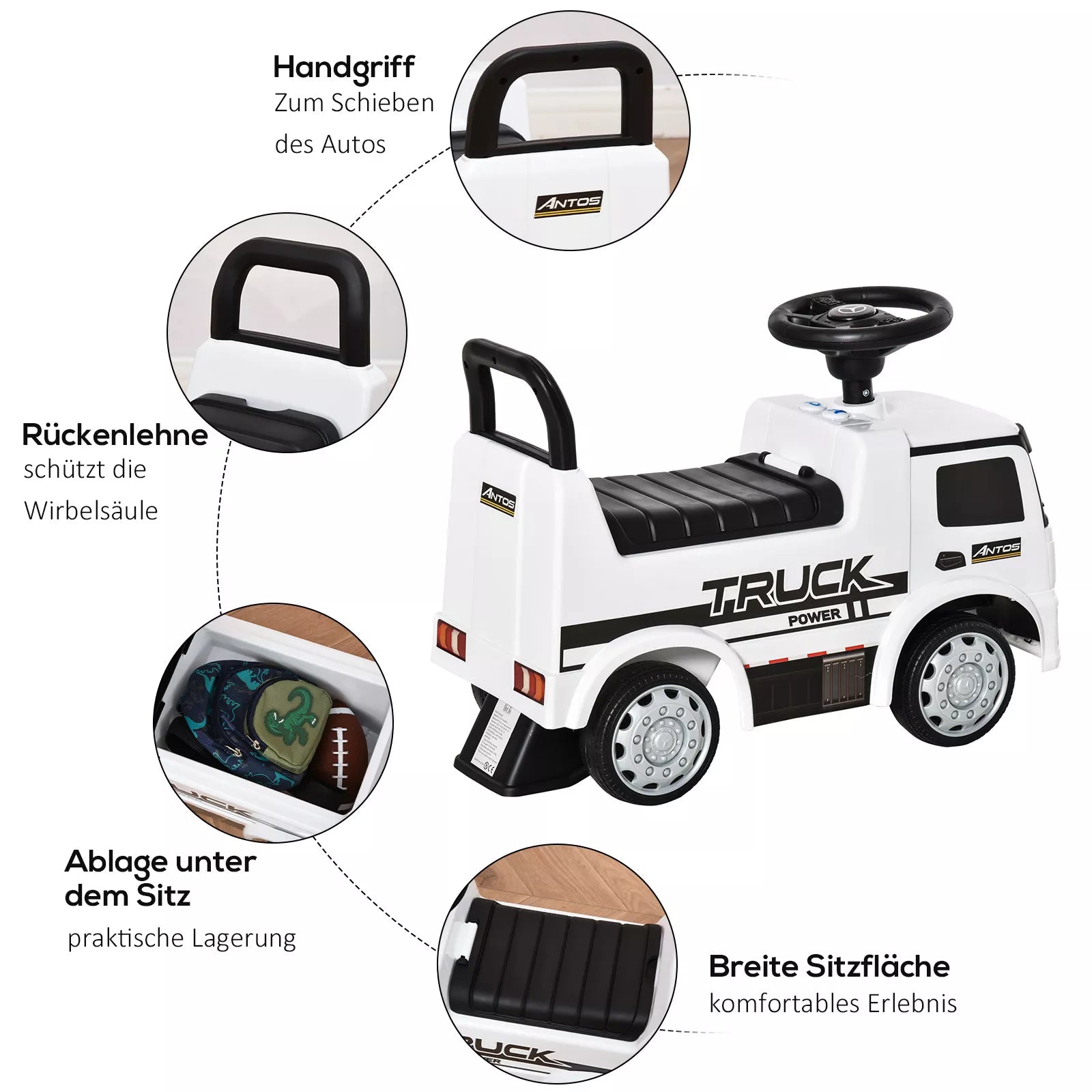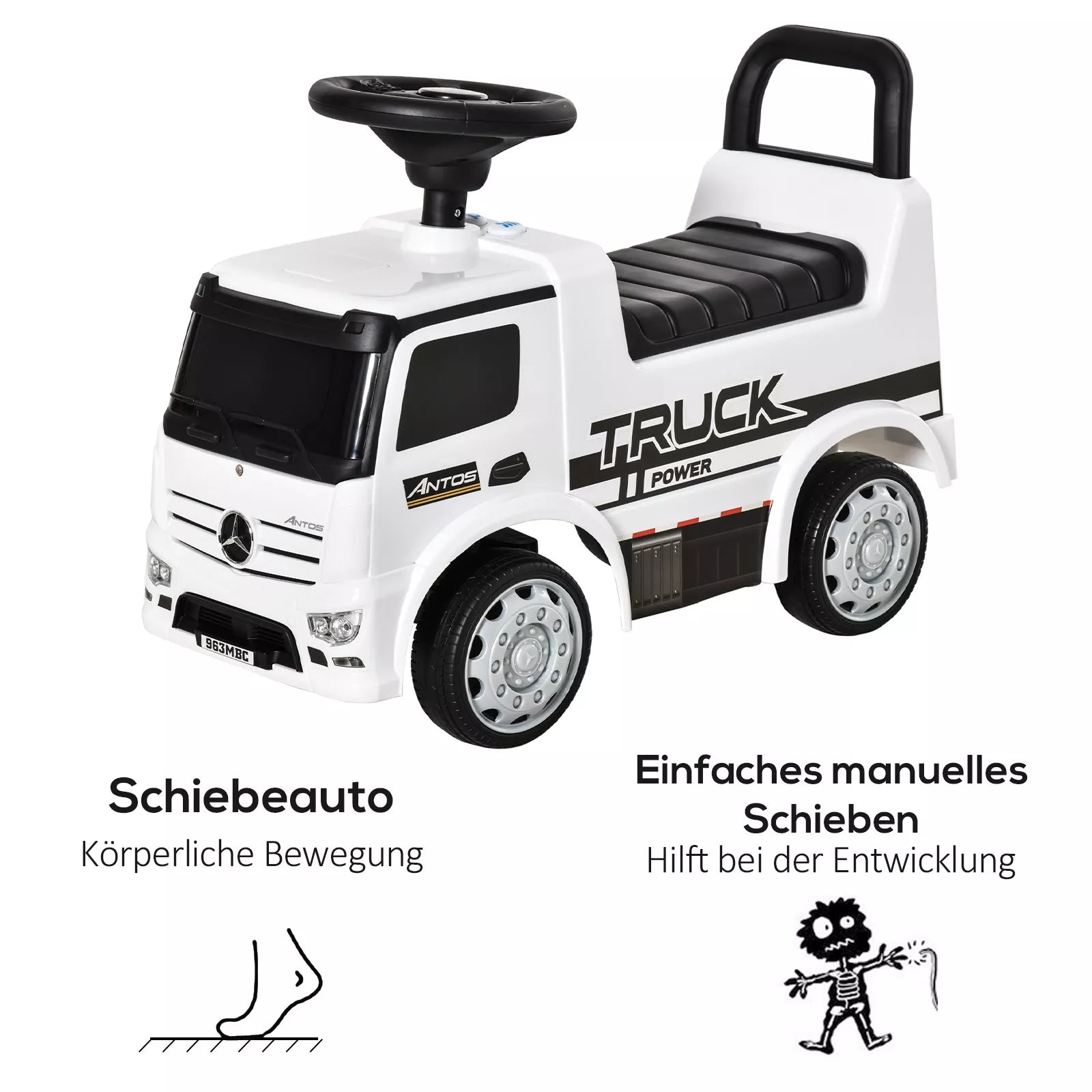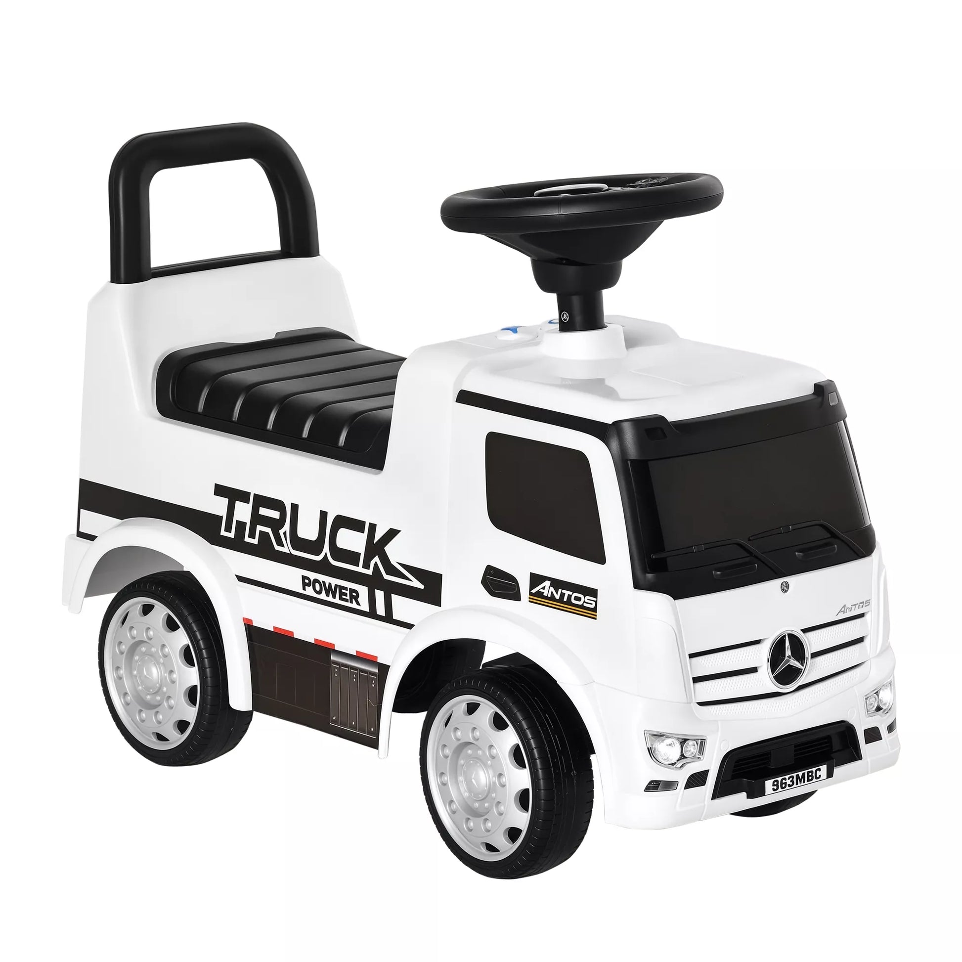 Vaikiška transporto priemonė, automobiliukas stumdukas, licencijuotas Mercedes ANTOS sunkvežimio dizaino, su šviesomis. Skirta vaikams nuo 12 iki 36 mėnesių. Medžiaga: metalas, PP plastikas. Spalva: balta+juoda. Matmenys: 62,5x28,5x45cm