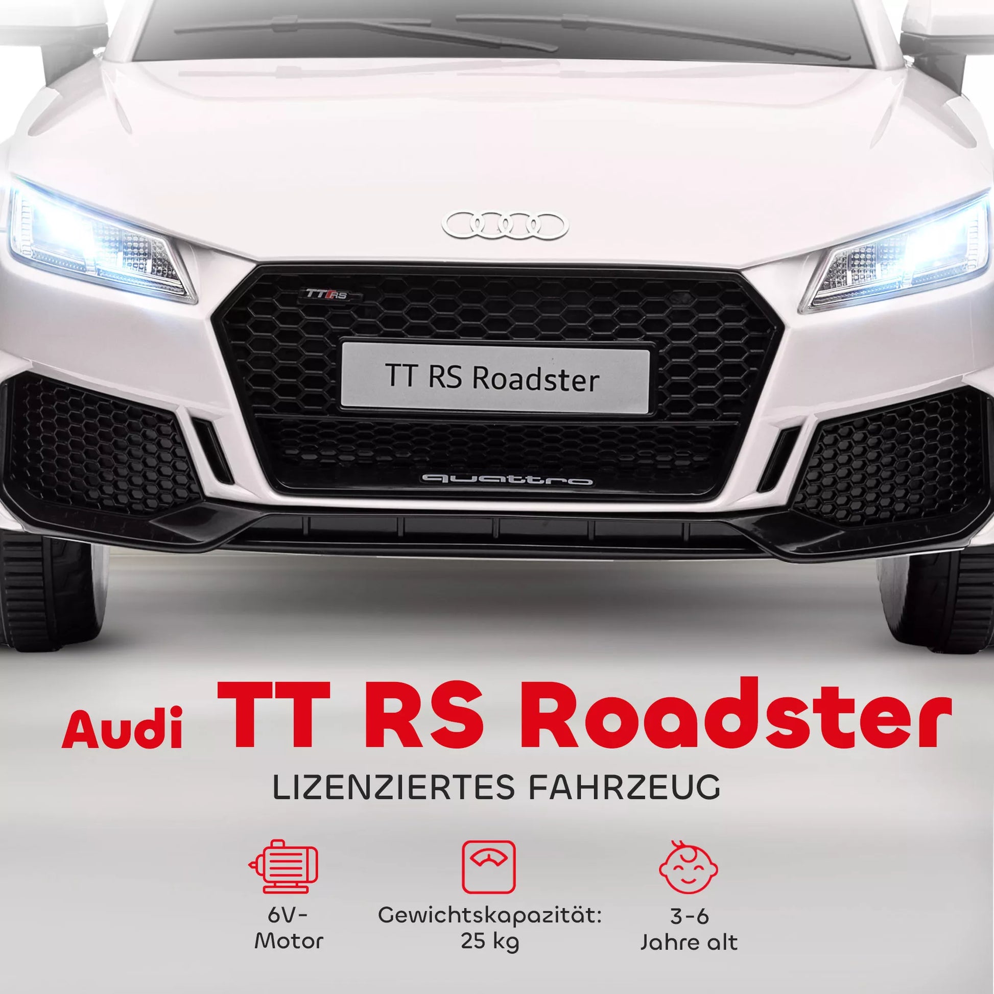 Vaikiškas elektromobilis, Audi TT RS Roadster, 3 km/h, su nuotolinio valdymo pultu, LED, USB, baltas
