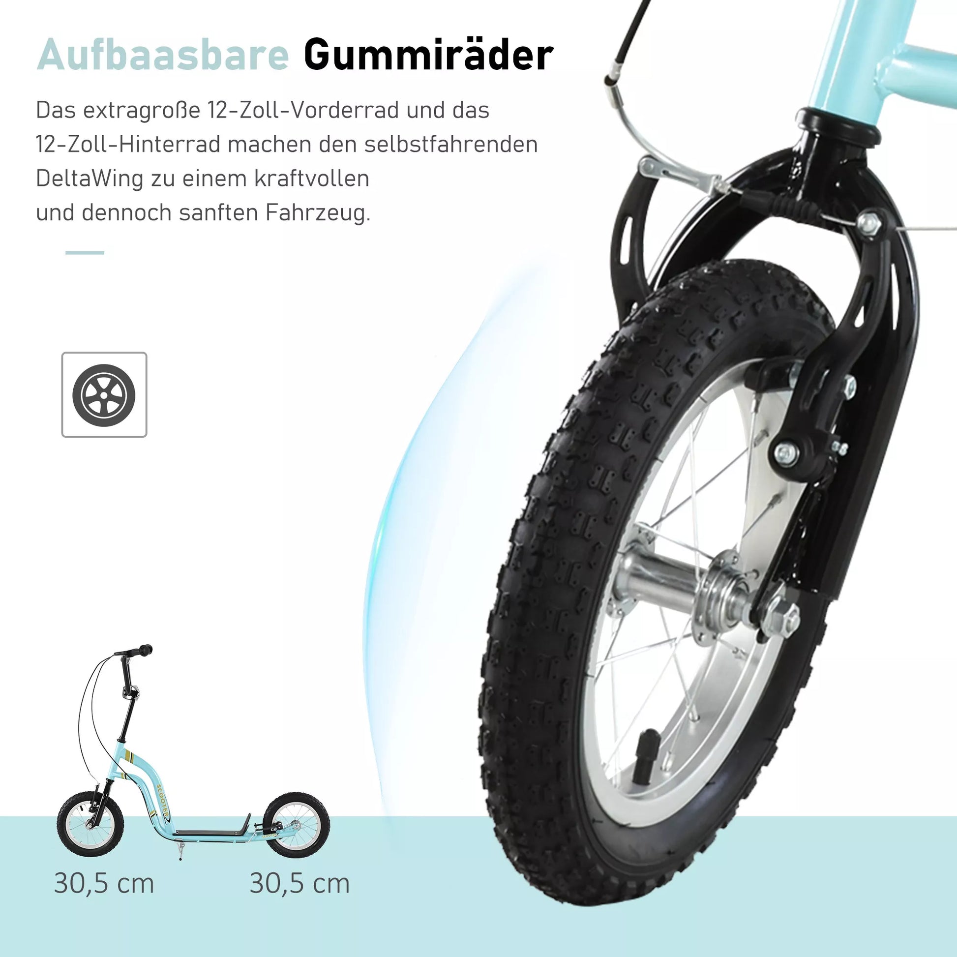 - ✔ 12 colių (30 cm) skersmens priekinės ir galinės paspirtuko guminės padangos sklandžiam važiavimui