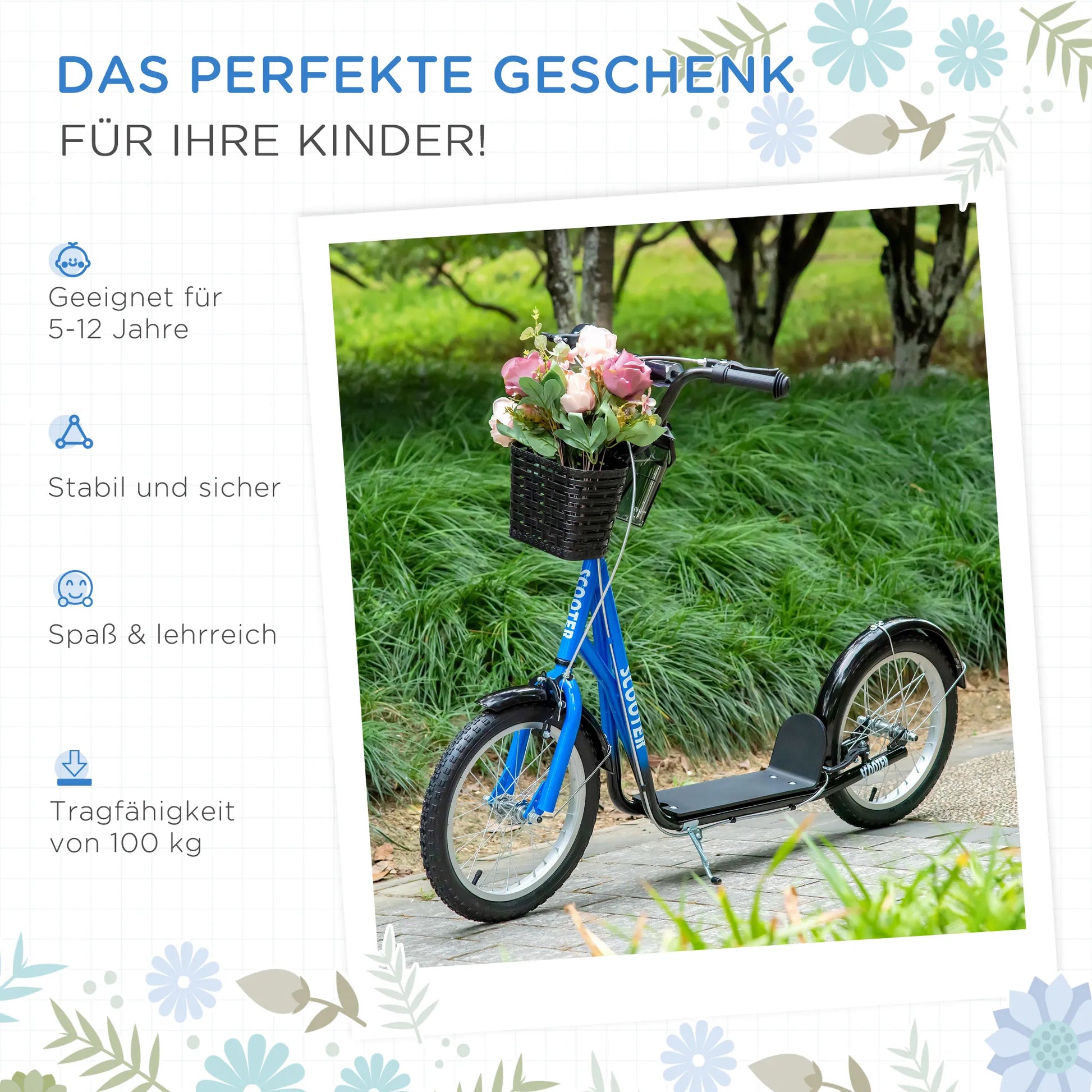 Vaikų paspirtukas, paspirtukas su stabdžiais, su krepšeliu, reguliuojamas aukštis, skirtas vaikams nuo 5 iki 12 metų, mėlynas + juodas
