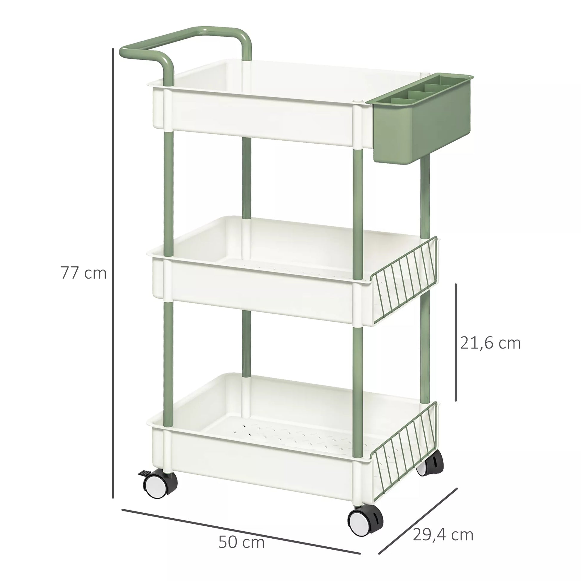 Vežimėlis, 3 lentynos, pakabinamas krepšys, stumdoma rankena, 4 ratukai, metalo rėmas, baltas, 50 x 29,4 x 77cm