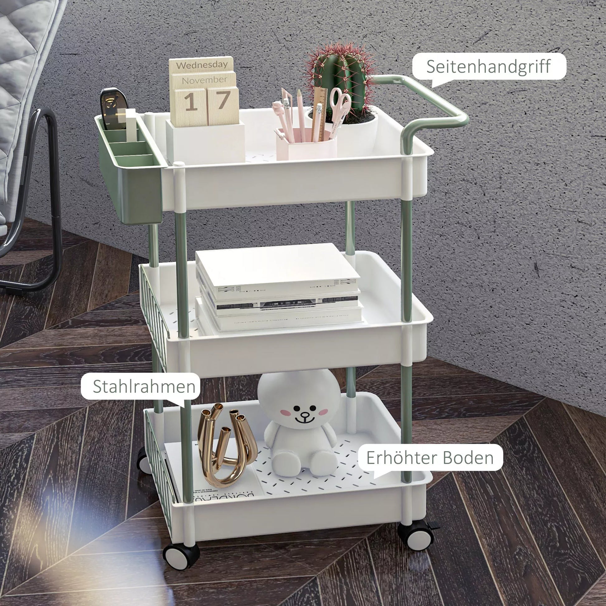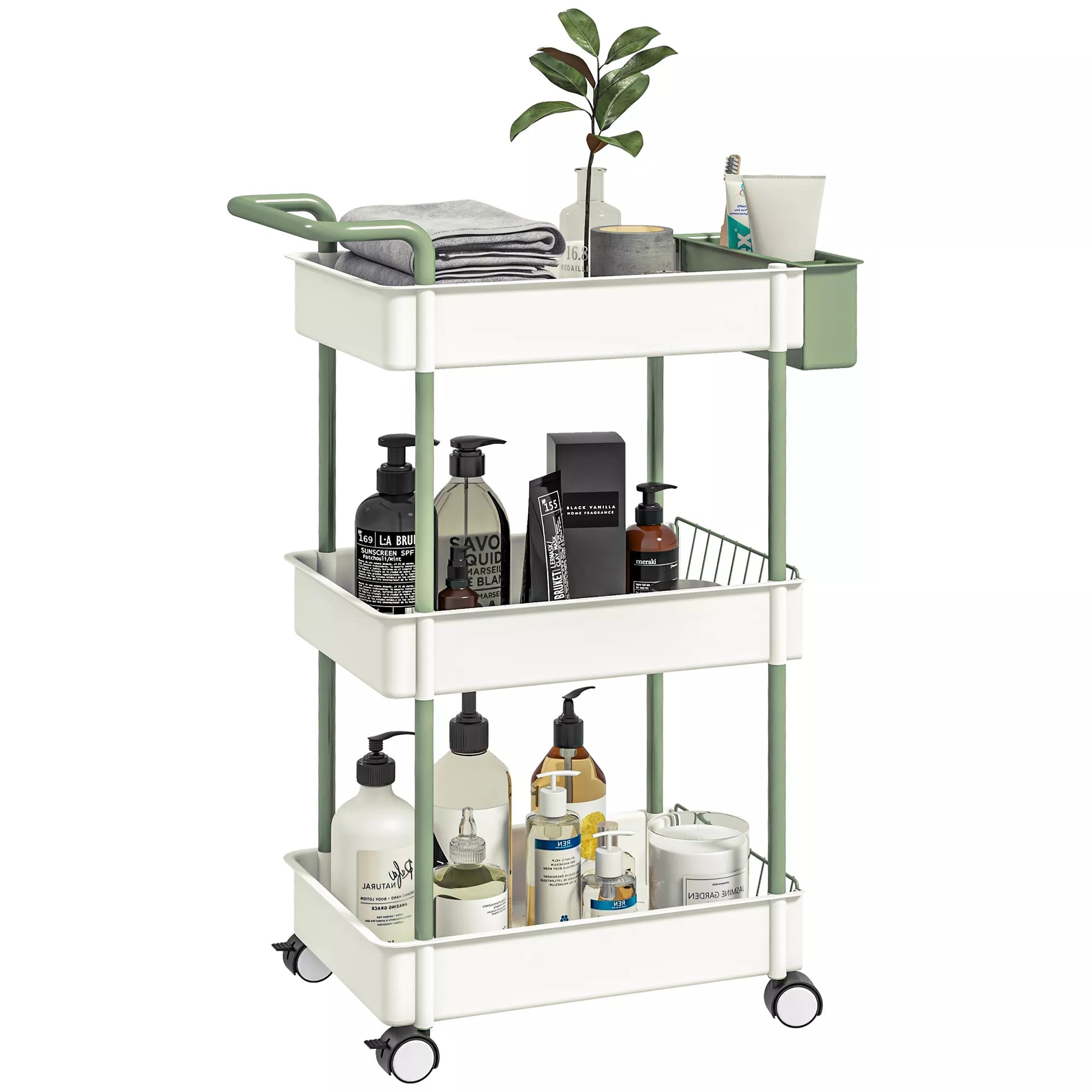 Mūsų vežimėlis ant ratukų yra idealus sprendimas mažoms erdvėms, kurioms reikia papildomos vietos daiktams laikyti. Su trimis erdviomis lentynomis ir praktišku pakabinamu krepšeliu jis suteikia pakankamai vietos vonios reikmenims, įrankiams ir daugeliui kitų daiktų. Keturi lengvai riedantys ratukai leidžia šį universalų vežimėlį be vargo perkelti. Nesvarbu, ar vonios kambaryje, virtuvėje, ar dirbtuvėse – šis daugiafunkcis tvarkos organizatorius gali būti naudojamas įvairiems tikslams – tai tikras jūsų namų privalomas pirkinys!