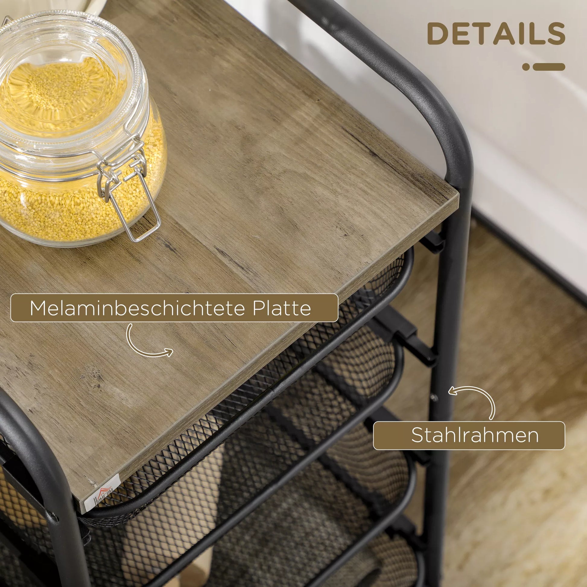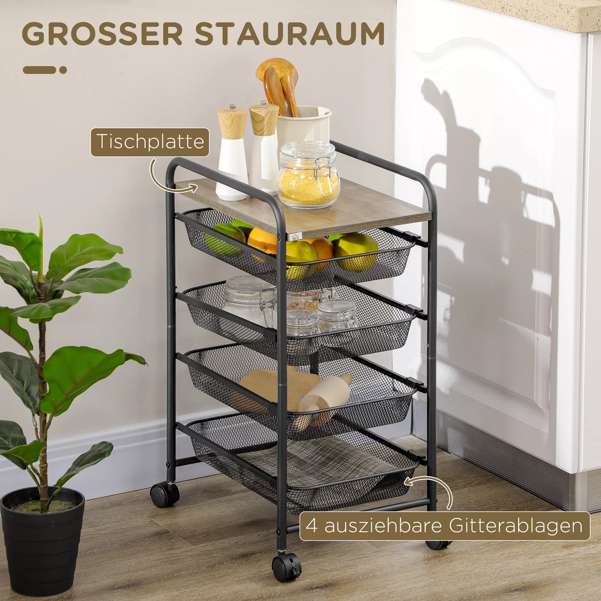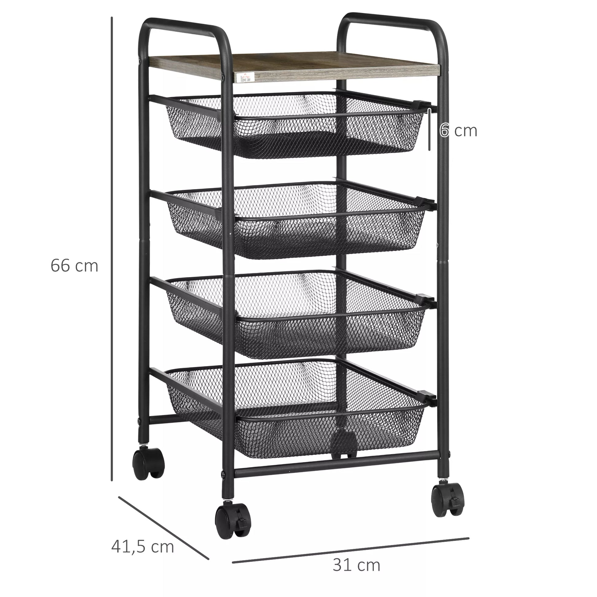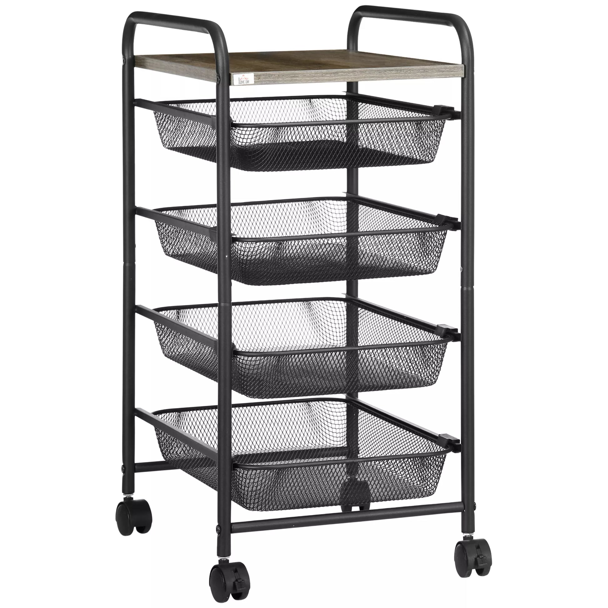 Vežimėlis su 4 krepšeliais, virtuvės vežimėlis, 4 ratai su 2 stabdžiais, universalus vežimėlis, juodas, 41,5 x 31 x 66 cm