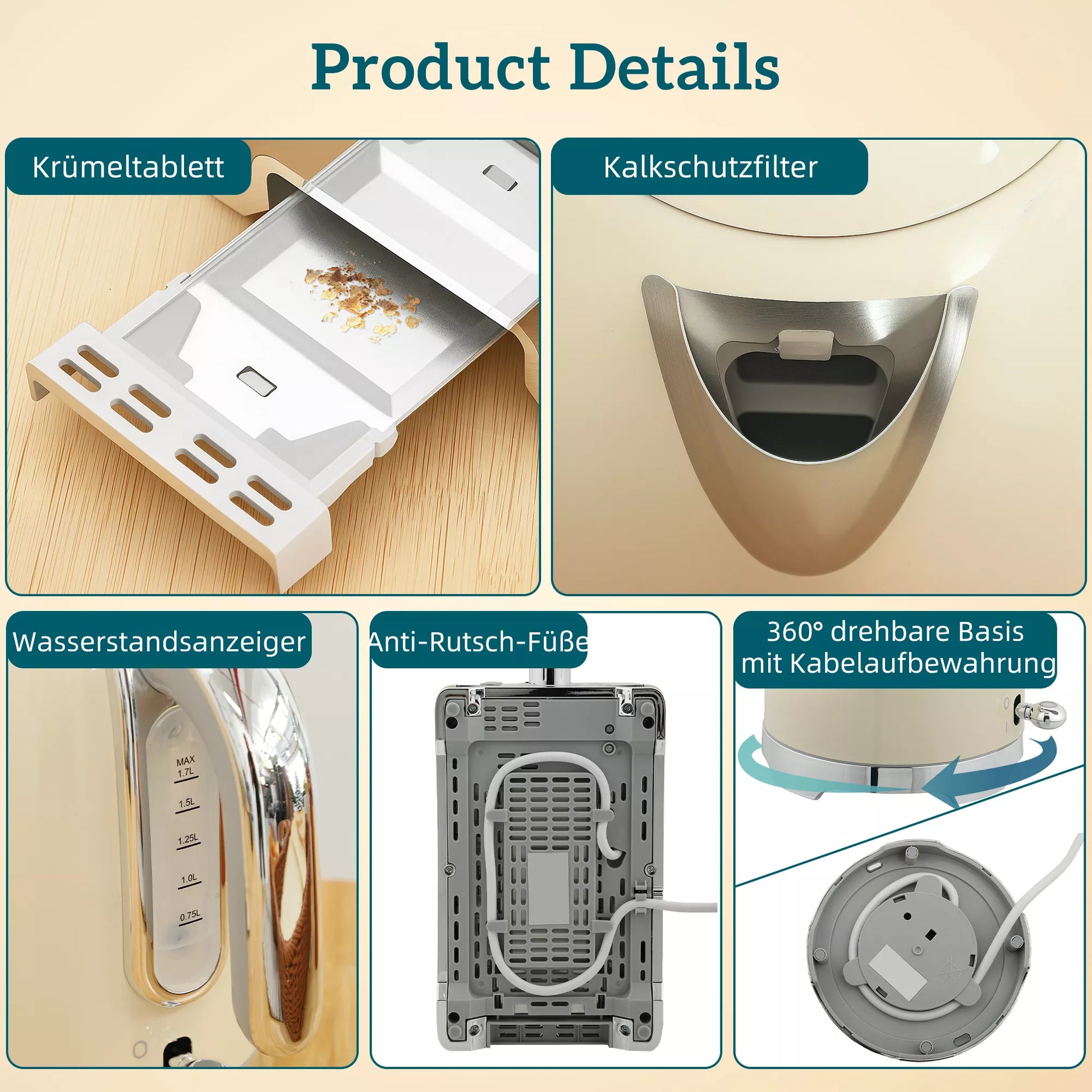 Pradėkite savo dienas idealiai su skrudintuvo ir virdulio rinkiniu. Sukurtas aktyvioms šeimoms arba darbui namuose, 1,7 litro talpos virdulys turi integruotą termometrą ir patikimą „Otter“ termostatą greitam ir tiksliam vandens kaitinimui. Saugumą garantuoja automatinis išsijungimas bei apsauga nuo veikimo be vandens ir perkaitimo. Dviejų angų skrudintuvas turi 7 skrudinimo lygius, kad visada gautumėte tobulai paskrudintą duoną, nesvarbu, ar ji šviežia, ar šaldyta.