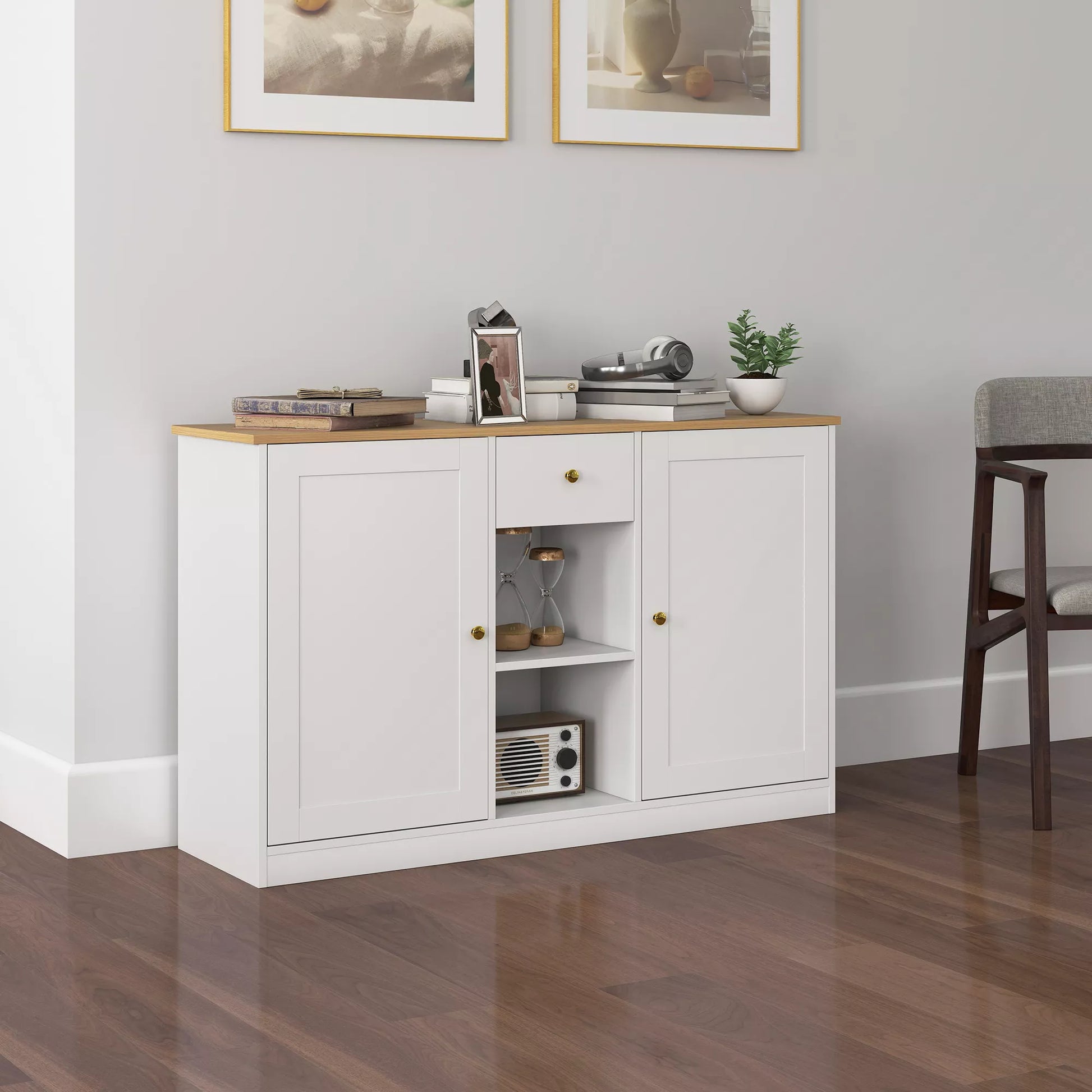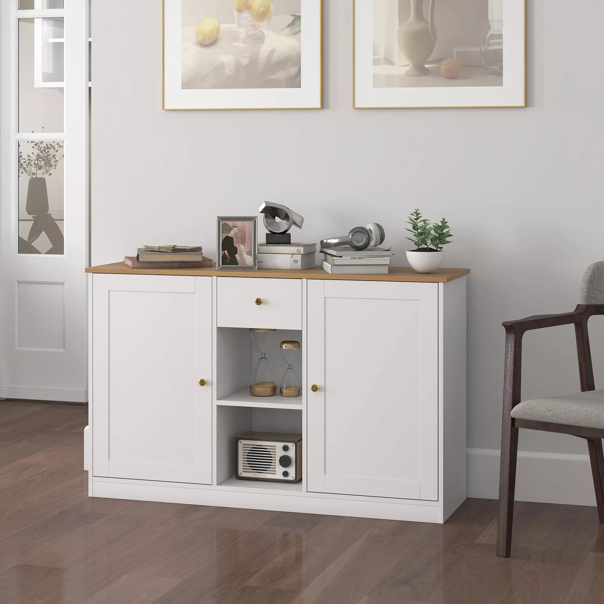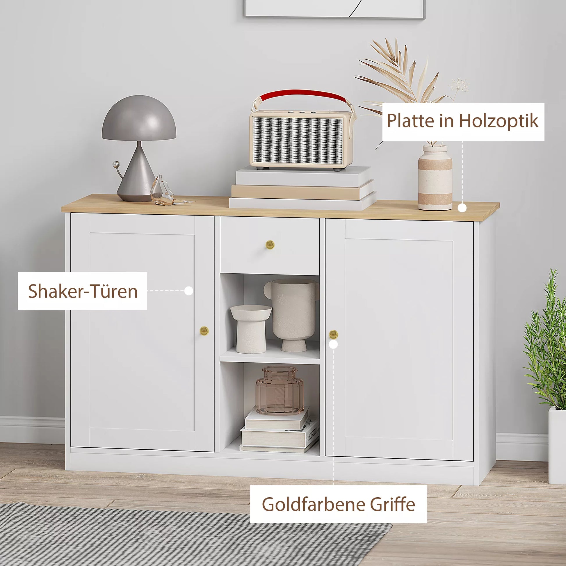 Ar ieškote elegantiško sprendimo, kaip sutvarkyti daiktus? Modernus komoda siūlo daug vietos daiktams laikyti: plačią viršutinę plokštumą, vieną stalčių, du skyrius su durelėmis ir dvi atviras lentynas – puikiai tinka indams, knygoms ar kasdieniams būtiniausiems daiktams. Šio baldo šviesus baltas dizainas su medžio imitacijos plokšte, „Shaker“ tipo durelėmis ir auksinėmis rankenėlėmis suteikia jaukumo ir stiliaus. Puikiai tinka svetainei, valgomajam, koridoriui ar virtuvei.