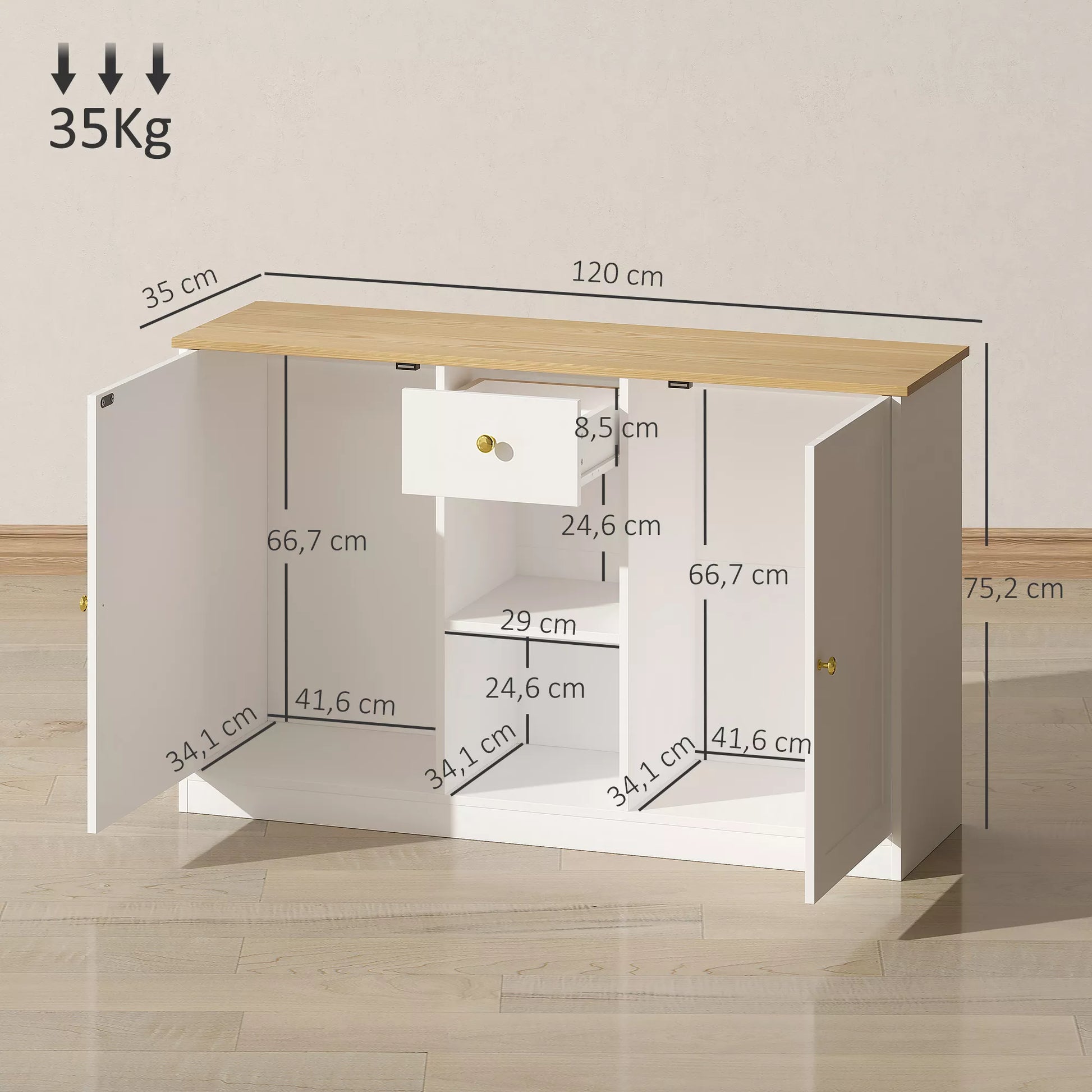 - ✔ Keliamoji galia: 35 kg (bendra), 10 kg (viršutinė plokštuma), 5 kg (stalčius/lentyna)