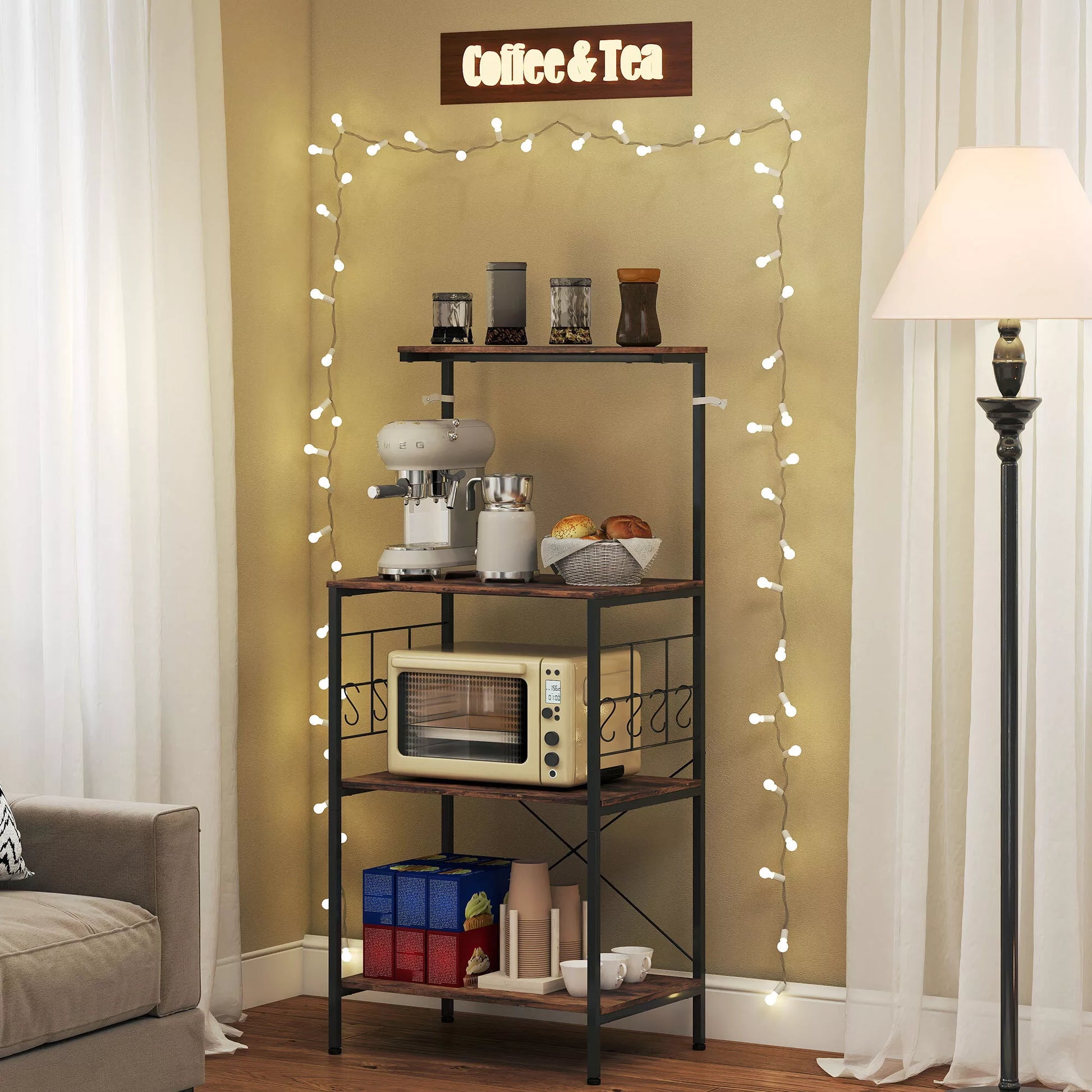 Ar kenčiate nuo netvarkos virtuvėje ir nestabilių lentynų? Netvarkinga patalpa apsunkina maisto gaminimą. Kepyklos lentynos padės išspręsti šią problemą, nes turi didelį darbo paviršių, viršutinę ir dvi apatines lentynas – puikiai tinka mikrobangų krosnelei, indams ir kt. Šoninės metalinės grotelės su 8 S formos kabliais suteikia vietos pakabinti puodelius ar virtuvės reikmenis, kad jie būtų po ranka. Rustikalios rudos spalvos virtuvės lentynos su juodu rėmu puikiai tinka bet kurioje virtuvėje.