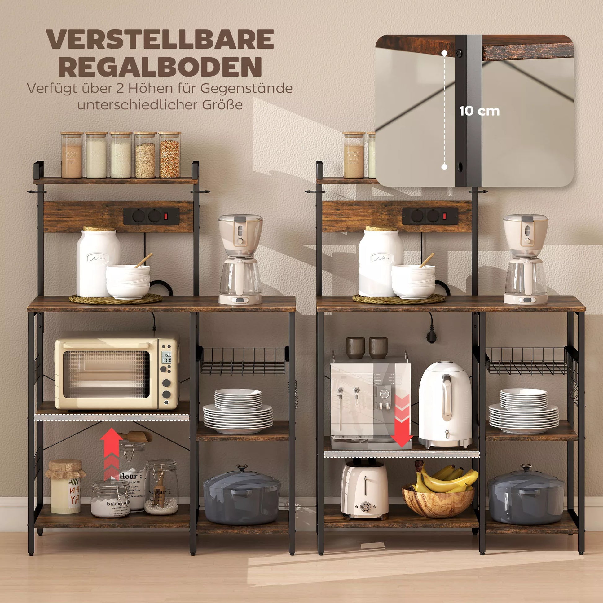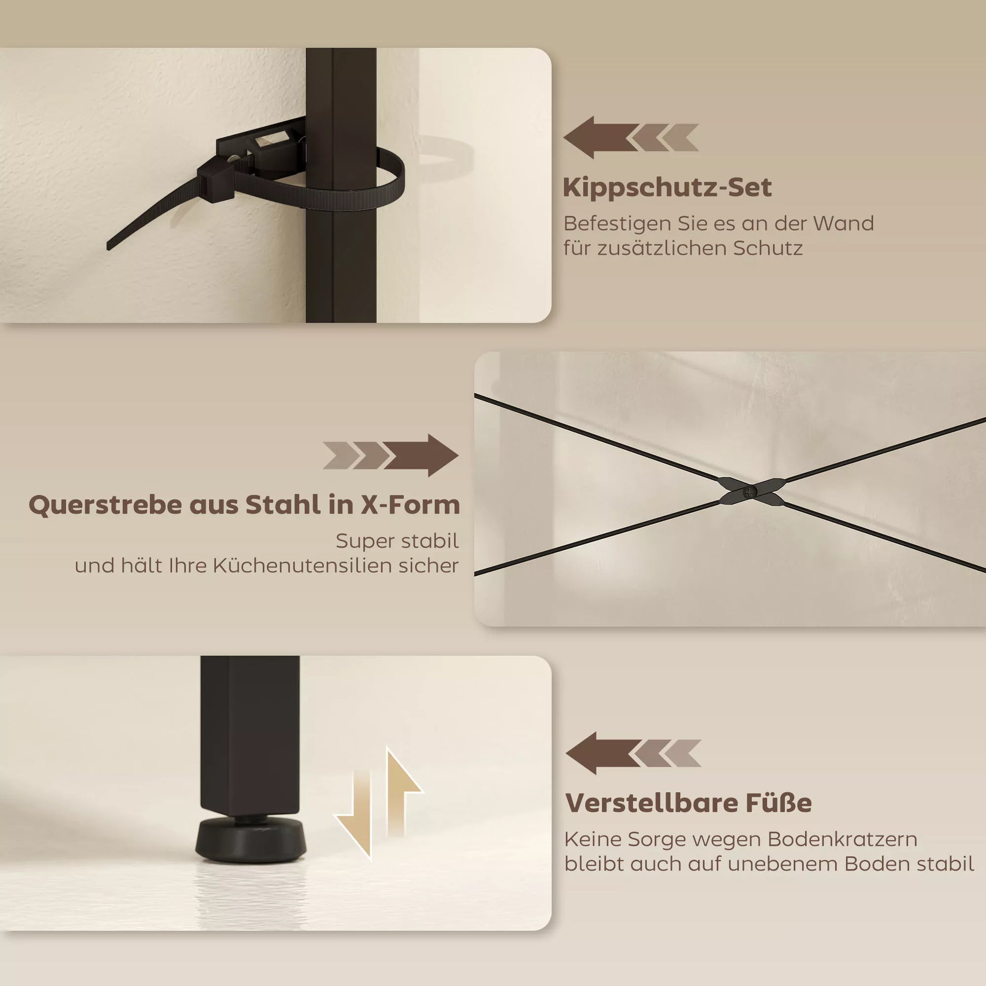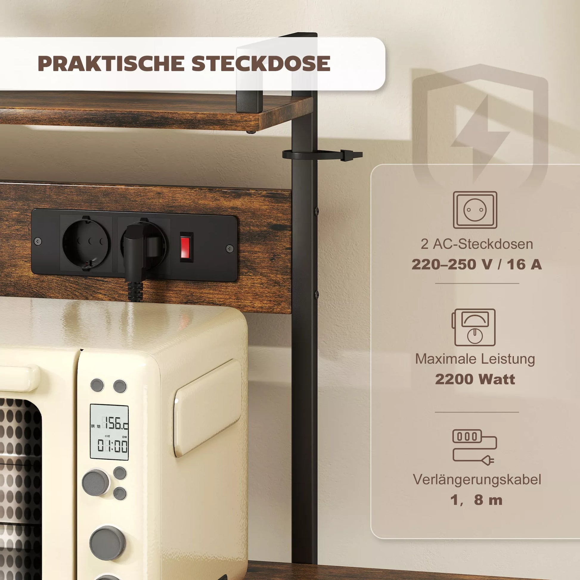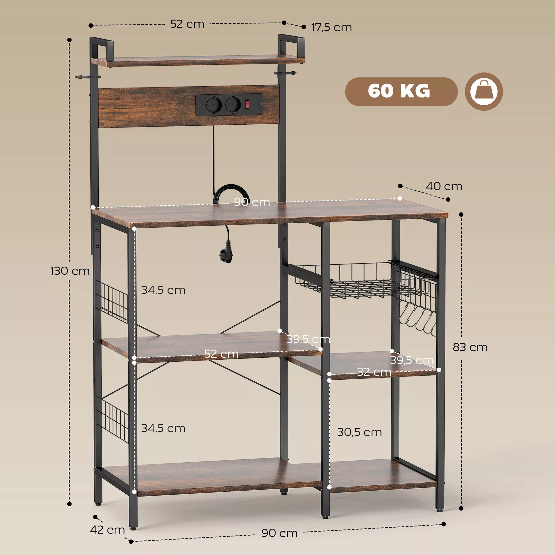 Virtuvinė pastatomos lentynos su 2 elektros lizdais, 5 S formos kabliukais, 5 lentynomis, krepšiu, X formos atramomis iš plieno, 90 x 42 x 130 cm