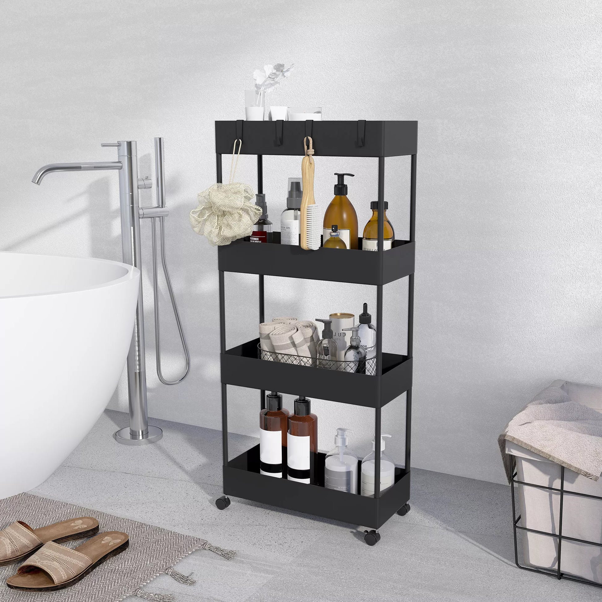 Virtuvės vežimėlis su 4 lentynomis, 4 lanksčiais kabliukais, 4 ratukais, 40 cm x 19 cm x 90 cm, siauros vietos vežimėlis, juodas
