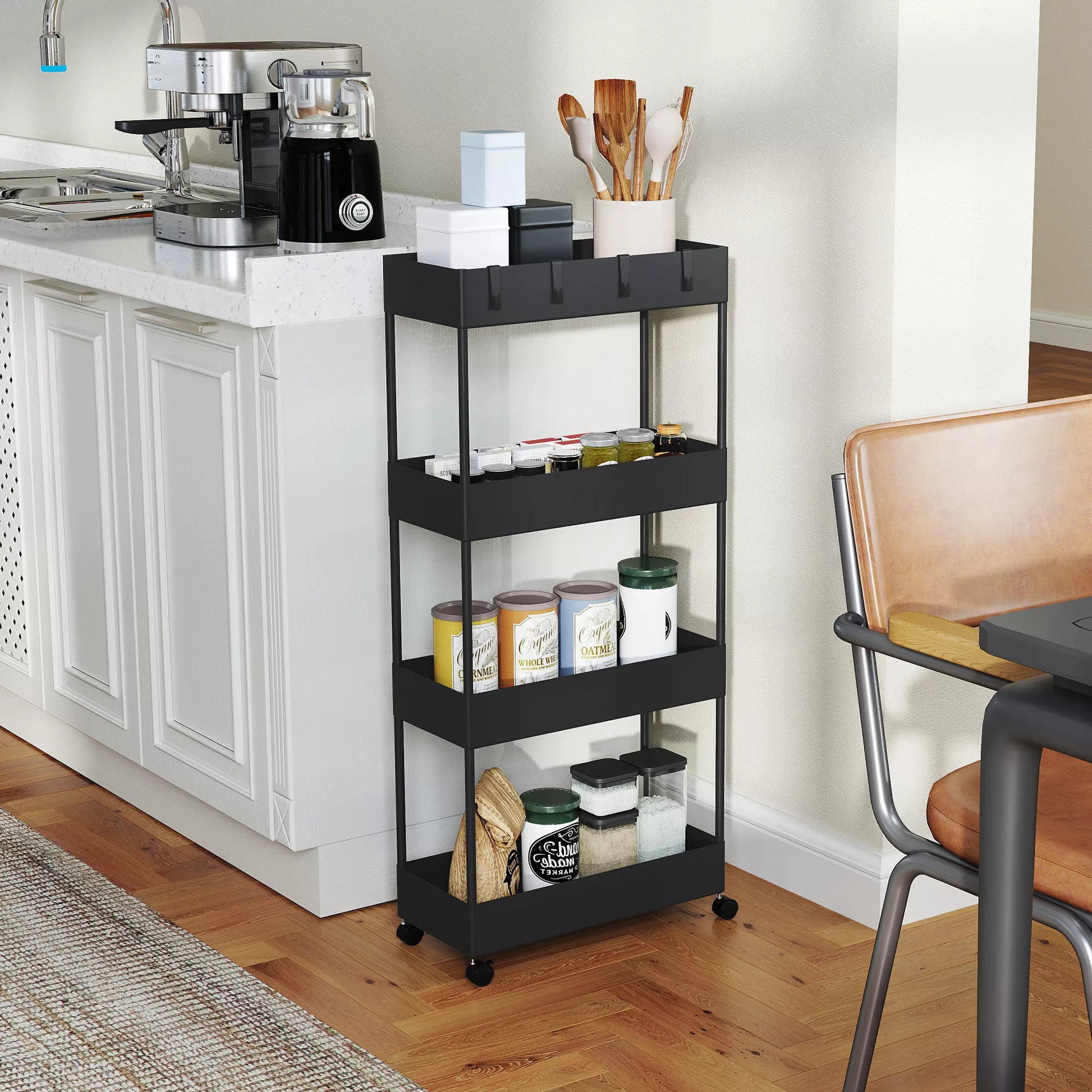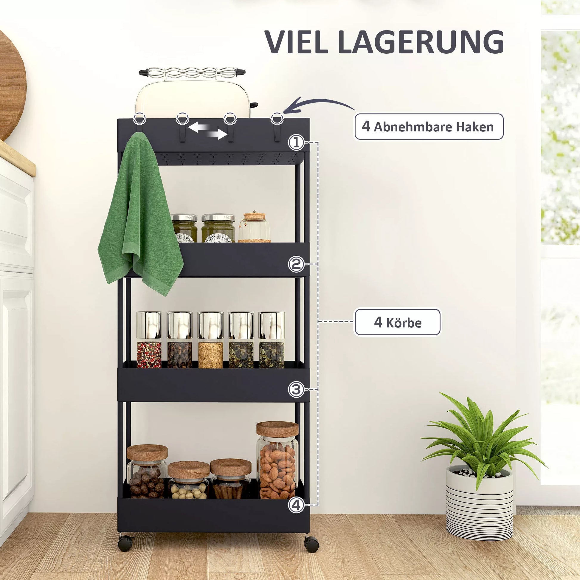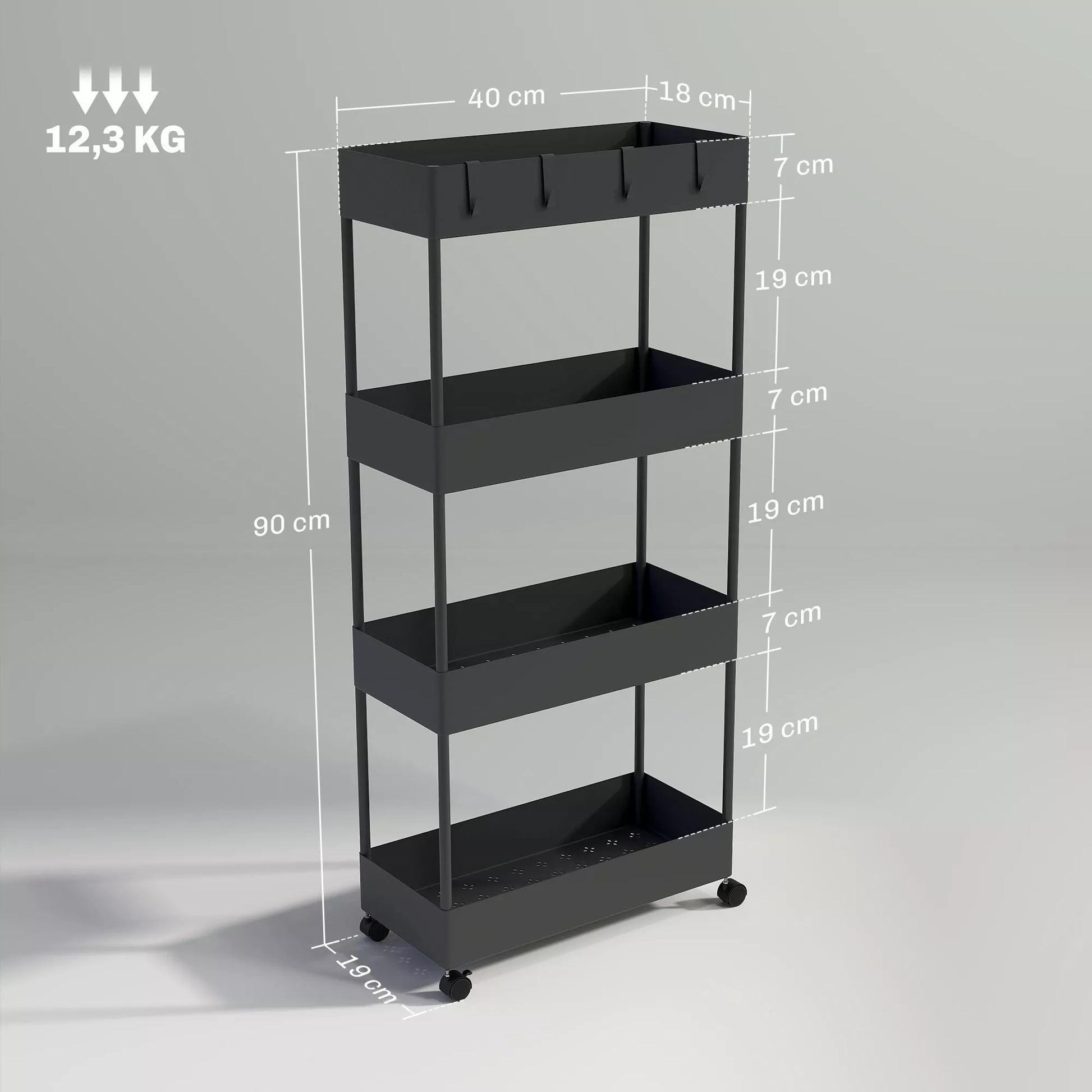Šis vežimėlis idealiai tinka mažiems, papildomos laikymo vietos reikalaujantiems kambariams. Su keturiomis lentynomis ir keturiais nuimamais kabliukais jis suteikia pakankamai vietos virtuvės reikmenims ir maisto produktams. Dėl sklandžiai riedančių ratukų jį galima lengvai perkelti į bet kurią norimą vietą. Jis puikiai tinka naudoti kaip virtuvės staliukas, serviravimo vežimėlis ir daugeliui kitų paskirčių.