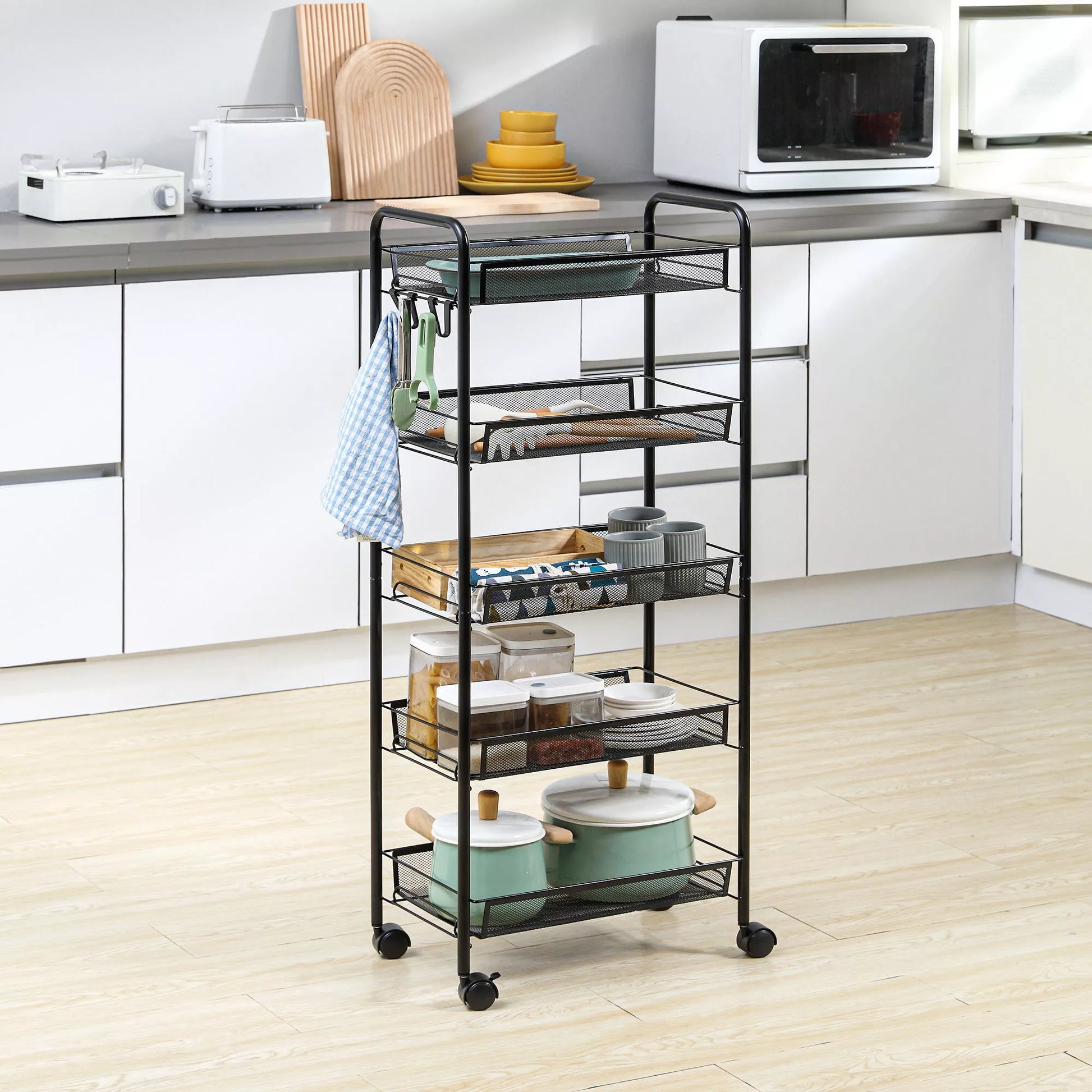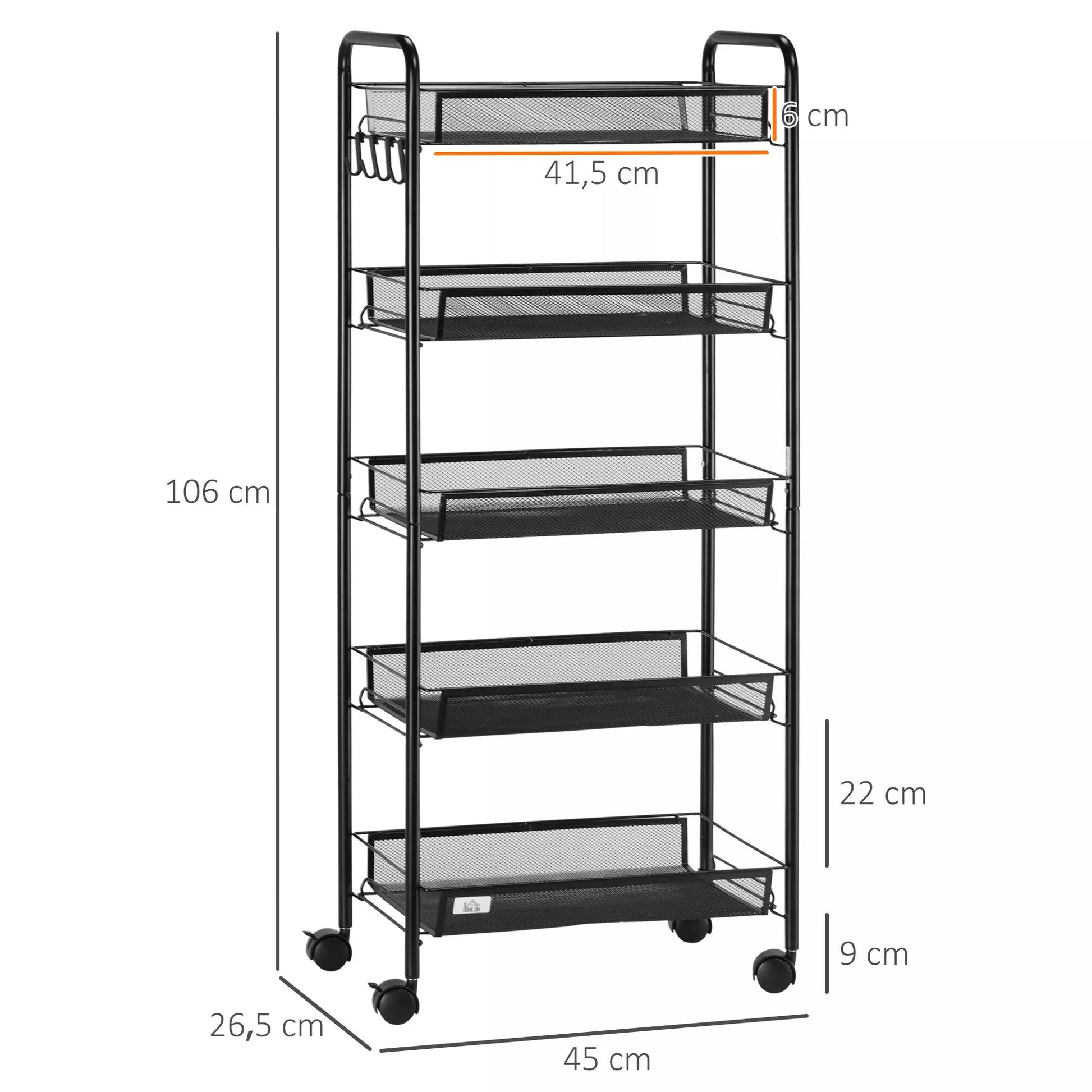 Virtuvės vežimėlis su 5 vieliniais krepšeliais, 4 kabliukais, 4 ratukais, 2 rankenomis, plieno/plastiko, 45x26,5x106 cm, baltas