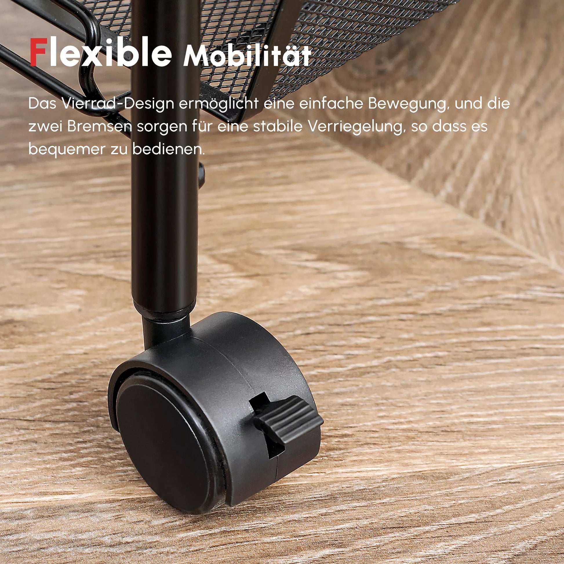 Kompaktiškas ratukų vežimėlis puikiai tinka mažesnėms patalpoms, kurioms reikia papildomos vietos daiktams laikyti. Penkių pakopų virtuvės vežimėlio lentyna suteikia daug vietos aksesuarams ir reikmenims. Su dviem lengvai judančiais rankenomis kampinis vežimėlis gali būti be vargo manevruojamas, o dėl ratukų jį galima pastumti tiksliai ten, kur jis reikalingas.