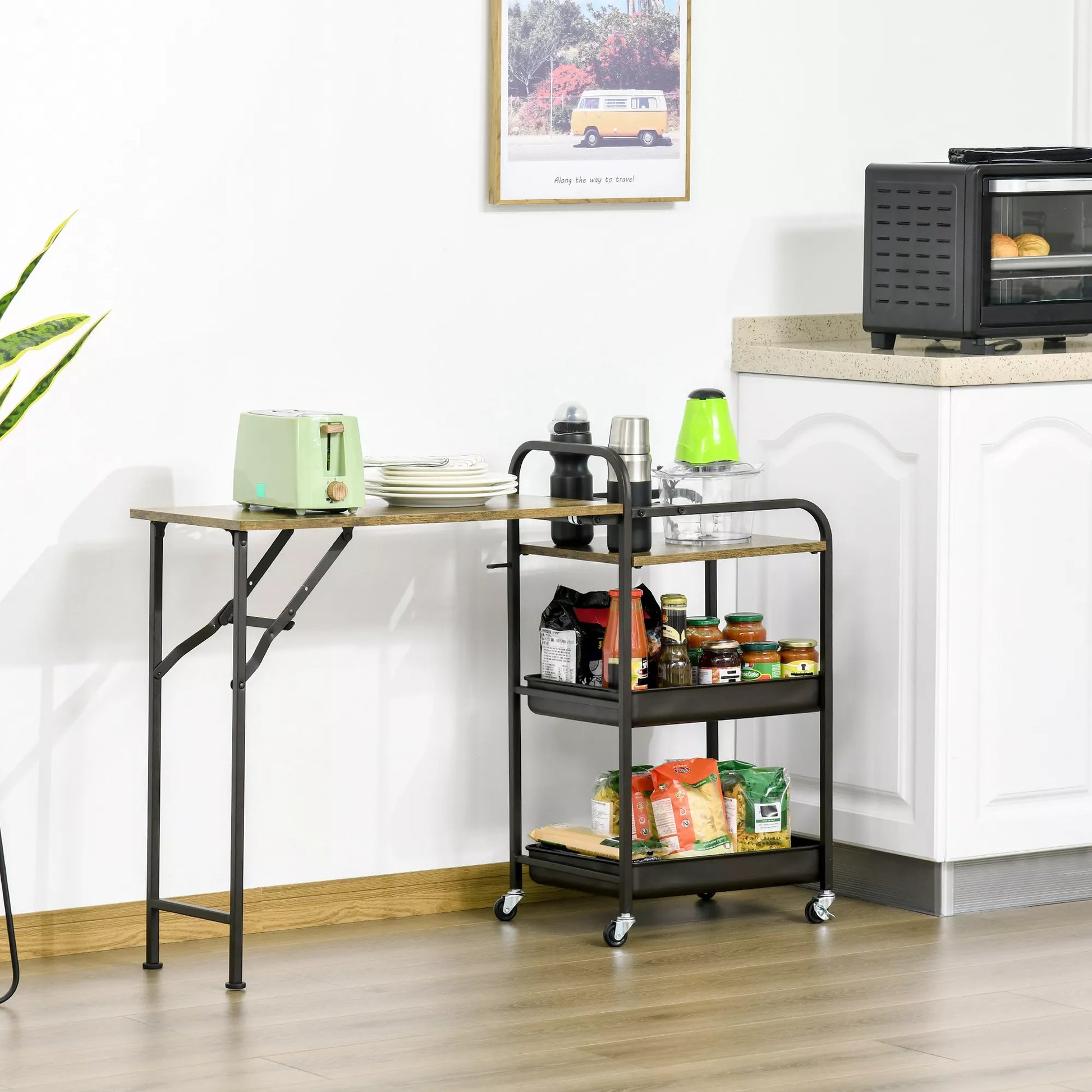 Virtuvės vežimėlis, padėklų vežimėlis, serviravimo vežimėlis su 1 sulankstoma stalvirše, 2 padėklais ir 1 atviru skyriumi, ratukai, reguliuojamos kojelės, E1 medžio drožlių plokštė, metalas, rustiška ruda, 118 x 36,5 x 82 cm