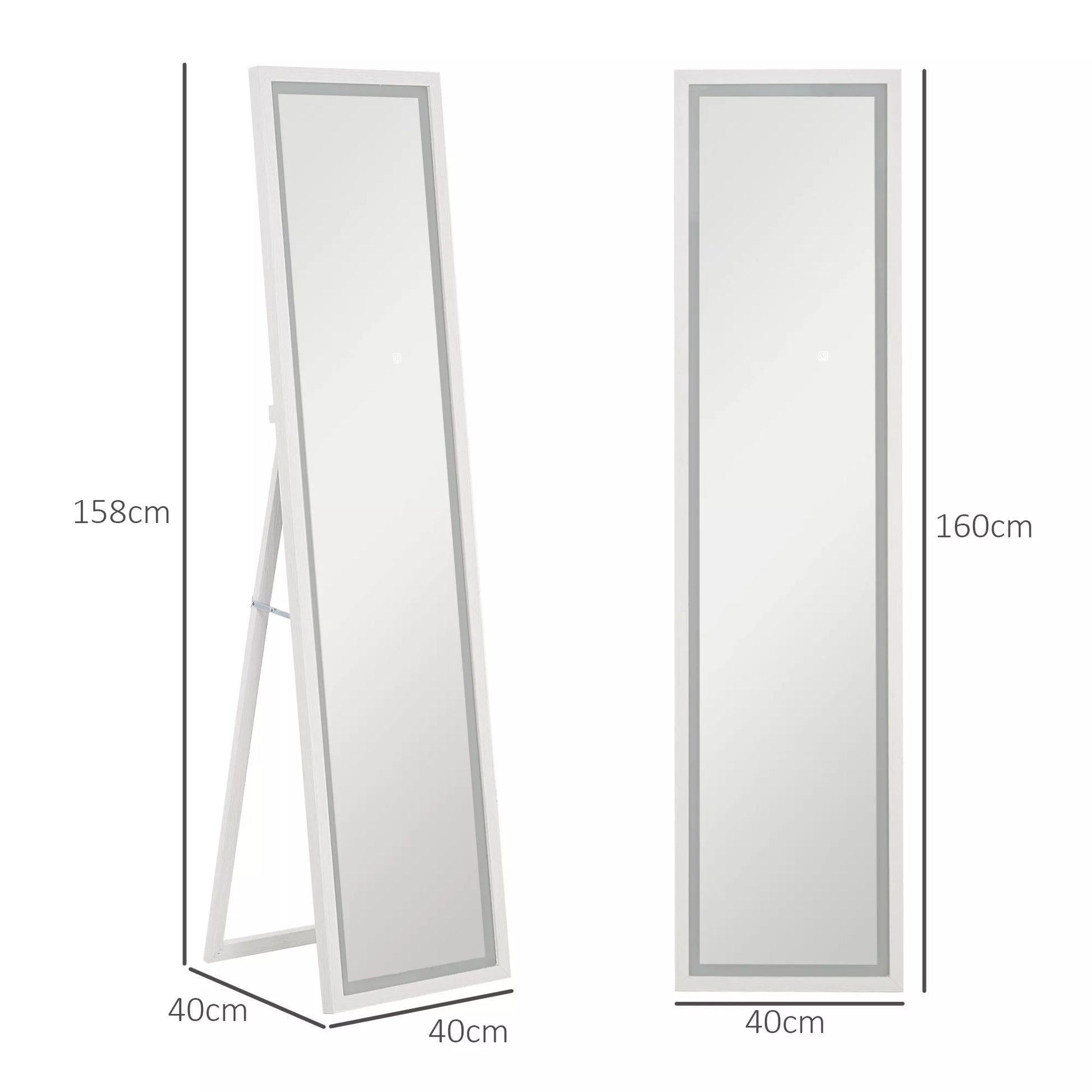 Pilno dydžio veidrodis, 40x160 cm, su LED apšvietimu, jutikliniu valdymu, pritemdomas, 3 spalvos, baltas.