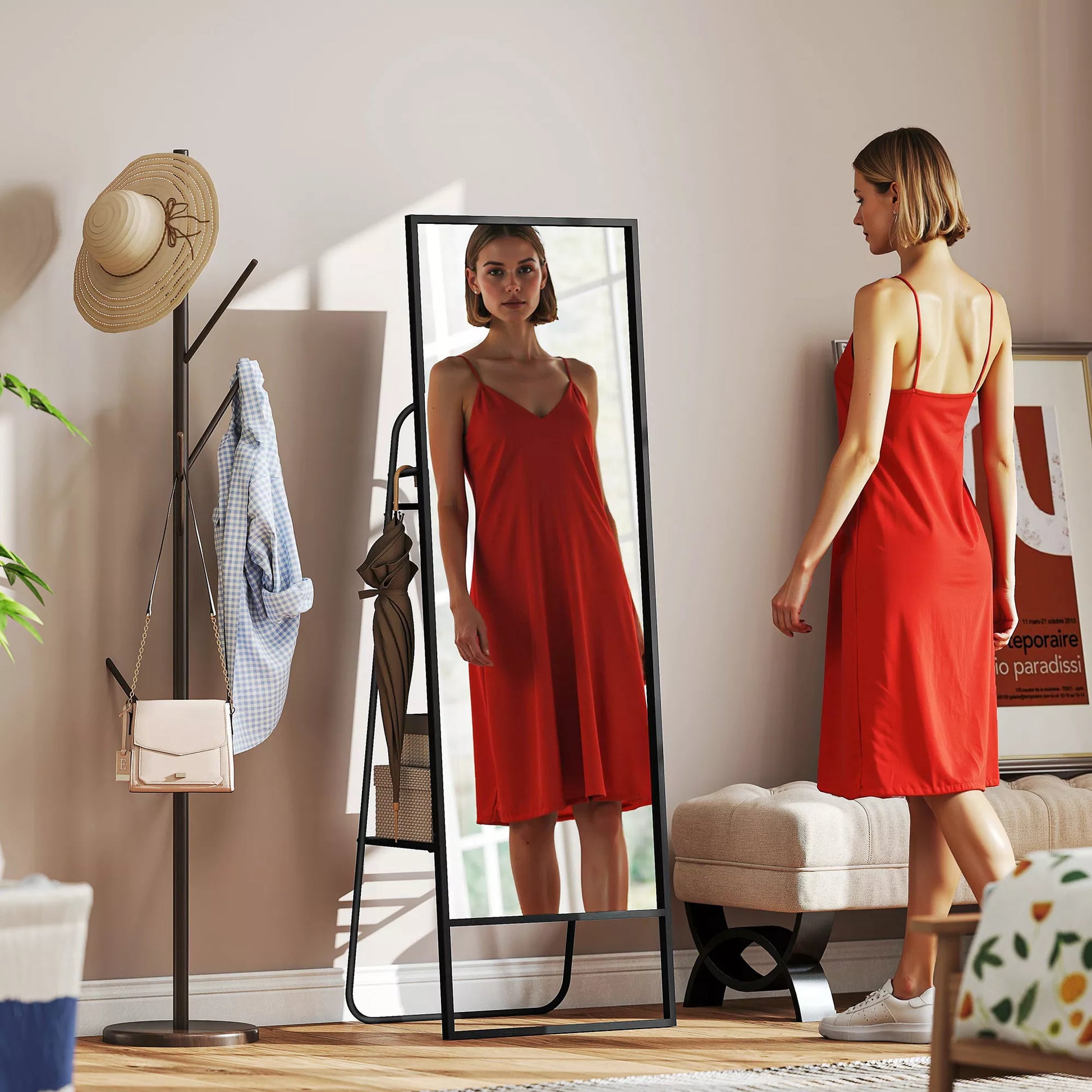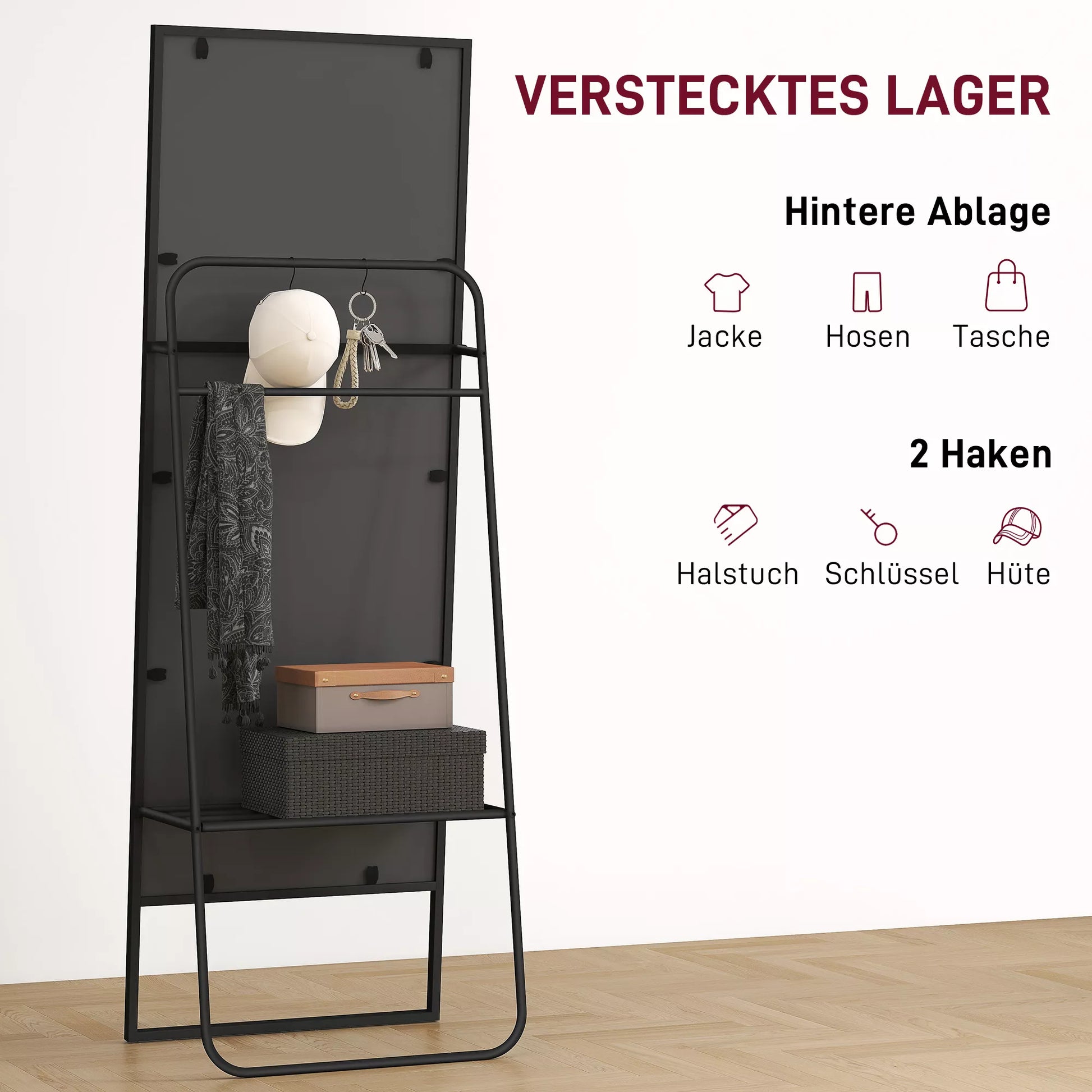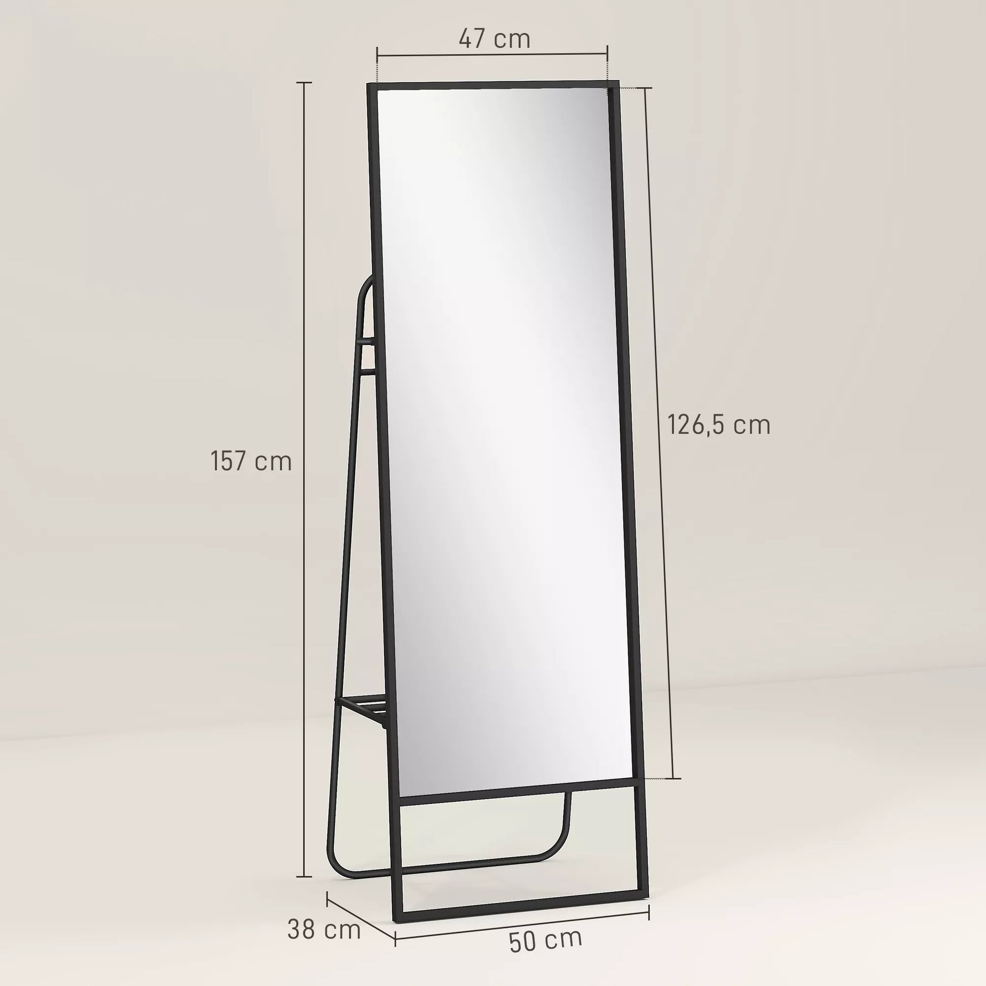 Visą kūną atspindintis veidrodis, pramoninis dizainas, galinė lentynėlė, 2 kabliai, metalinis rėmas, skirtas miegamajam, 157 x 50 cm, juodos spalvos