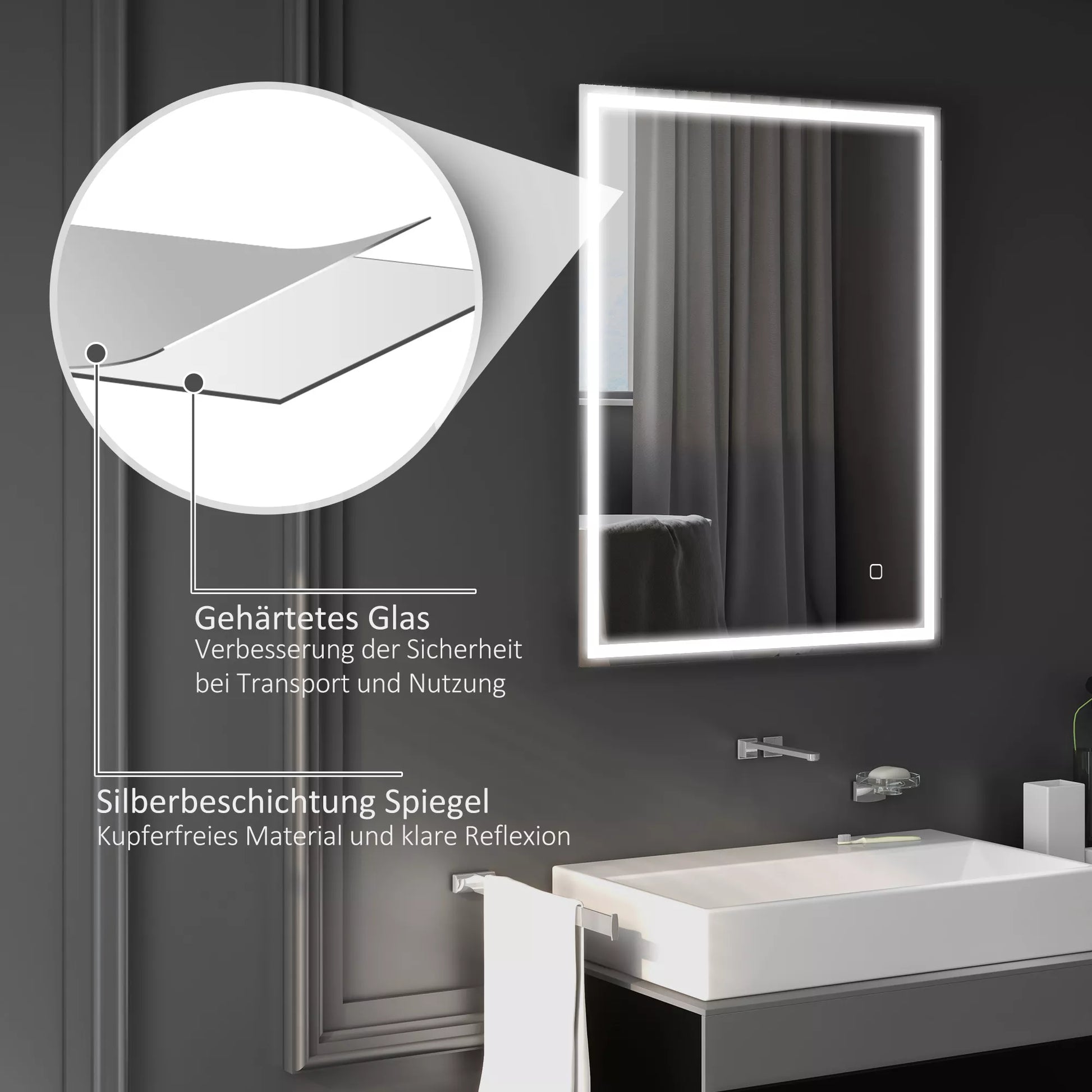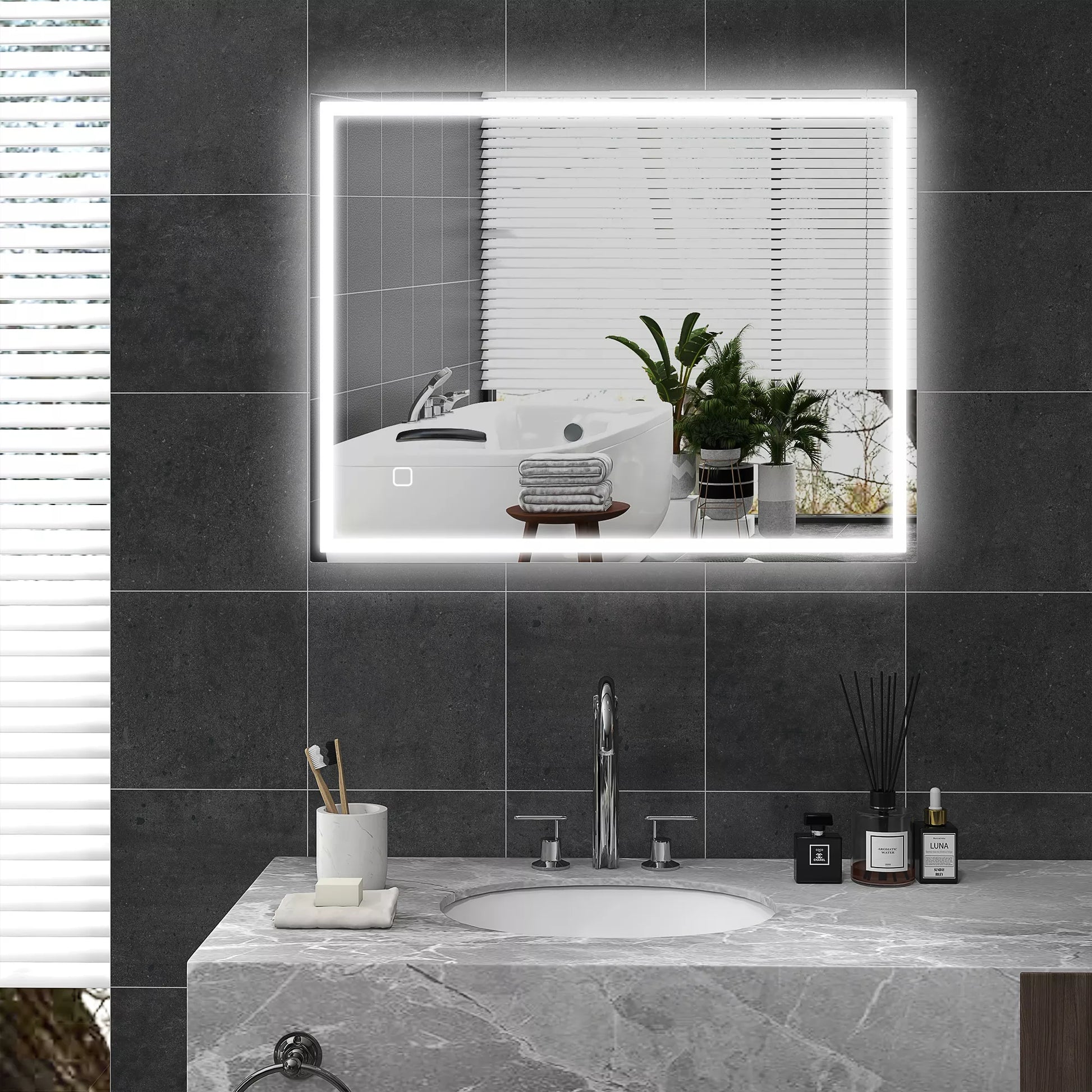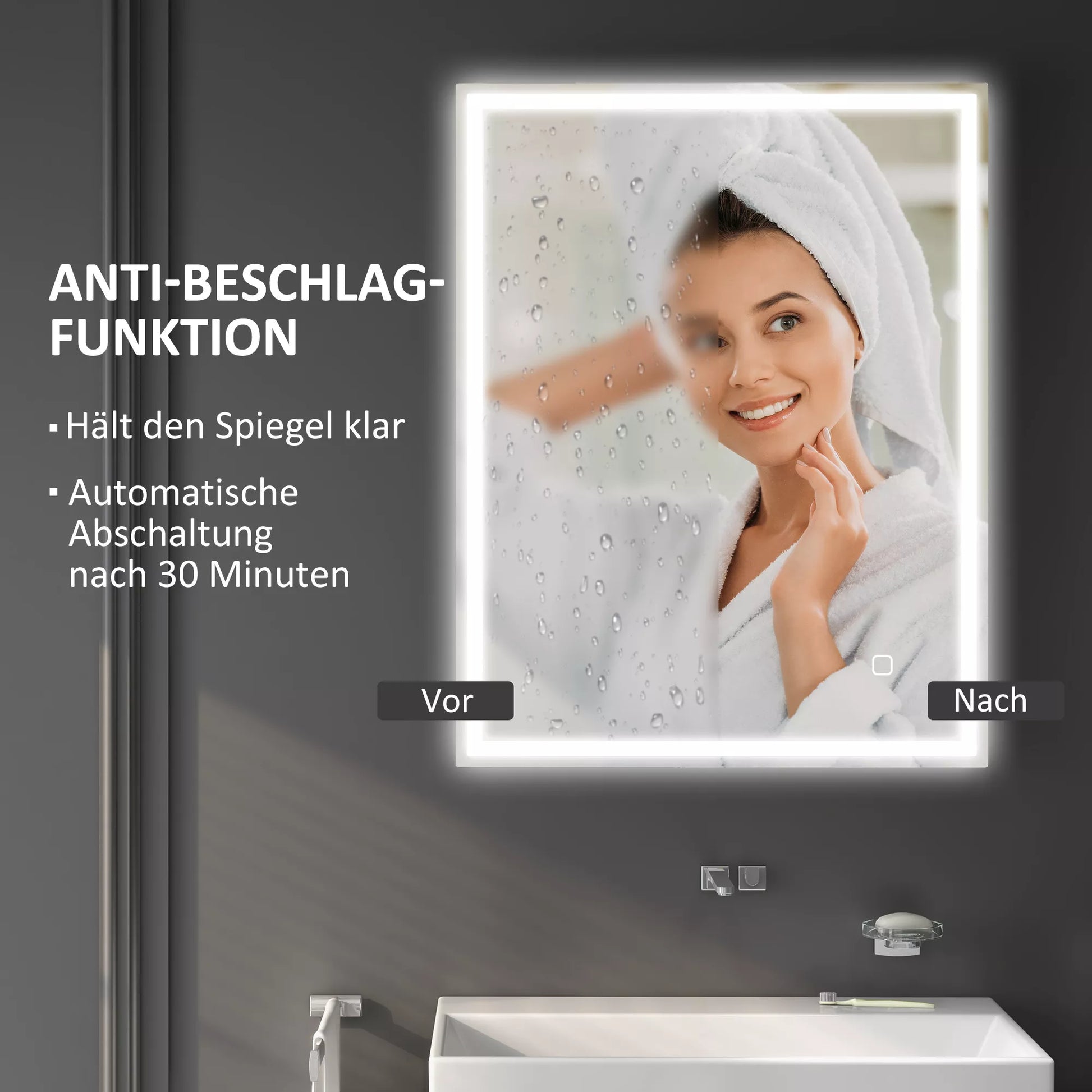 Šis modernus vonios veidrodis su apšvietimu yra daugiau nei tik vonios aksesuaras. Jo elegantiškas dizainas paverčia jį tikru akį traukiančiu elementu. Rėmelis turi reguliuojamą LED apšvietimą. Jutikliniu mygtuku galima reguliuoti ryškumą ir spalvos temperatūrą tarp šiltai baltos, baltos ir šaltai baltos spalvų. Dėl apsaugos nuo rasojimo funkcijos LED vonios veidrodis išlieka skaidrus net ir po dušo, todėl visada galėsite matyti save šiame vonios veidrodyje.