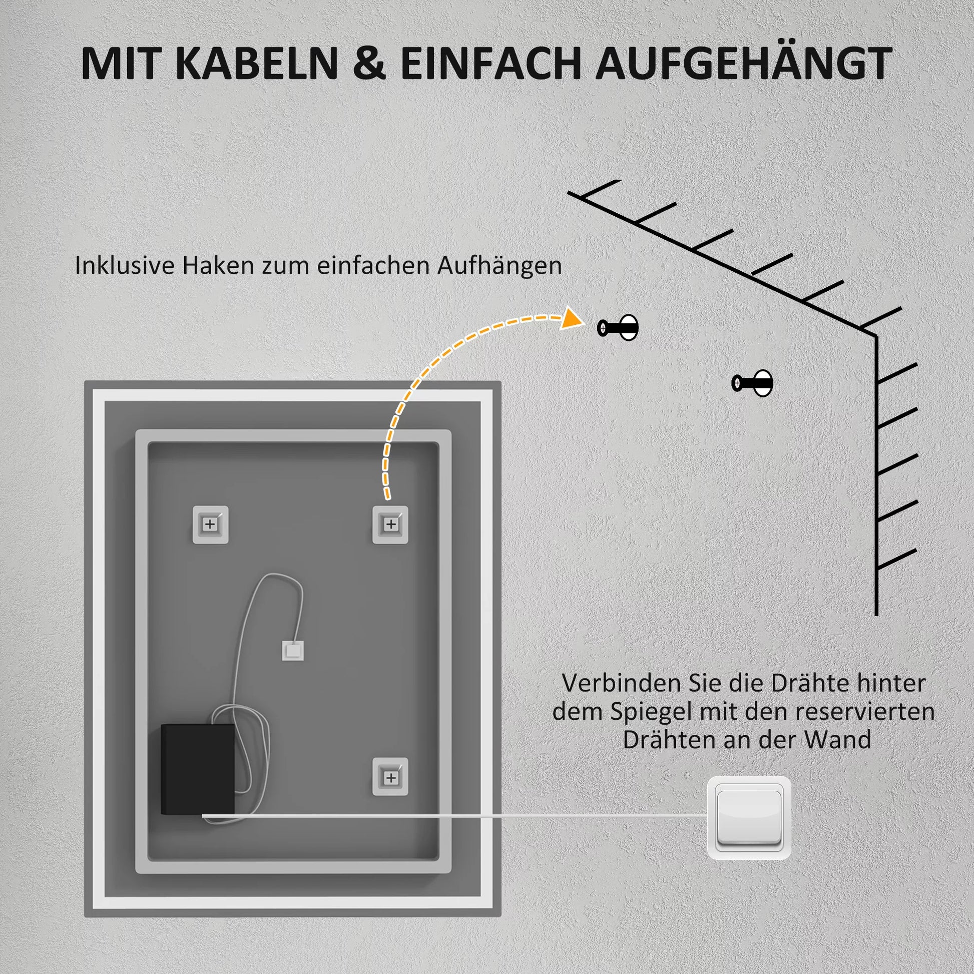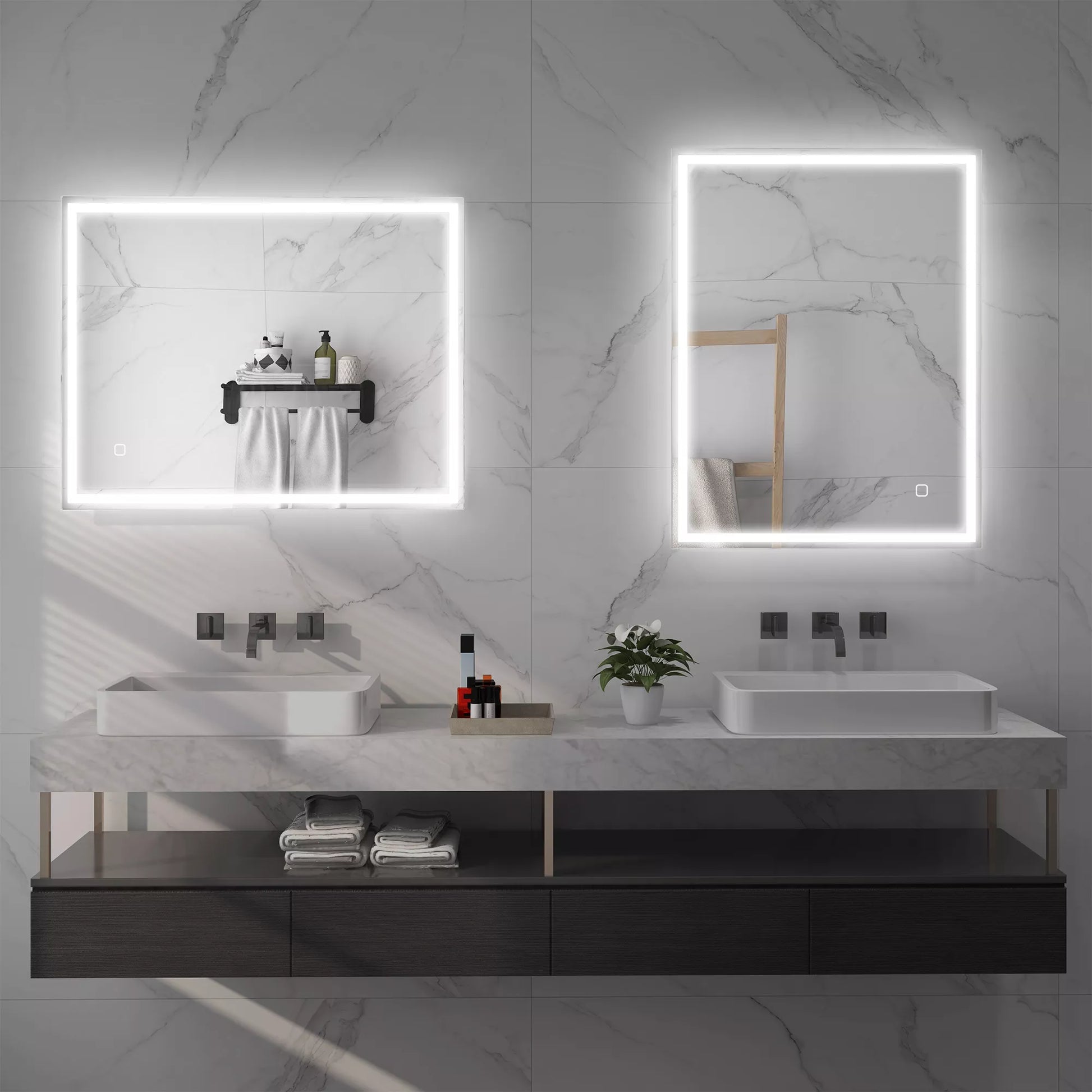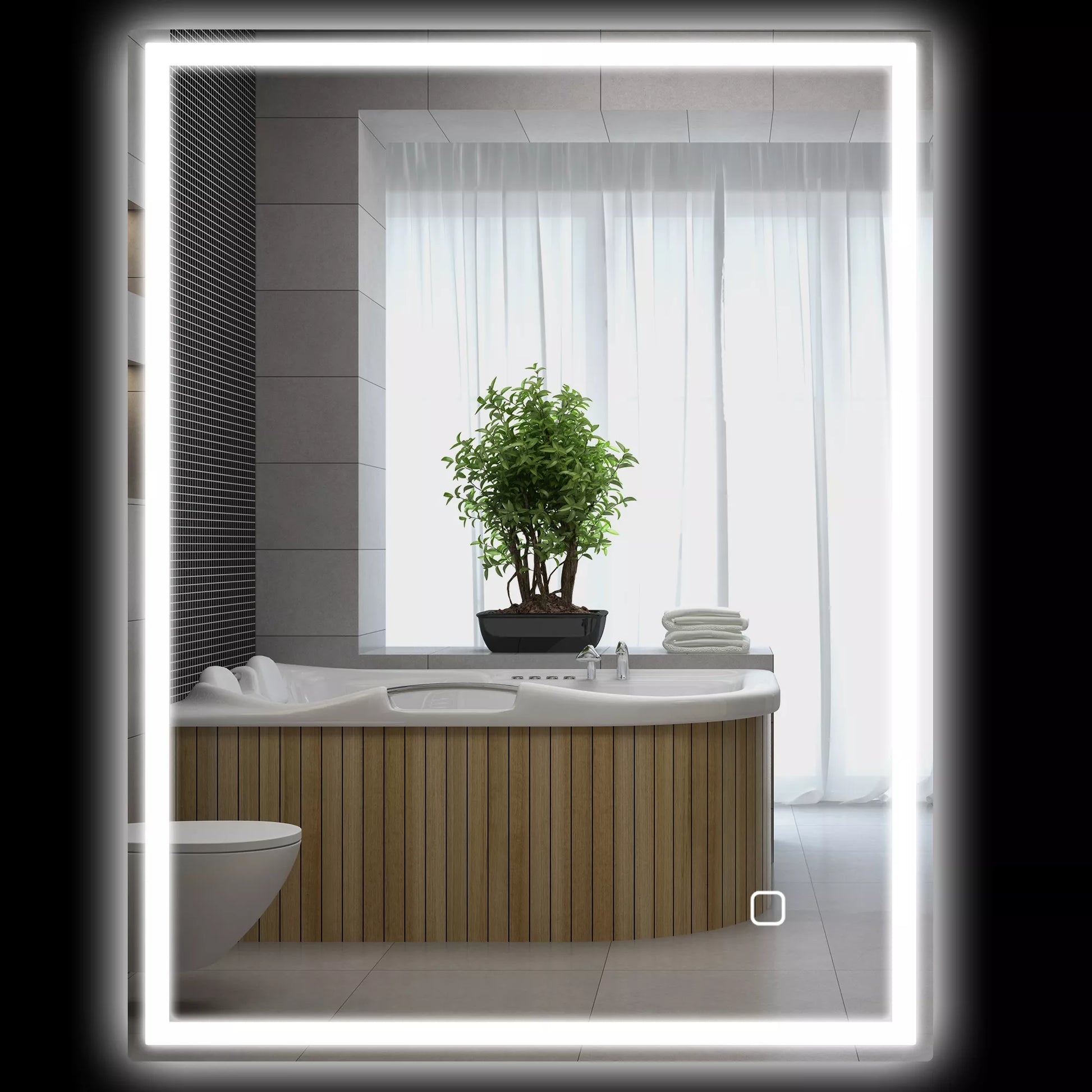 Šis modernus vonios veidrodis su apšvietimu yra daugiau nei tik vonios aksesuaras. Jo elegantiškas dizainas paverčia jį tikru akį traukiančiu elementu. Rėmelis turi reguliuojamą LED apšvietimą. Jutikliniu mygtuku galima reguliuoti ryškumą ir spalvos temperatūrą tarp šiltai baltos, baltos ir šaltai baltos spalvų. Dėl apsaugos nuo rasojimo funkcijos LED vonios veidrodis išlieka skaidrus net ir po dušo, todėl visada galėsite matyti save šiame vonios veidrodyje.