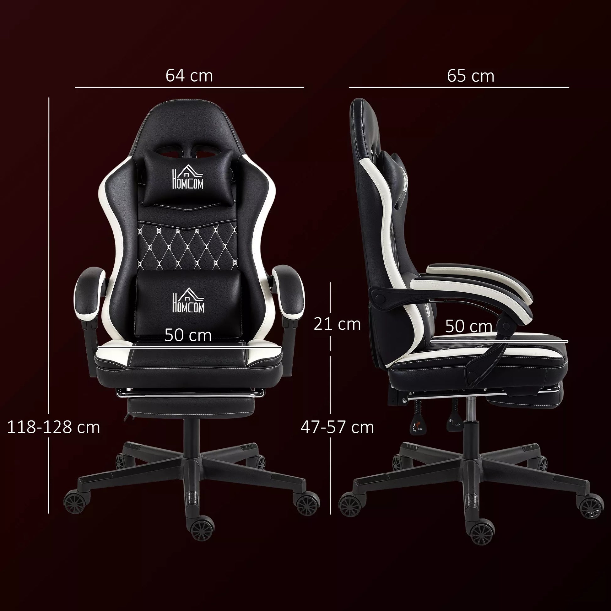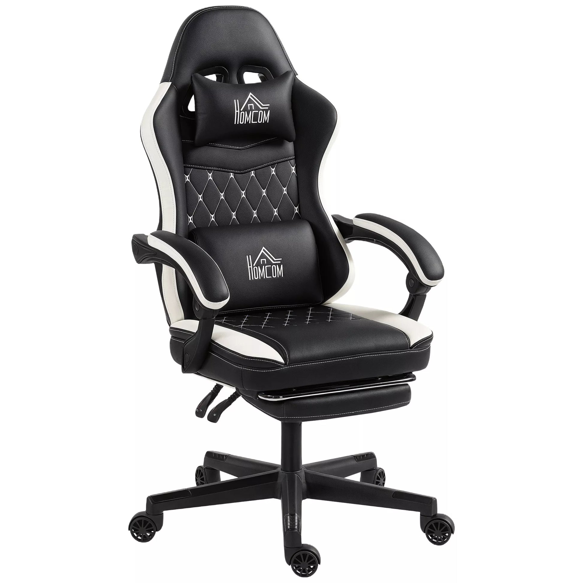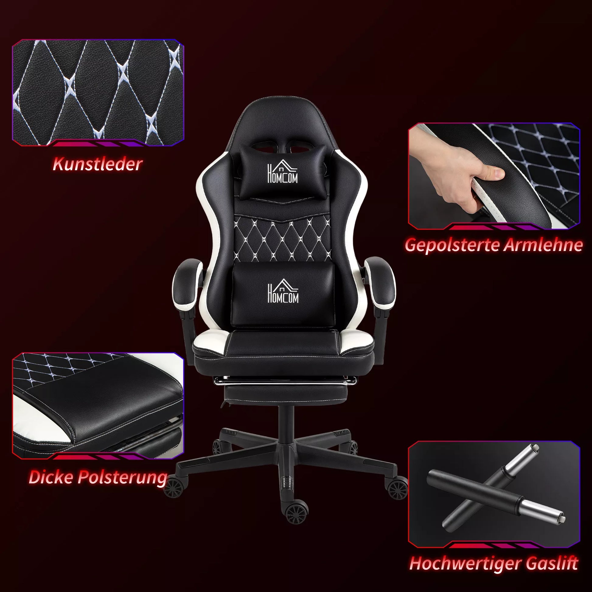 Žaidimų kėdė su atrama kojoms, kompiuterio kėdė su atrama galvai ir pagalve, dirbtinės odos apmušalas, sukiojama, reguliuojamo aukščio, metalas, plastikas, juoda + balta