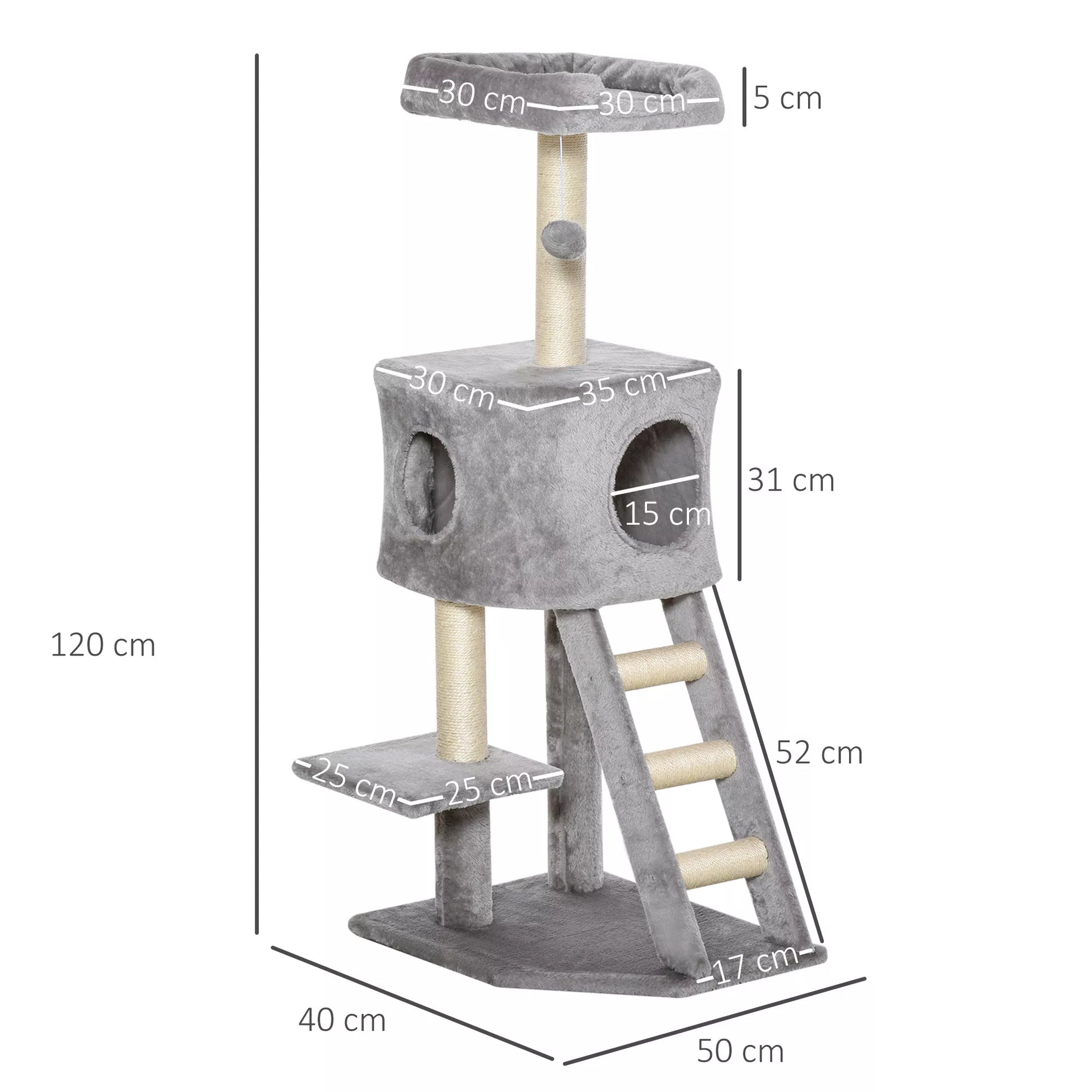 Kačių medis 120 cm, Kačių bokštas su urveliu, žaisliniu kamuoliuku, sizaliniais stiebais, platforma, laipteliais, daugiaaukštis kačių draskytuvas, laipiojimo medis katėms, šviesiai pilkas