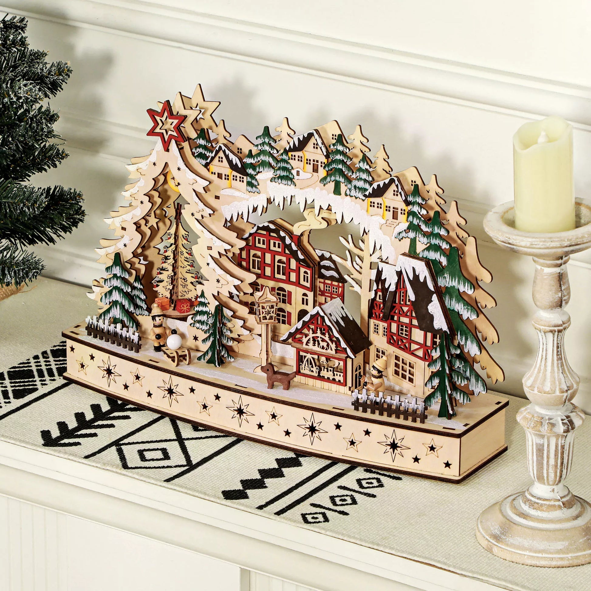 Kalėdinis kaimelis žiemos stebuklų šalyje, 20 LED lempučių, daugiasluoksnis, natūralaus medžio, 45 x 12 x 30 cm