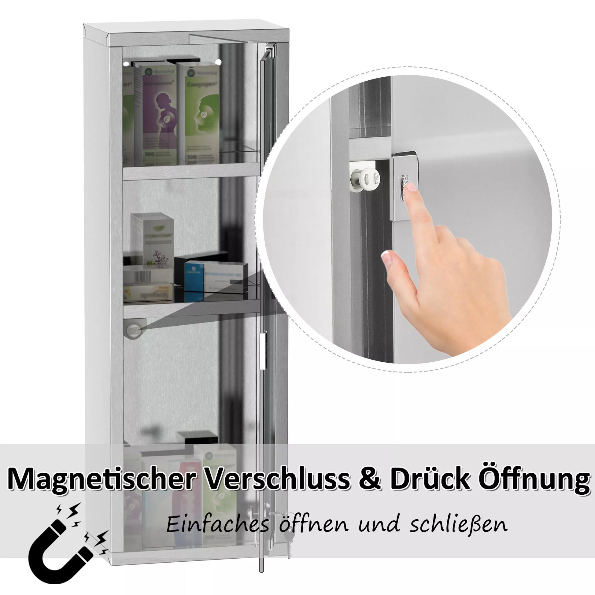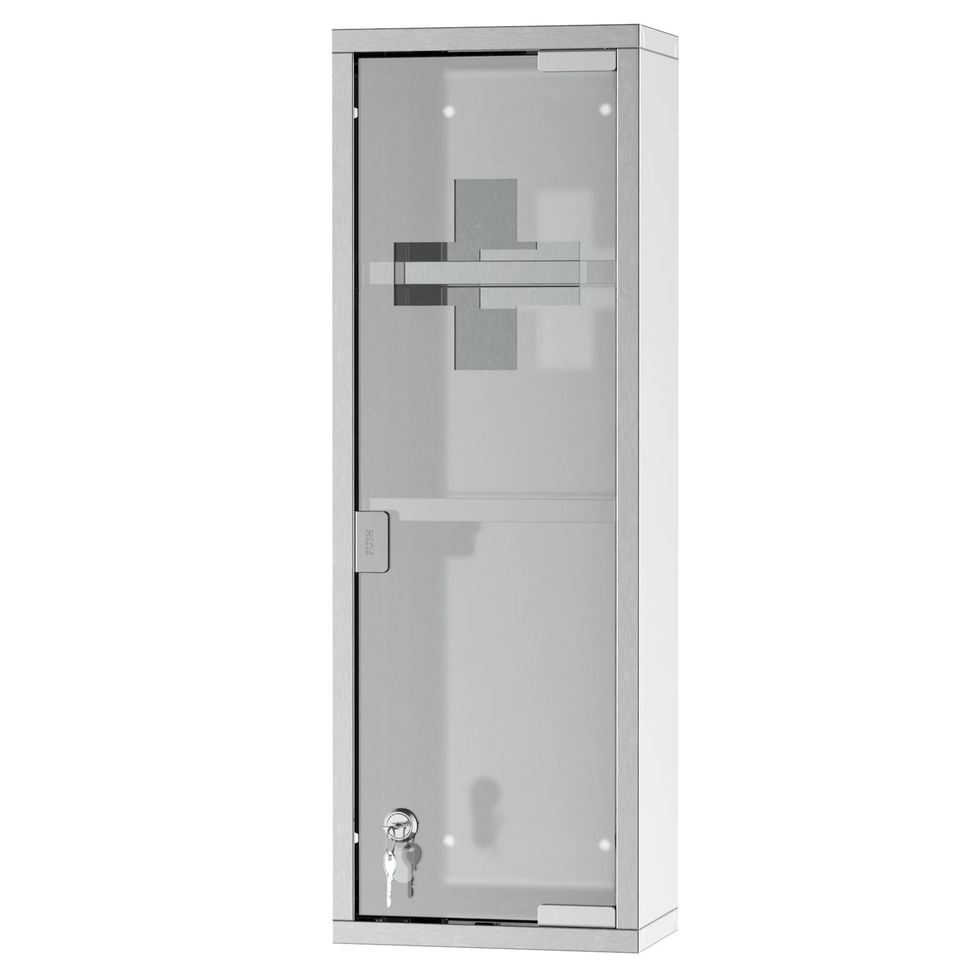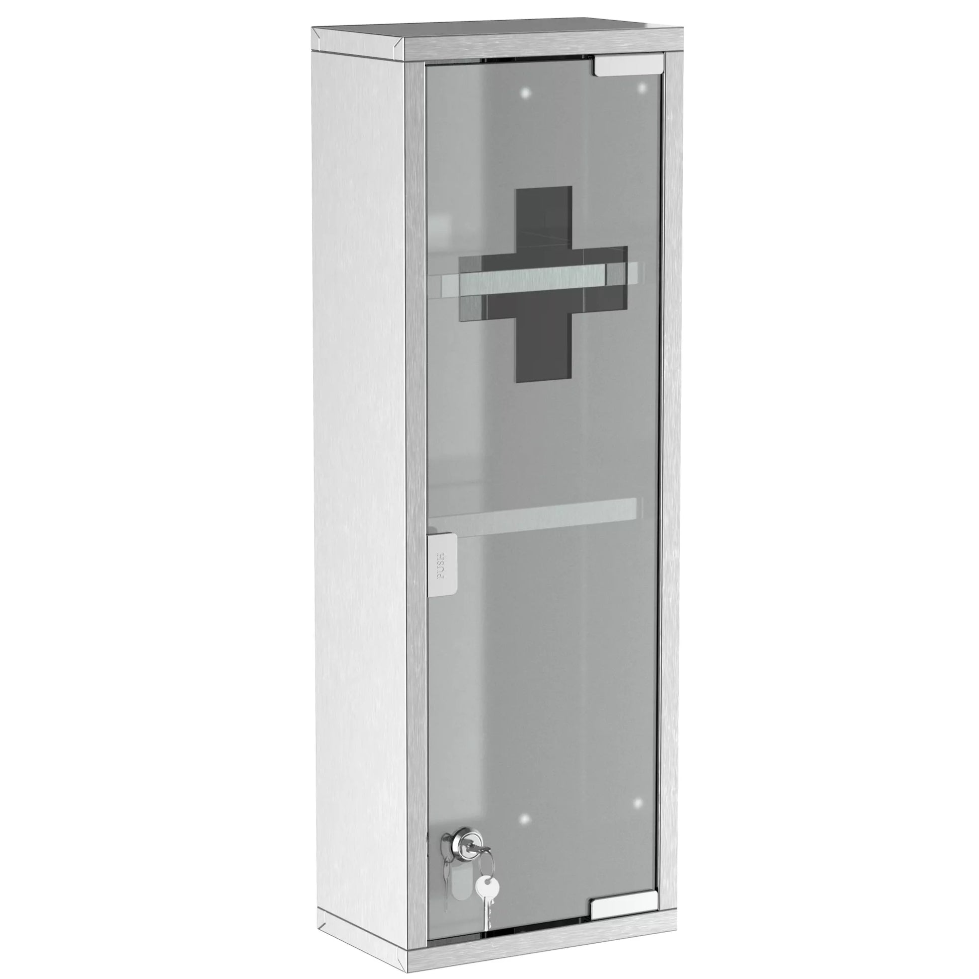 Nerūdijančio plieno vaistų spintelė su grūdinto stiklo durelėmis. Medikamentų laikymo spintelė, užrakinama, su 3 skyreliais, pirmosios pagalbos spintelė, 20 x 12 x 58 cm, sidabrinė