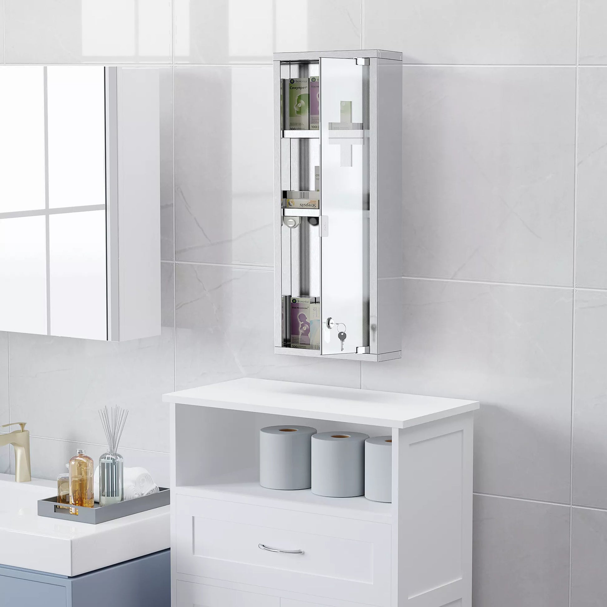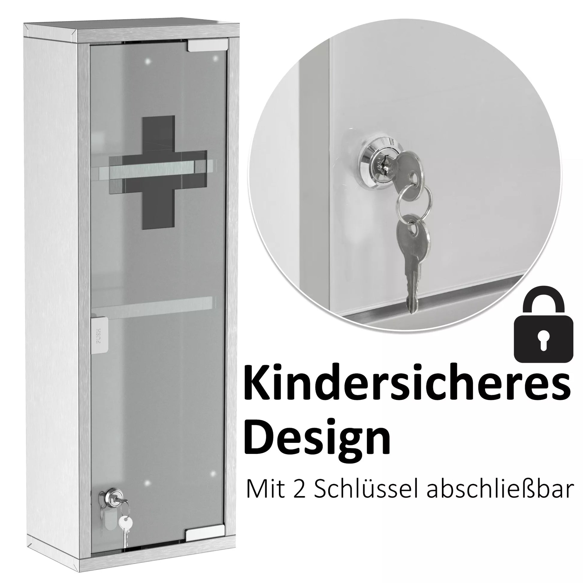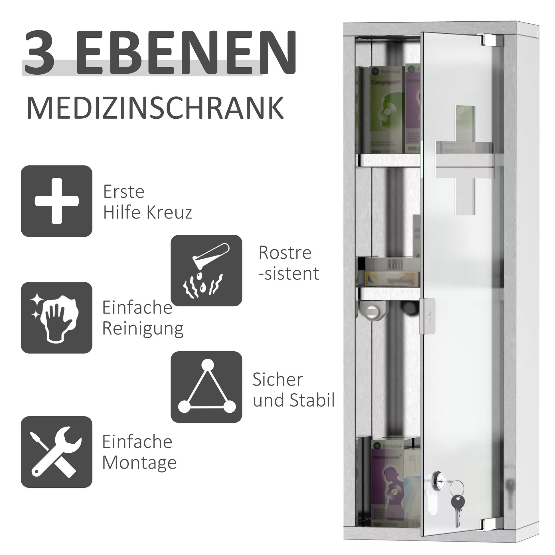 Nerūdijančio plieno vaistų spintelė su grūdinto stiklo durelėmis. Medikamentų laikymo spintelė, užrakinama, su 3 skyreliais, pirmosios pagalbos spintelė, 20 x 12 x 58 cm, sidabrinė