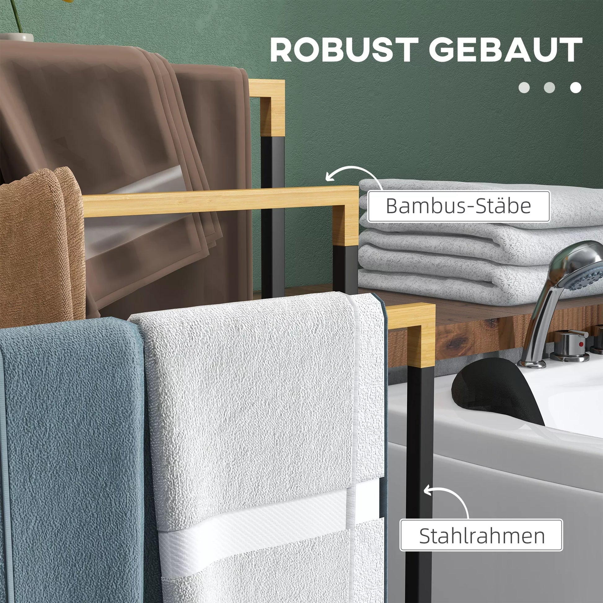 Pakabinkite rankšluosčius ant šio praktiško, 3 strypų rankšluosčių laikiklio . Rankšluosčių laikiklis pagamintas iš tvirto bambuko ir metalo, suteikiančio natūralią išvaizdą, ir tinka kasdieniam naudojimui, o jo strypai pagaminti iš tvirto, lengvai valomo bambuko. Dėl laisvai pastatomo dizaino jį galima statyti šalia dušo, vonios ar bet kurioje kitoje vietoje.