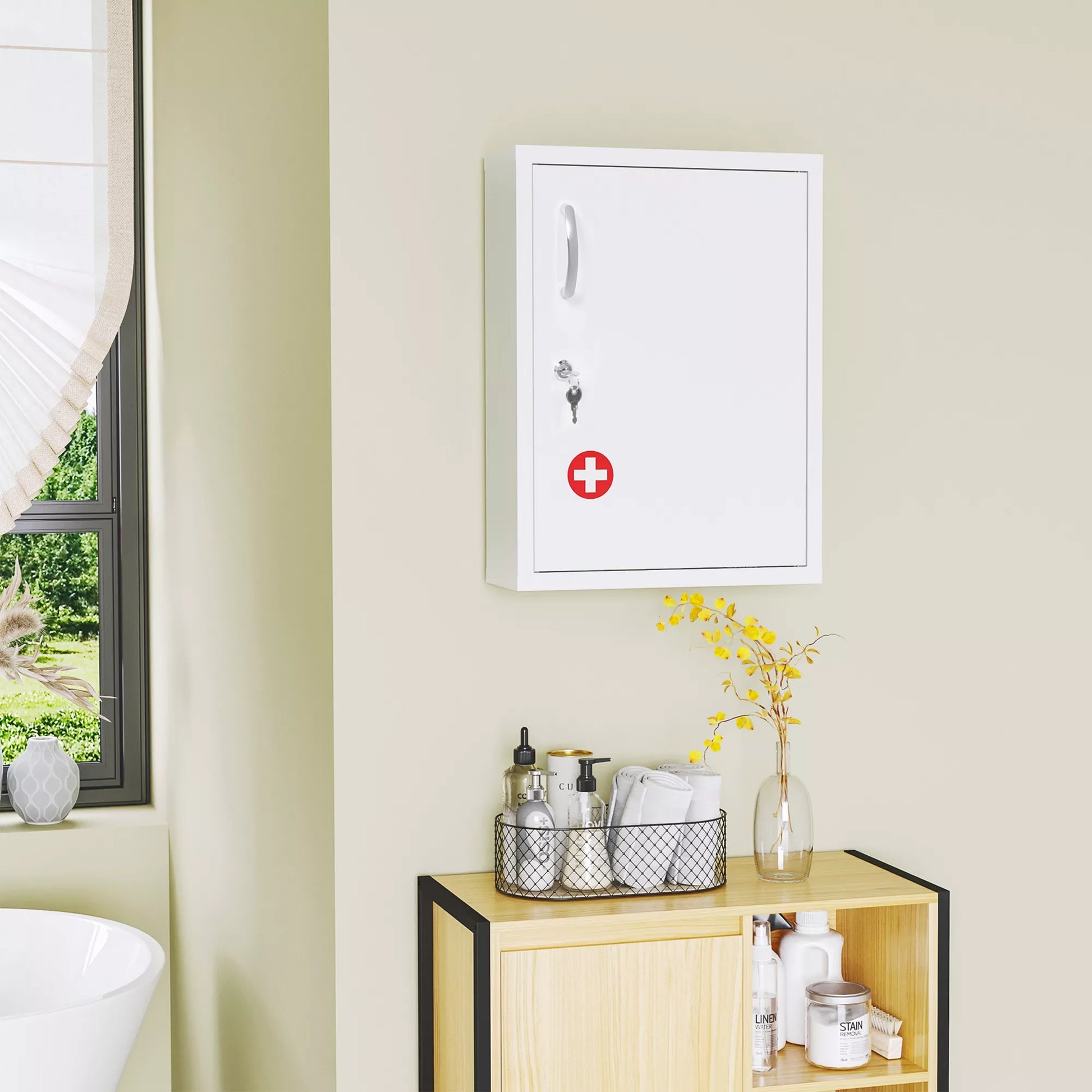 Kad šeimos su vaikais ir naminiais gyvūnais visada turėtų po ranka medicininius receptus ir vaistus, šis [Brand Name] vaistinėlės spintelė yra būtinas kiekvienuose namuose! Ši vaistų spintelė suteikia trijų lygių laikymo vietos, leidžiančios aiškiai sutvarkyti ir atskirti vaistus. Pirmoji pagalba kryžiaus lipdukas yra priekinėje pusėje, todėl avarijos atveju jį lengva pastebėti.
