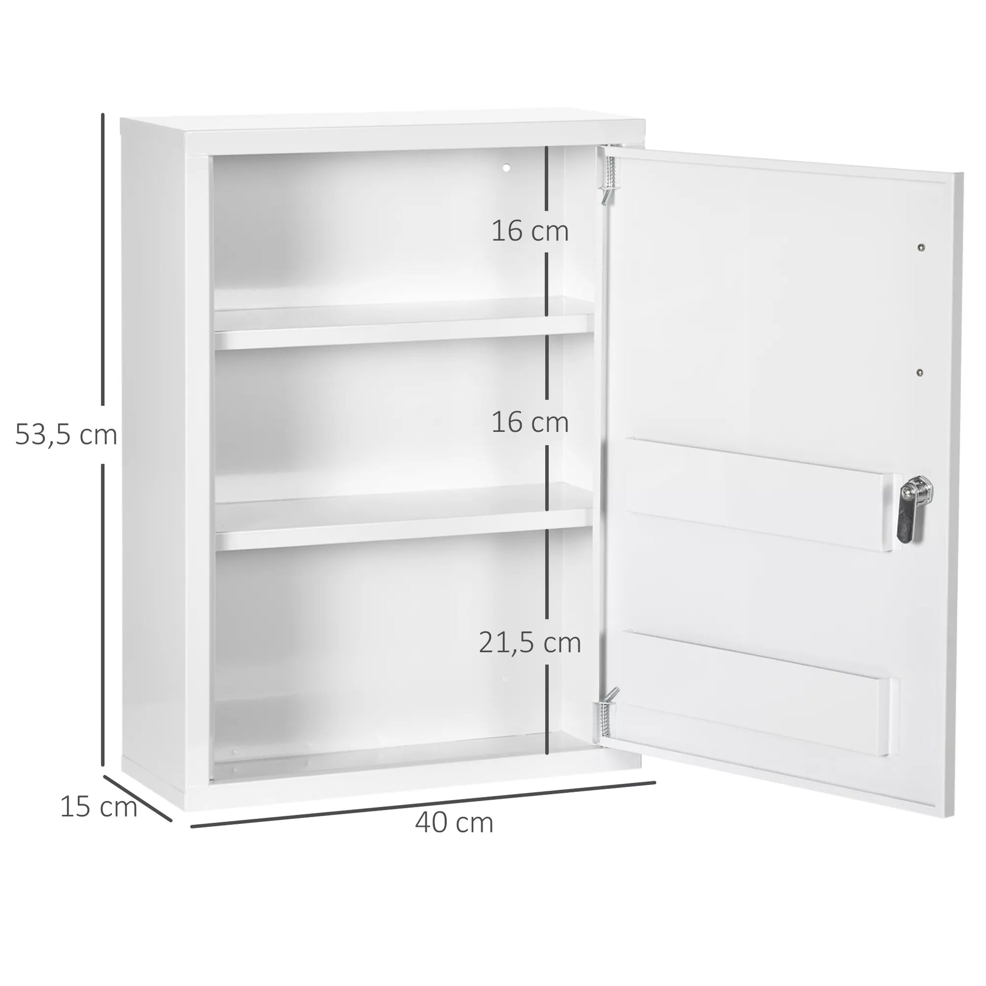 Vaistinėlė, 3 skyriai, rakinama, su skyriumi receptams, tvirtas plieninis korpusas, balta, 40 x 15 x 53,5 cm