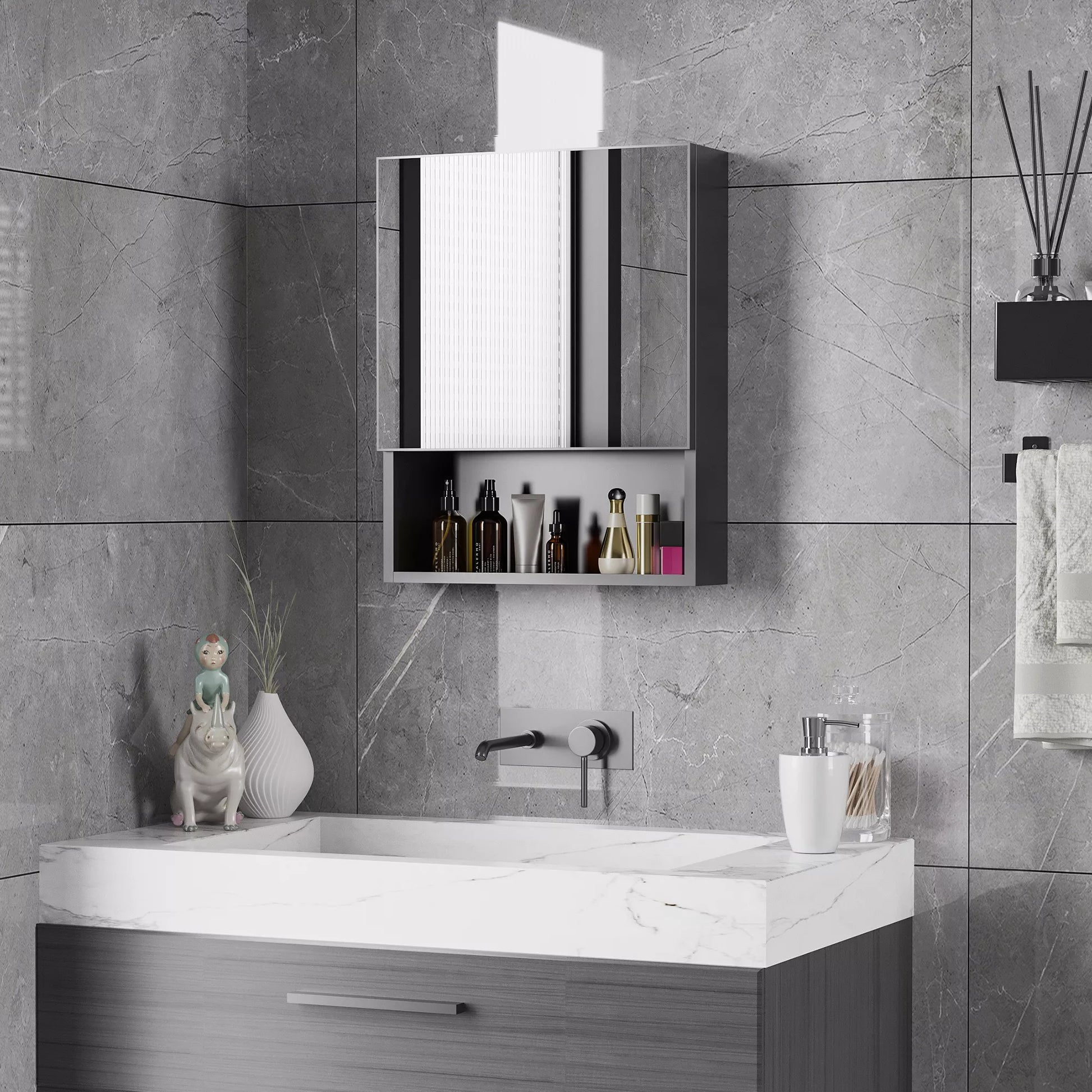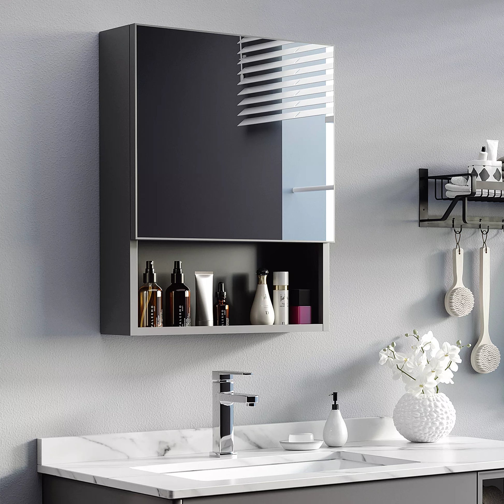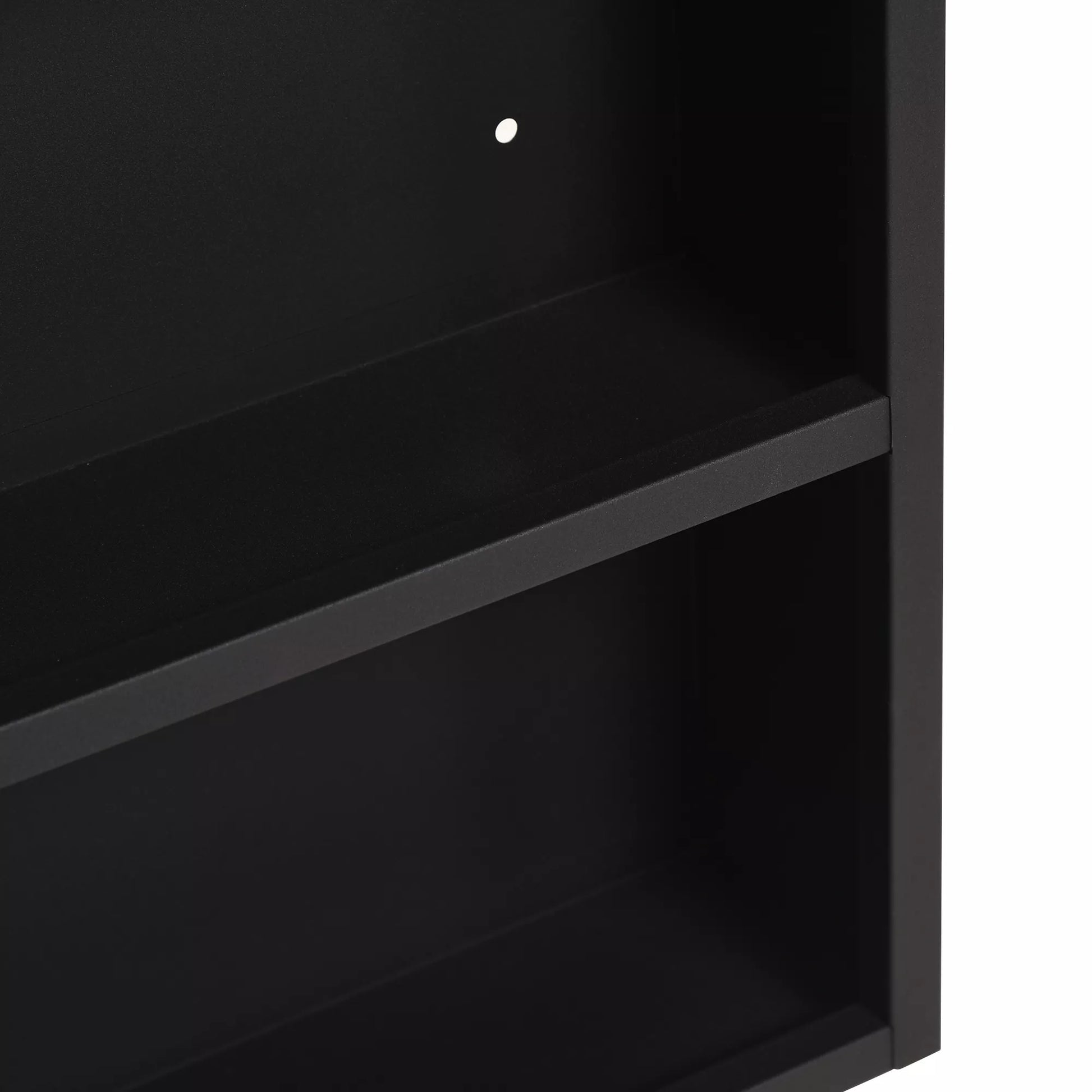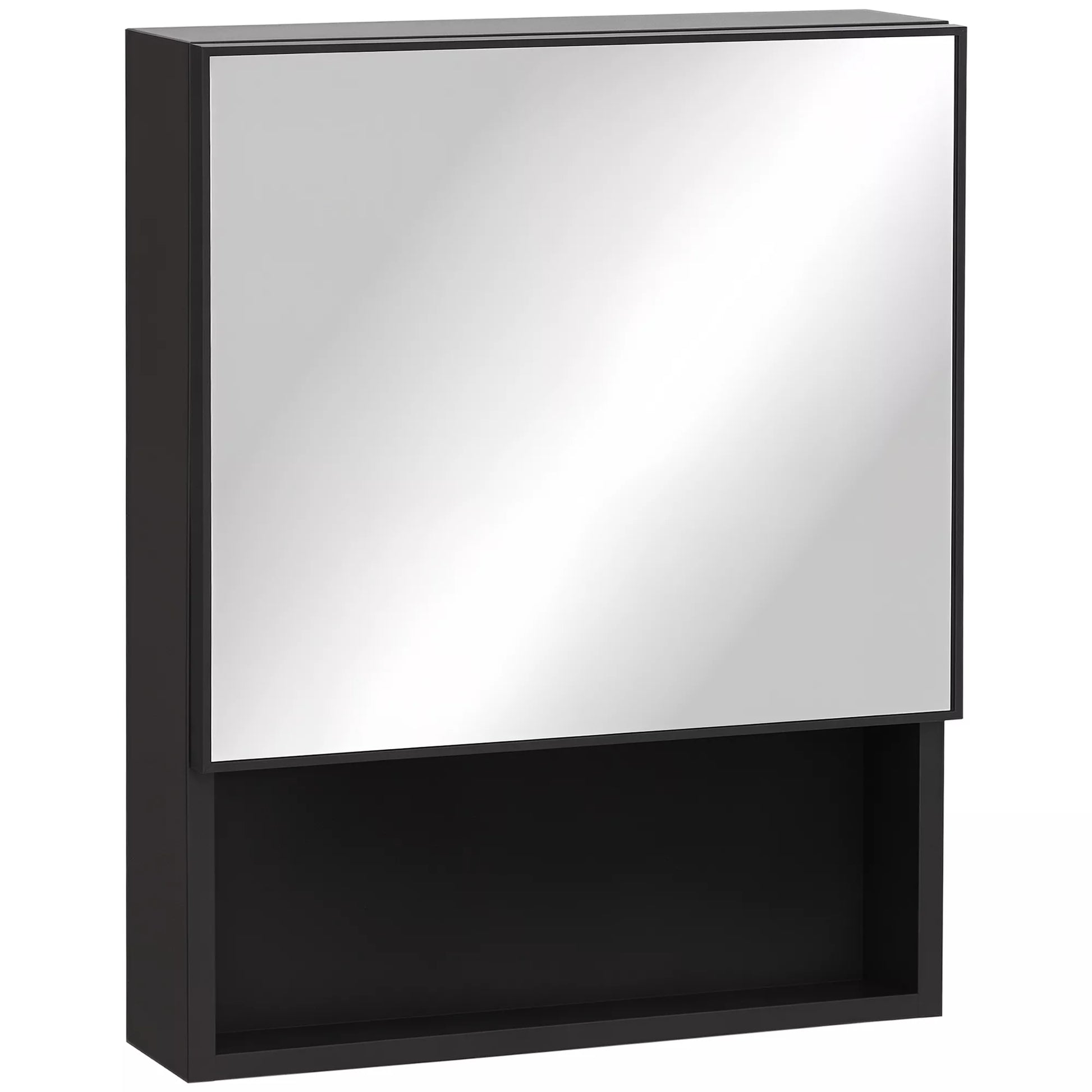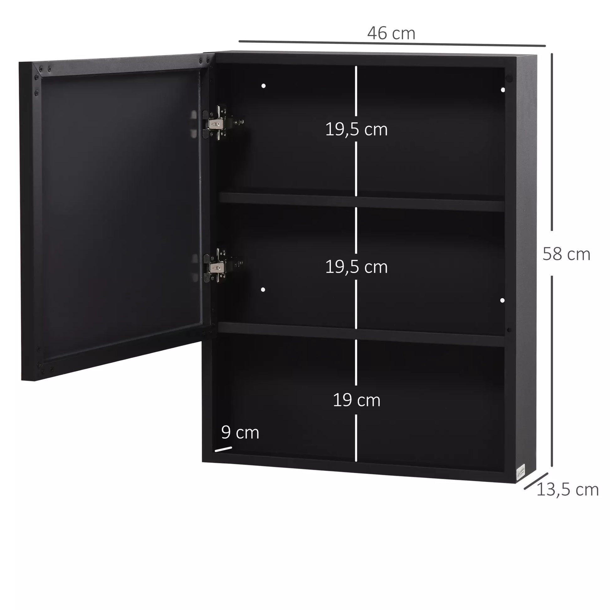 Veidrodinė spintelė, 2 vidinės lentynos, atvira lentynų niša, plieninis korpusas, juoda, 46 x 13,5 x 58 cm