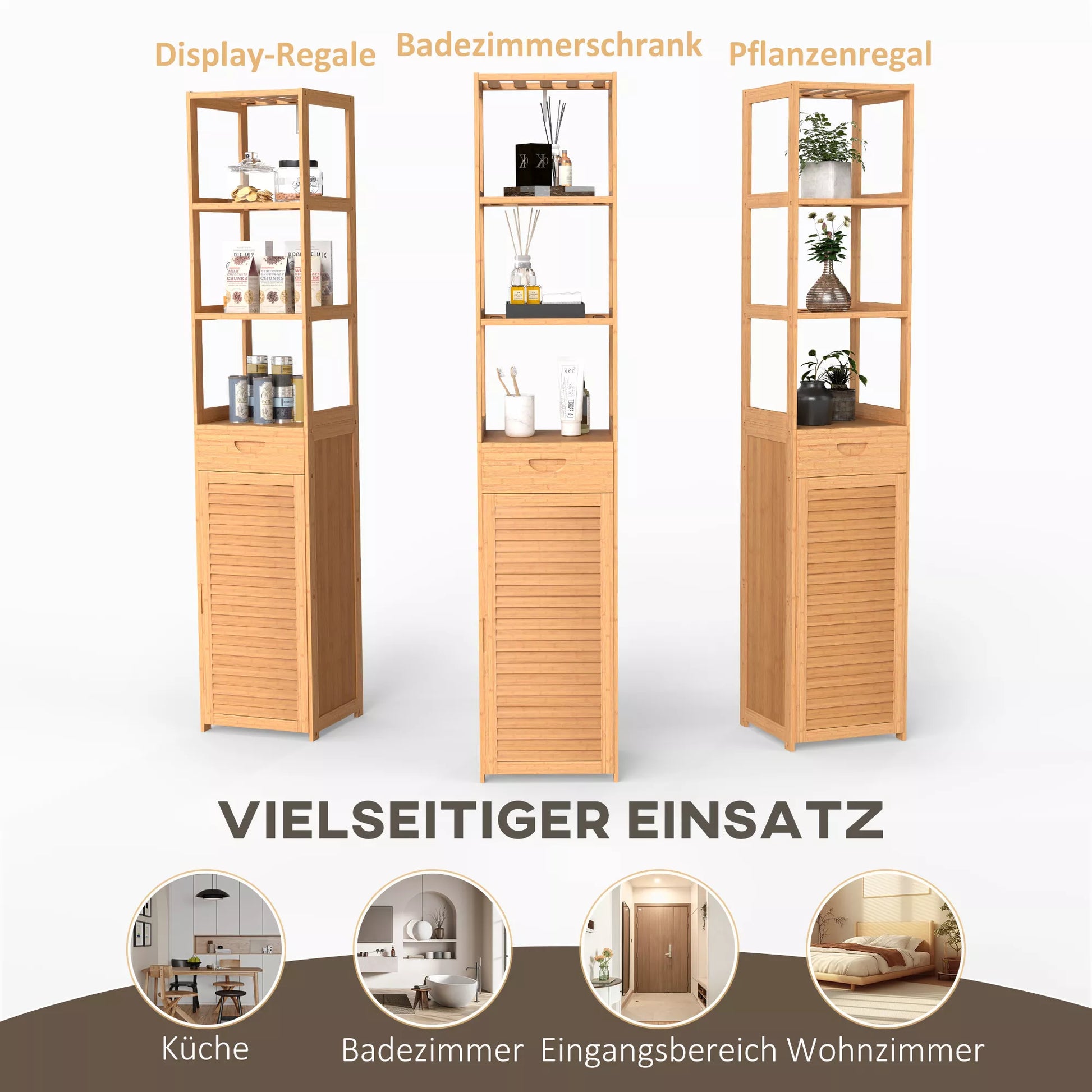 Vonios lentyna su 3 atviromis lentynomis, stalčiumi, lamelių tipo durelėmis, bambukas, 32 x 30 x 163 cm