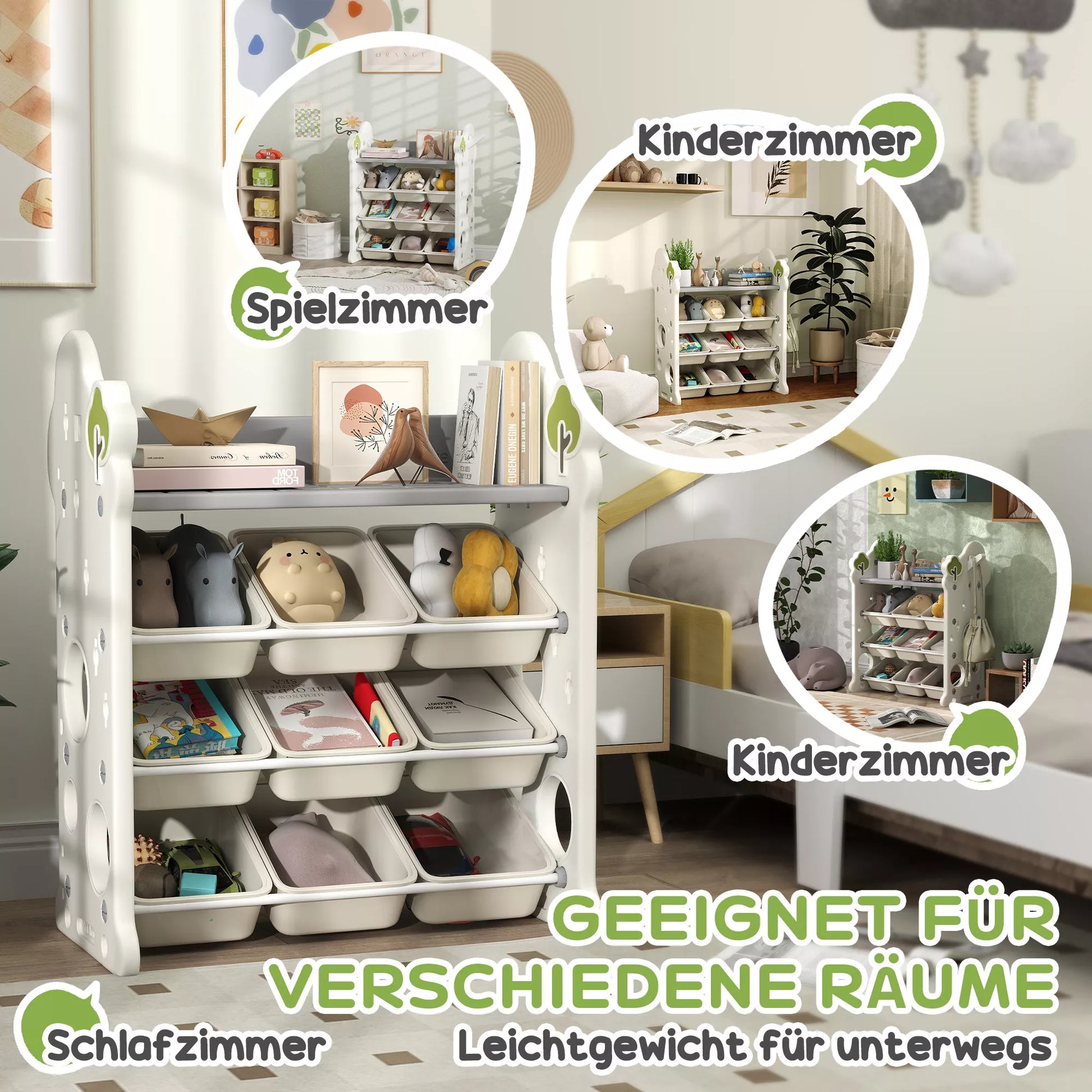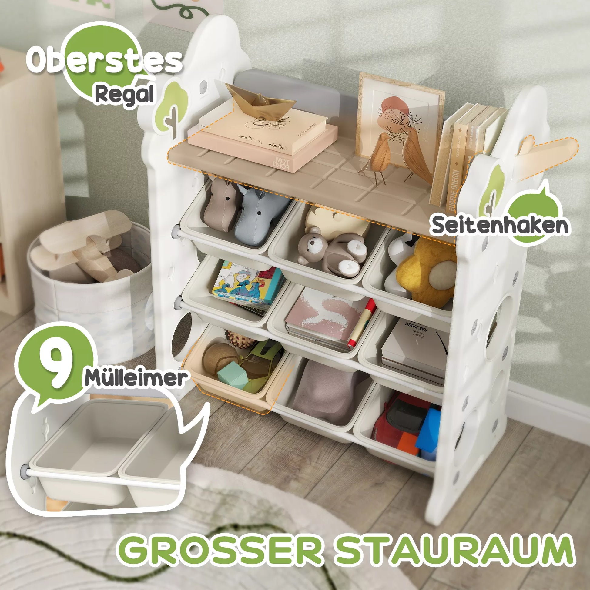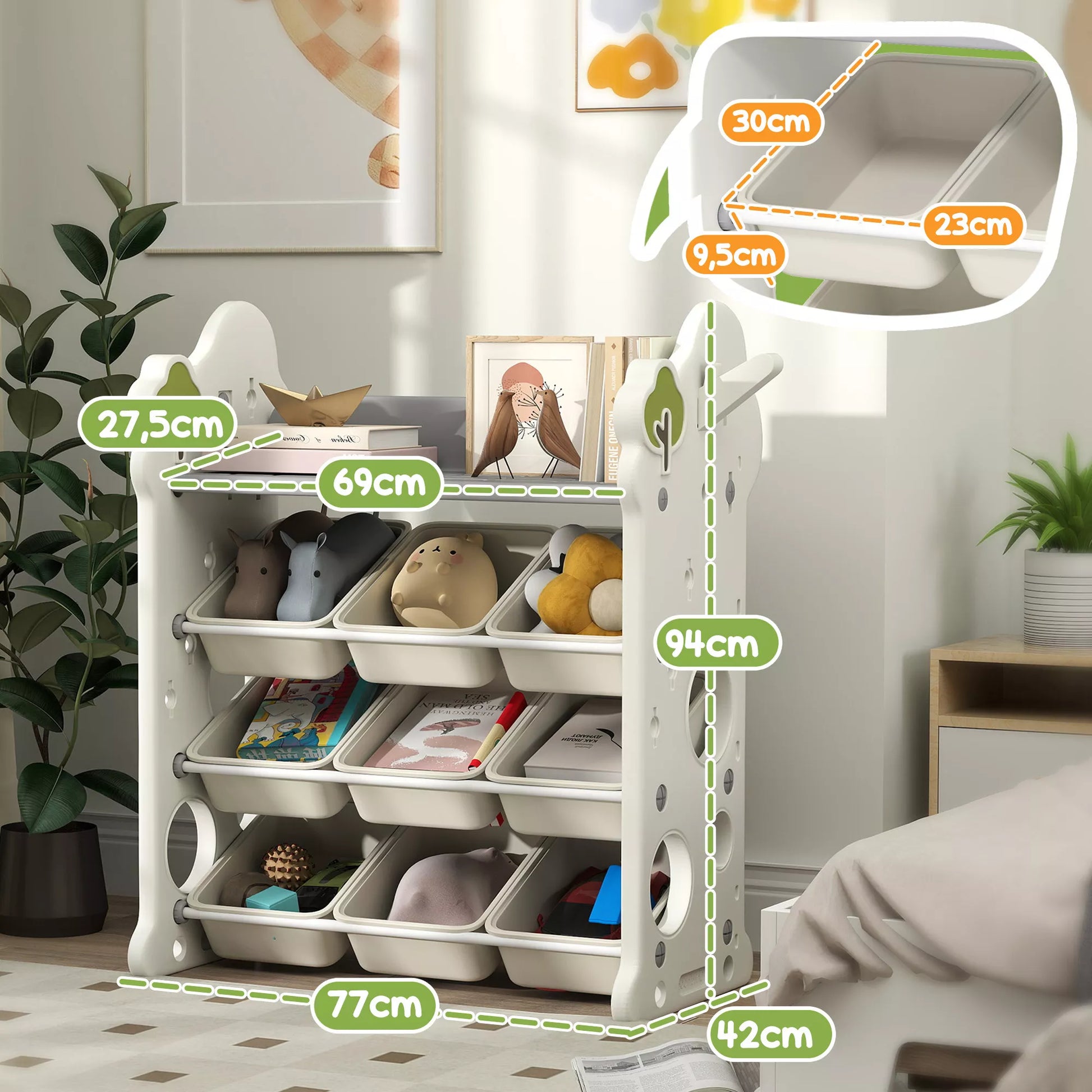 - ✔ Viršutinė lentyna ir devyni konteineriai padeda sutvarkyti žaislus, knygas ir kitus daiktus
