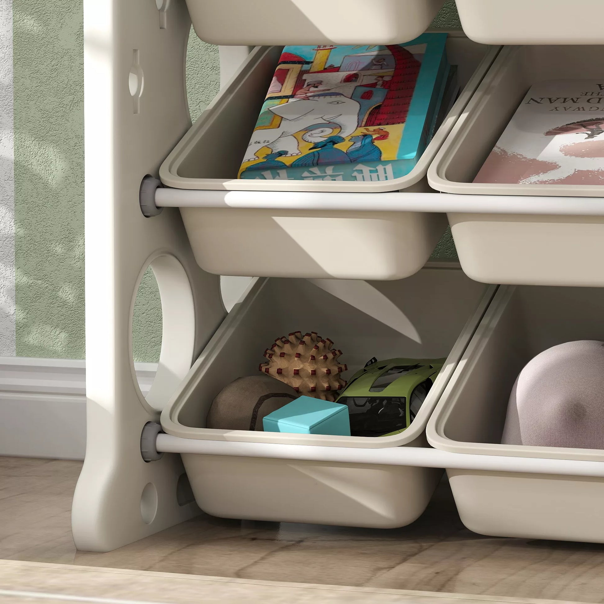 Laikymo lentyna vaikams su 9 dėžutėmis, skirta žaislams ir knygoms, vaikų kambariui, darželiui, plastikinė, kreminės baltos spalvos
