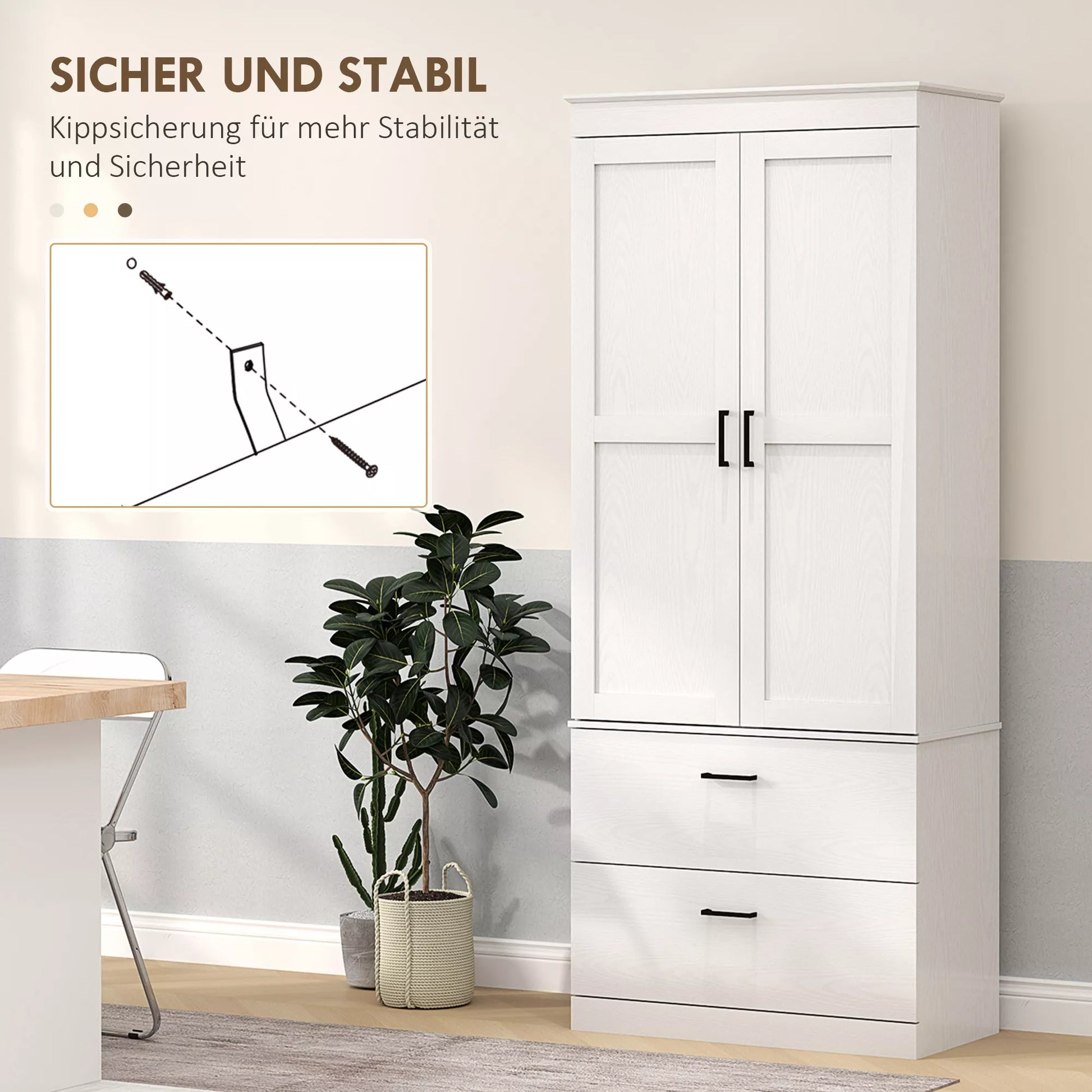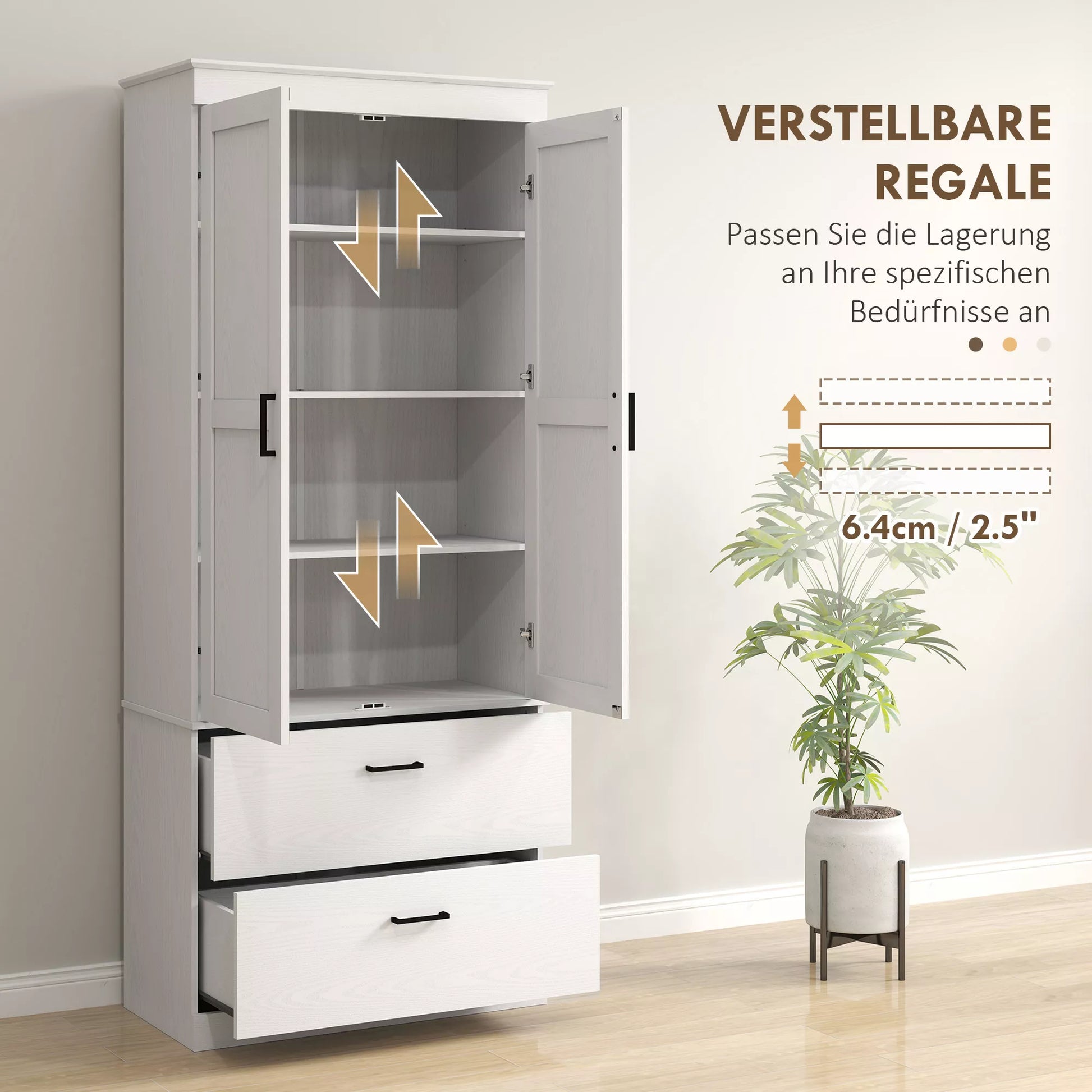 Laisvai pastatoma virtuvės spintelė su reguliuojamomis lentynomis ir dviem plačiomis stalčiais, skirta svetainei, virtuvei, balta