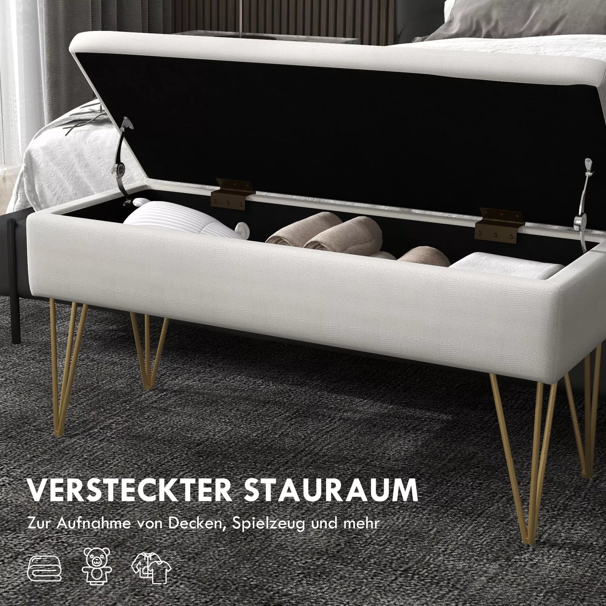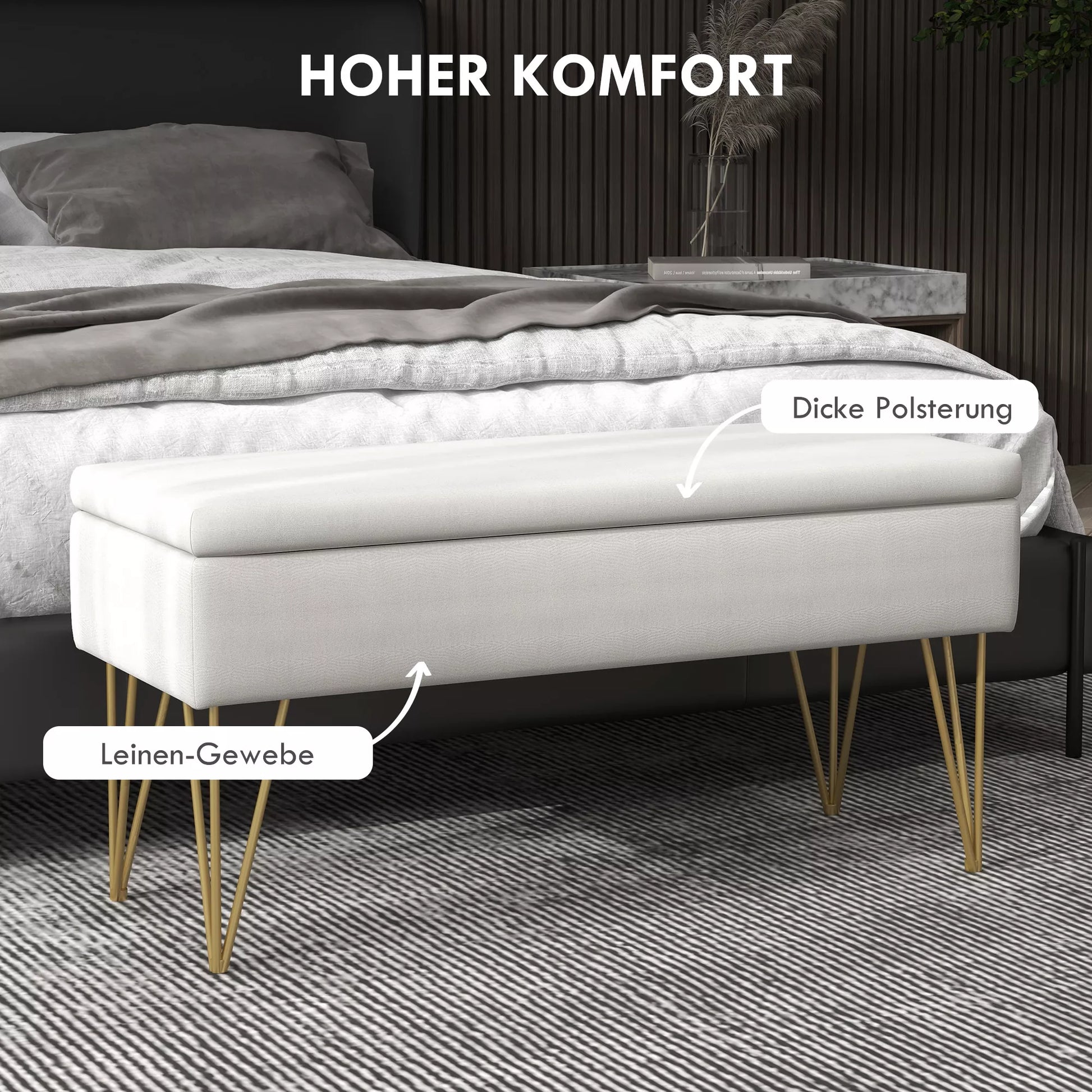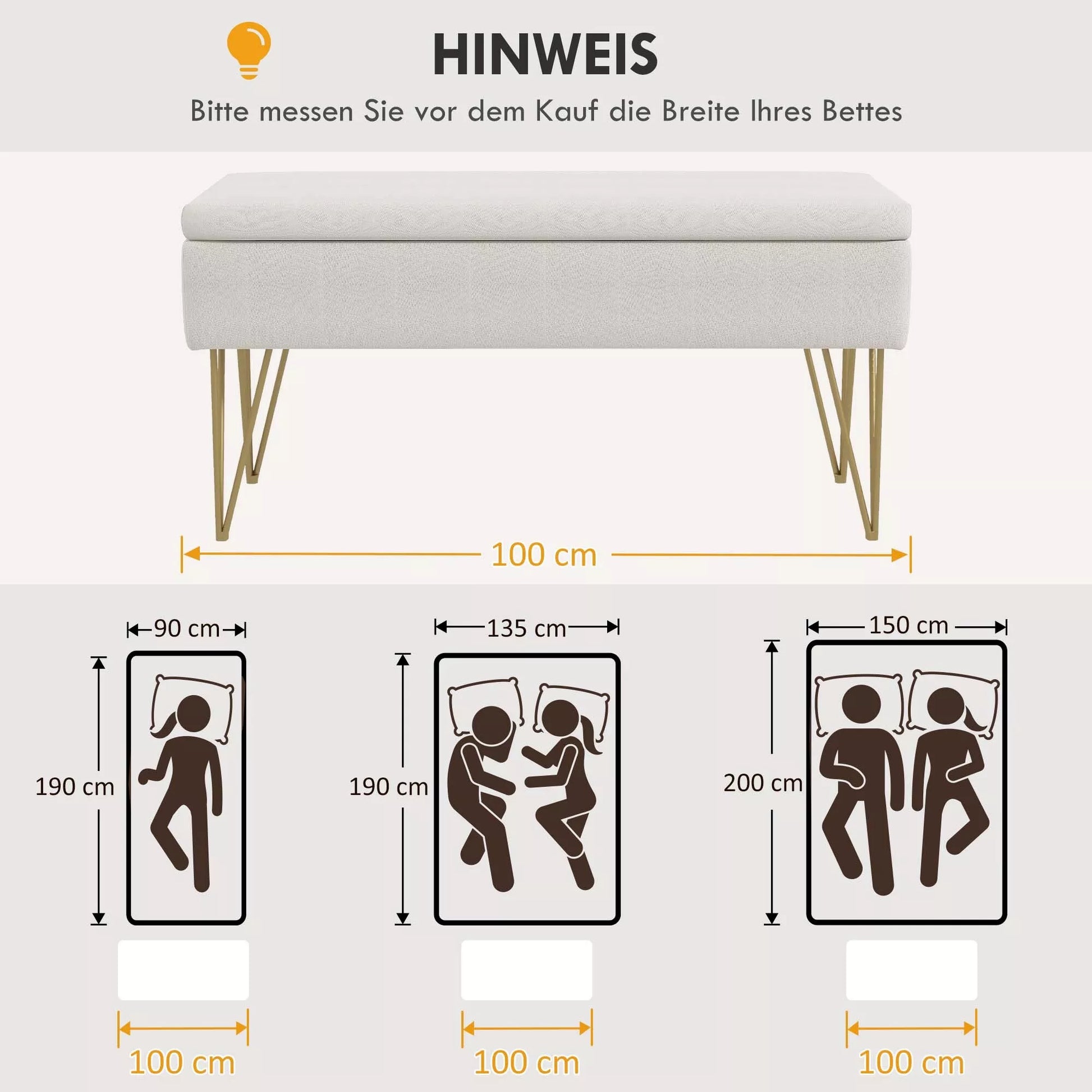Lovos suoliukas su daiktadėže, stori paminkštinimai, kvėpuojantis audinys, plieninės kojelės, 100x40x49 cm, kreminės spalvos
