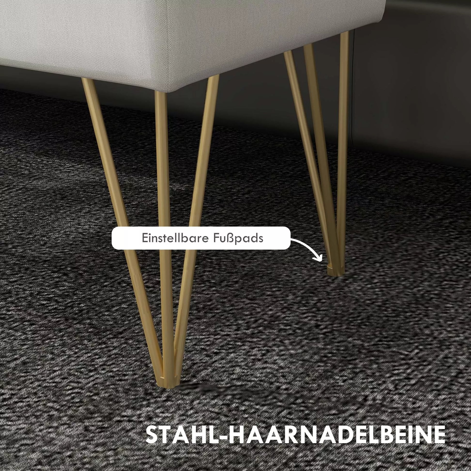 Atraskite puikų elegancijos ir minimalizmo derinį su mūsų išskirtine suolais su daiktadėže. Auksinės plaukų segtuko formos kojelės ir kreminės baltos spalvos audinys suteikia bet kuriai patalpai rafinuotumo. Nesvarbu, ar svetainėje, koridoriuje, ar miegamajame – šis suolas siūlo optimalų komfortą ir puikiai dera prie bet kokio interjero. Jo aiškios linijos ir stačiakampė forma daro jį universaliu jūsų namų akcentu. Suteikite savo interjerui ypatingo žavesio!