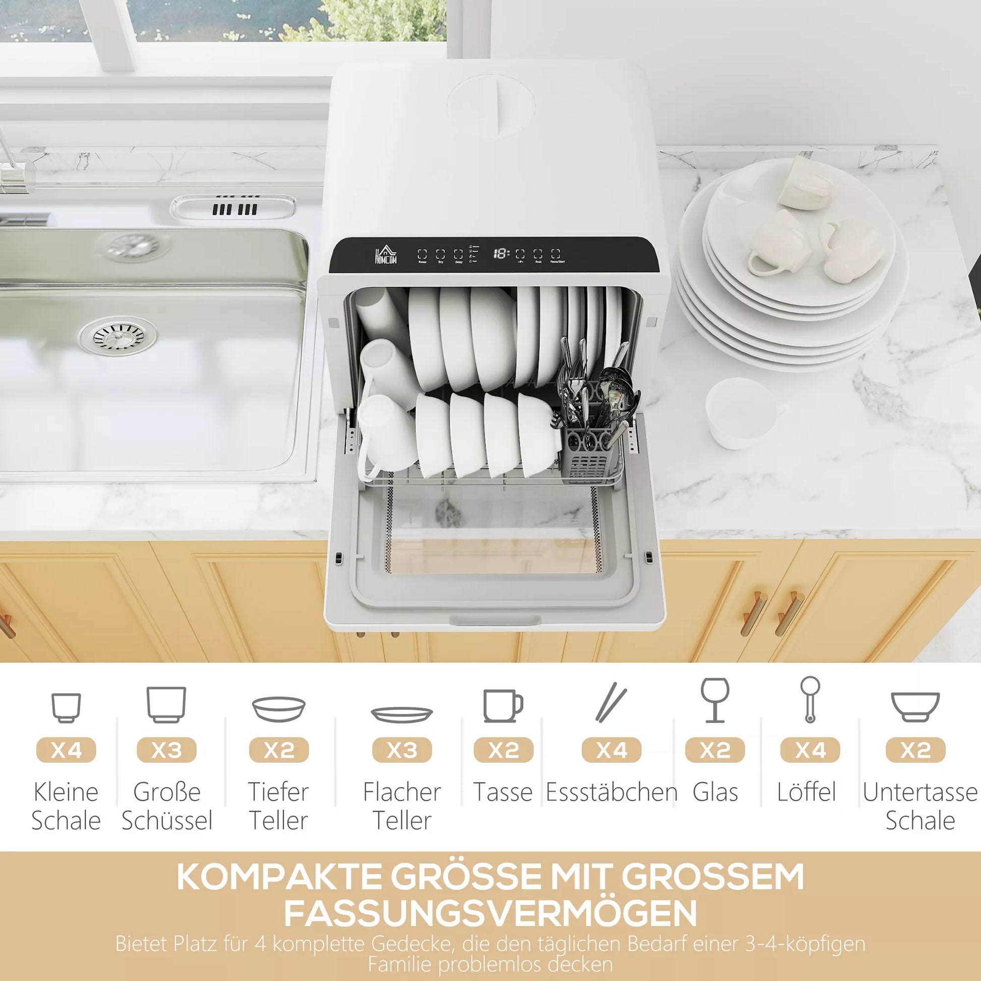- ✔ Kompaktiškas indaplovės dizainas suteikia vietos keturiems komplektams mažuose kambariuose