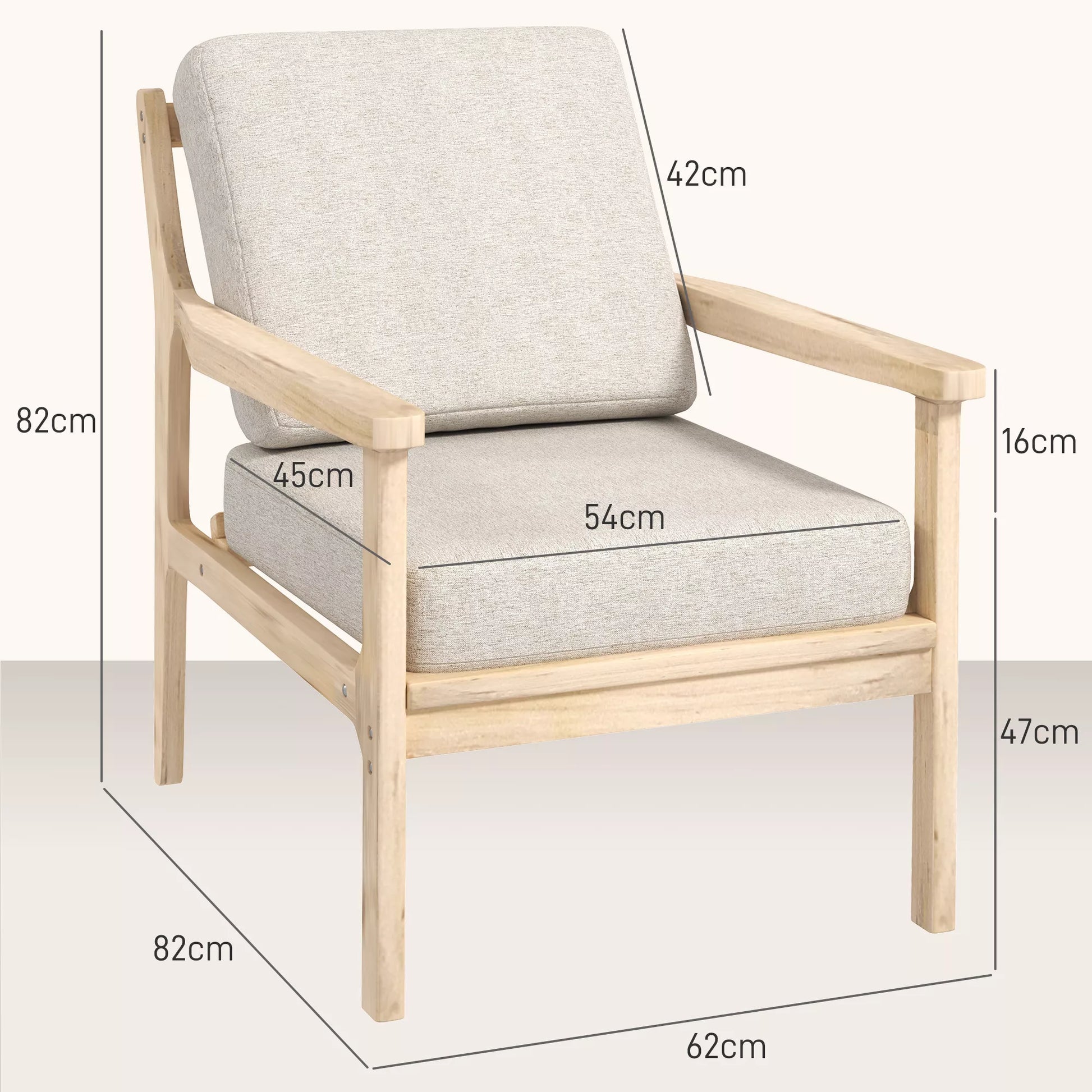 Minkštas krėslas su porankiais, tvirtu mediniu rėmu ir nuimamomis pagalvėlėmis, skirtas svetainei, miegamajam, smėlio spalvos