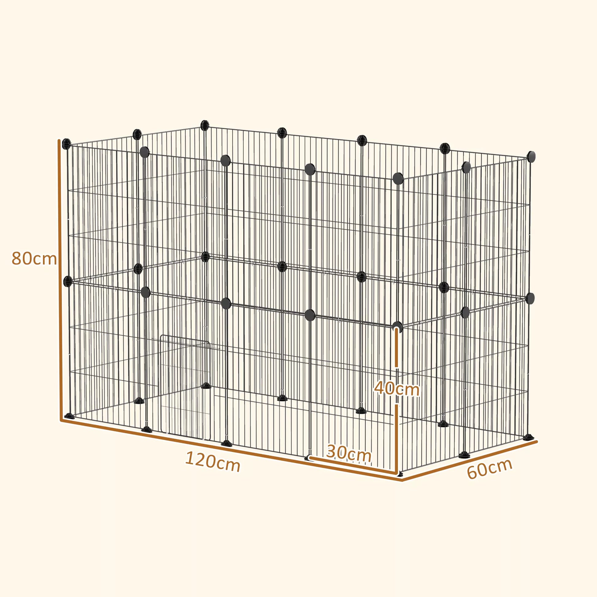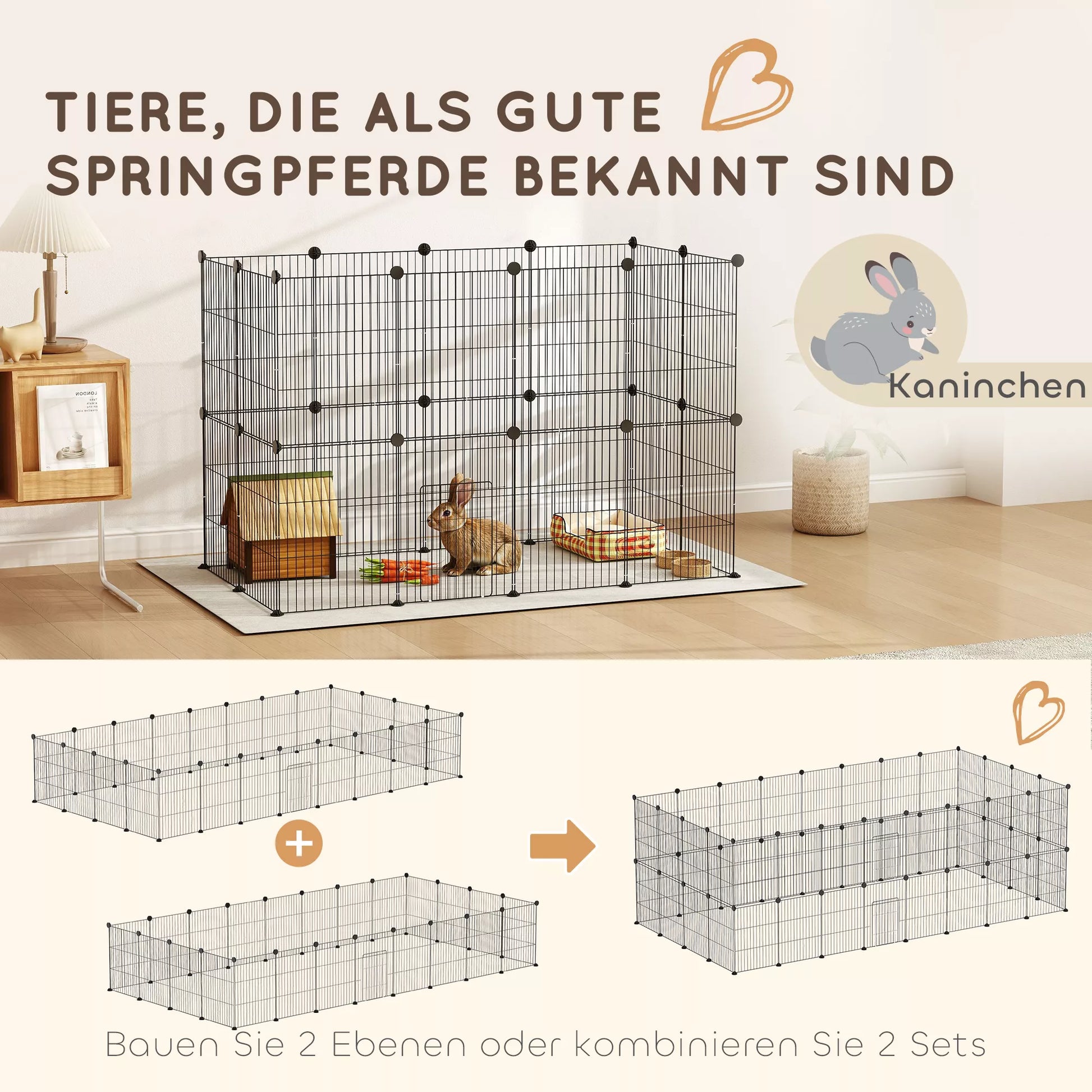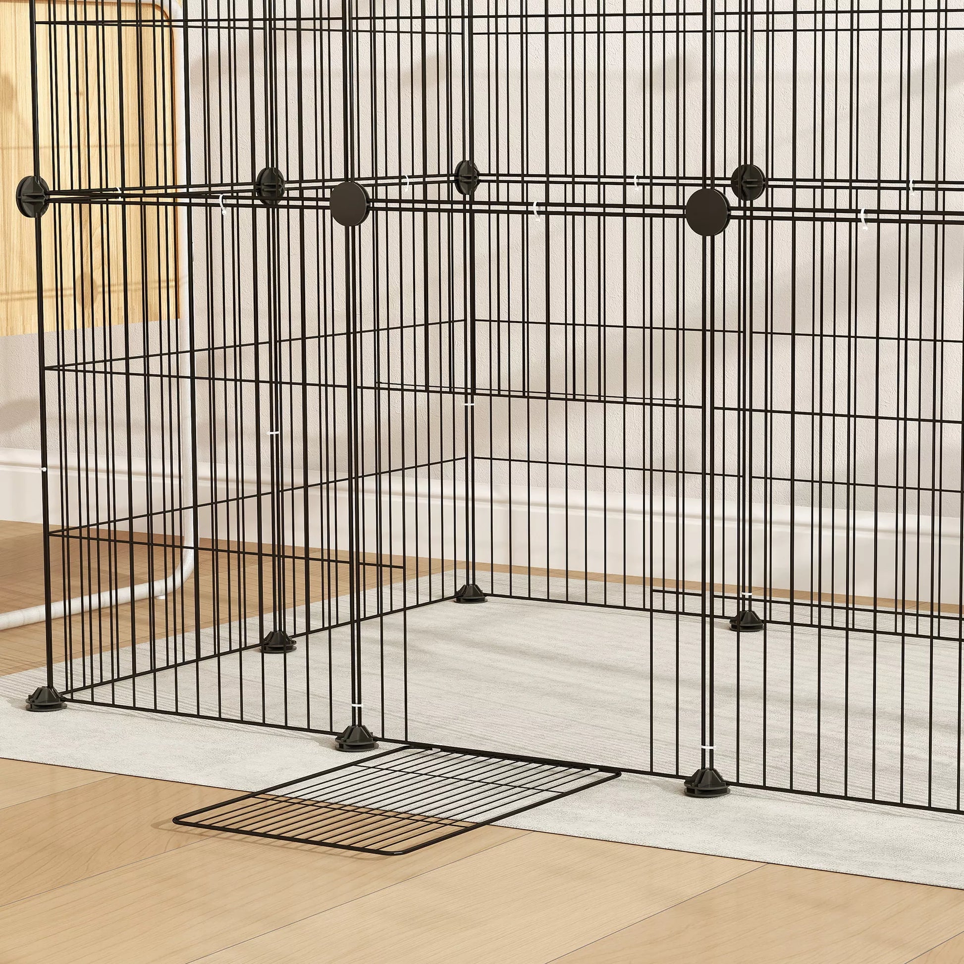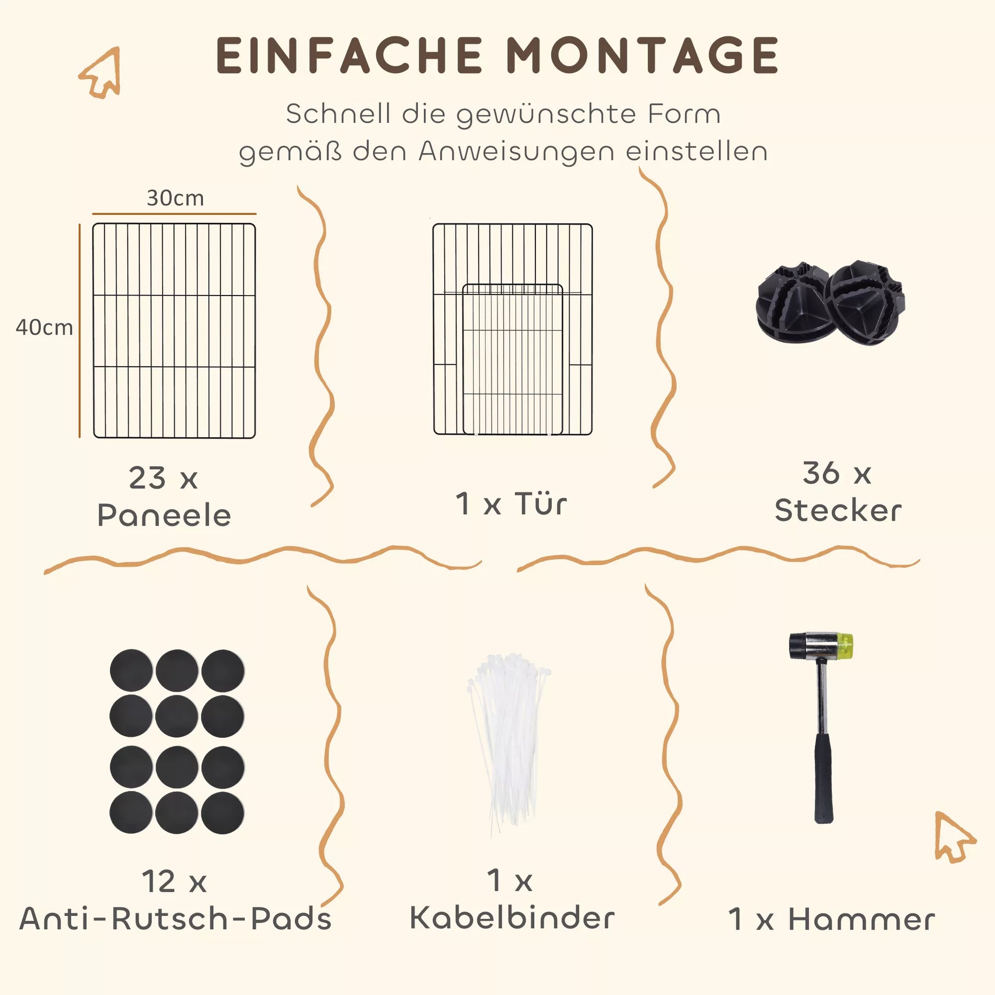 Patirkite erdvios ir saugios namų, jūsų mažiesiems draugams, džiaugsmą su šiuo moduliniu jūrų kiaulyčių aptvaru. Šis mažylių augintinių aptvaras, sudarytas iš 24 sujungtų grotelių elementų, įskaitant praktiškas duris, sukuria didelę 0,72 m² žaidimų aikštelę su 1,5 cm saugiu strypų tarpeliu. Idealiai tinka jūrų kiaulyčių ir triušių narvas, galite jį netgi sukrauti, kad sukurtumėte jaukią dviejų aukštų buveinę.
