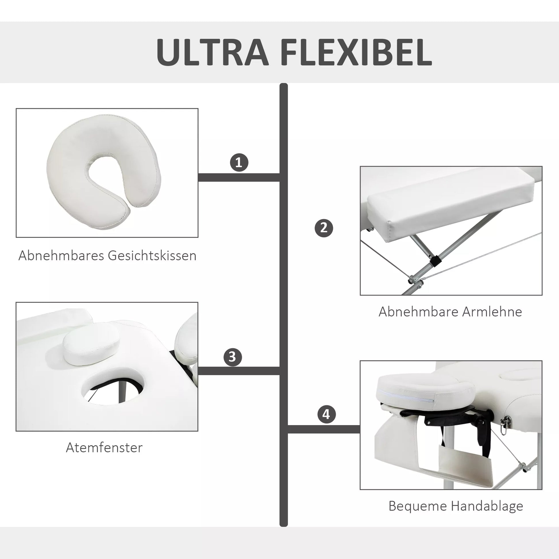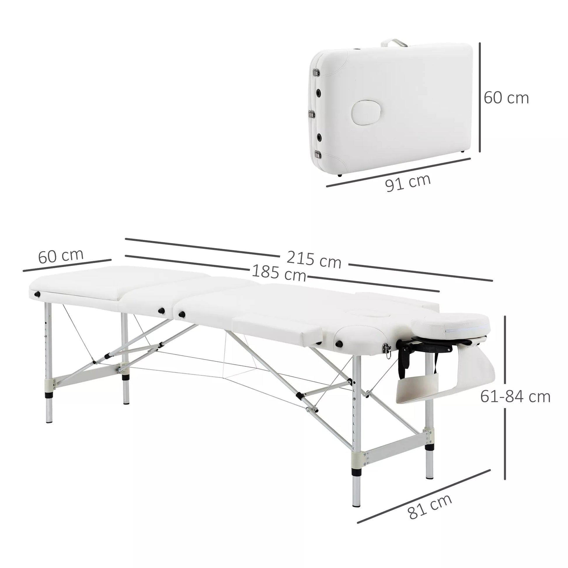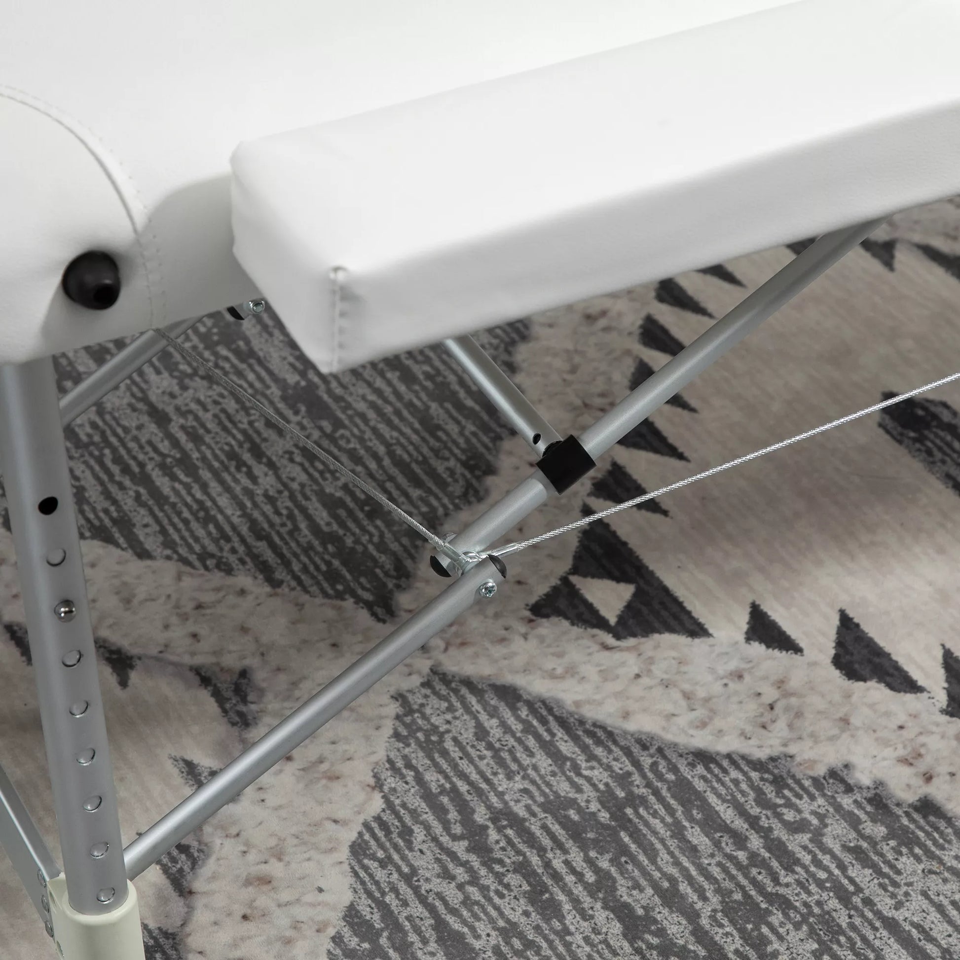 Nešiojama sulankstoma 3 zonų masažo kušetė su galvos atrama, atrama rankoms, transportavimo krepšiu, reguliuojamo aukščio aliumininė masažo kušetė, nešiojama, su priedais, iki 225 kg apkrovos, balta