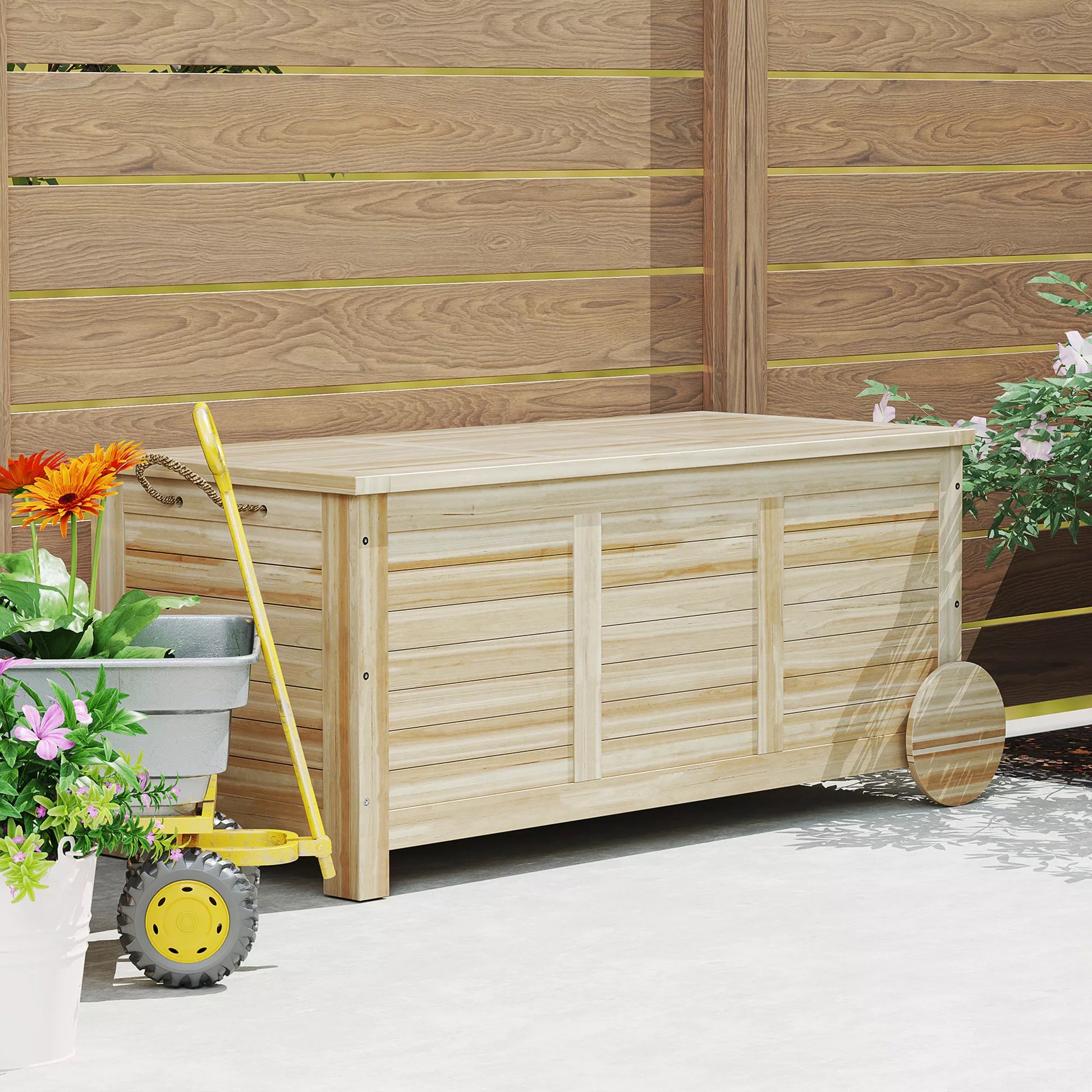 185 L lauko sandėliavimo dėžė, laikymo dėžė su ratukais, atspari oro sąlygoms, eglės mediena, 110 x 50 x 50 cm, šviesiai ruda