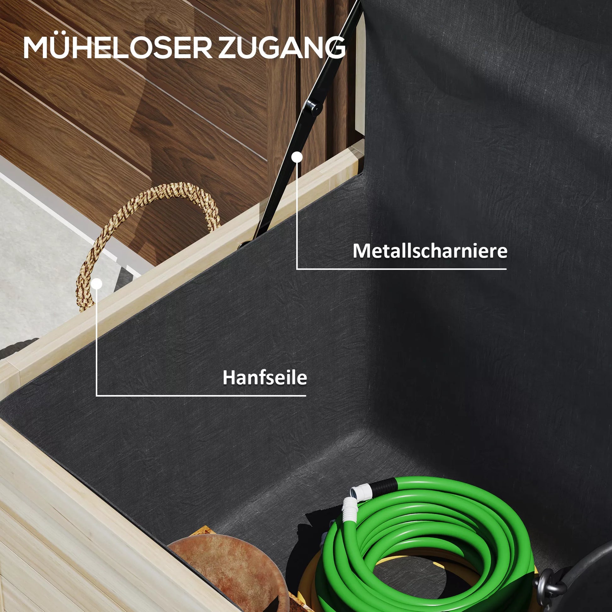- ✔ Kanapių lynai ir metalinės vyriai ant laikymo dėžės palengvina dangčio atidarymą ir uždarymą