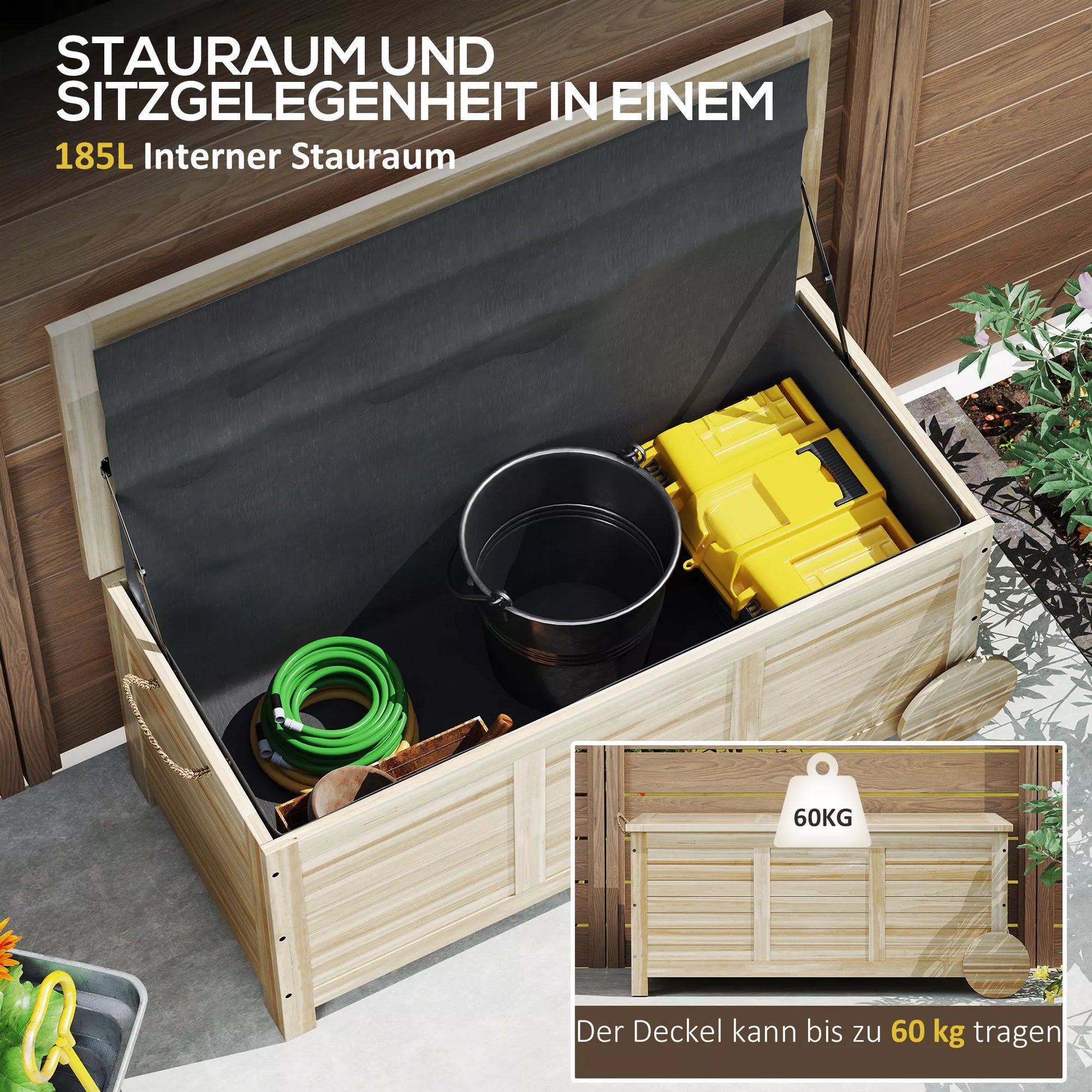 Patirkite sodo dėžės žavesį: stilinga ir praktiška vienu metu. Ši daiktadėžė siūlo didelę 185 litrų talpą ir iki 60 kg dangčio keliamąją galią, todėl ją galima naudoti kaip papildomą sėdimą vietą. Du mediniai ratukai ant laikymo dėžės palengvina jos perkėlimą, o vidinė danga apsaugo turinį nuo dulkių ir drėgmės. Puikiai tinka bet kokioms lauko erdvėms!