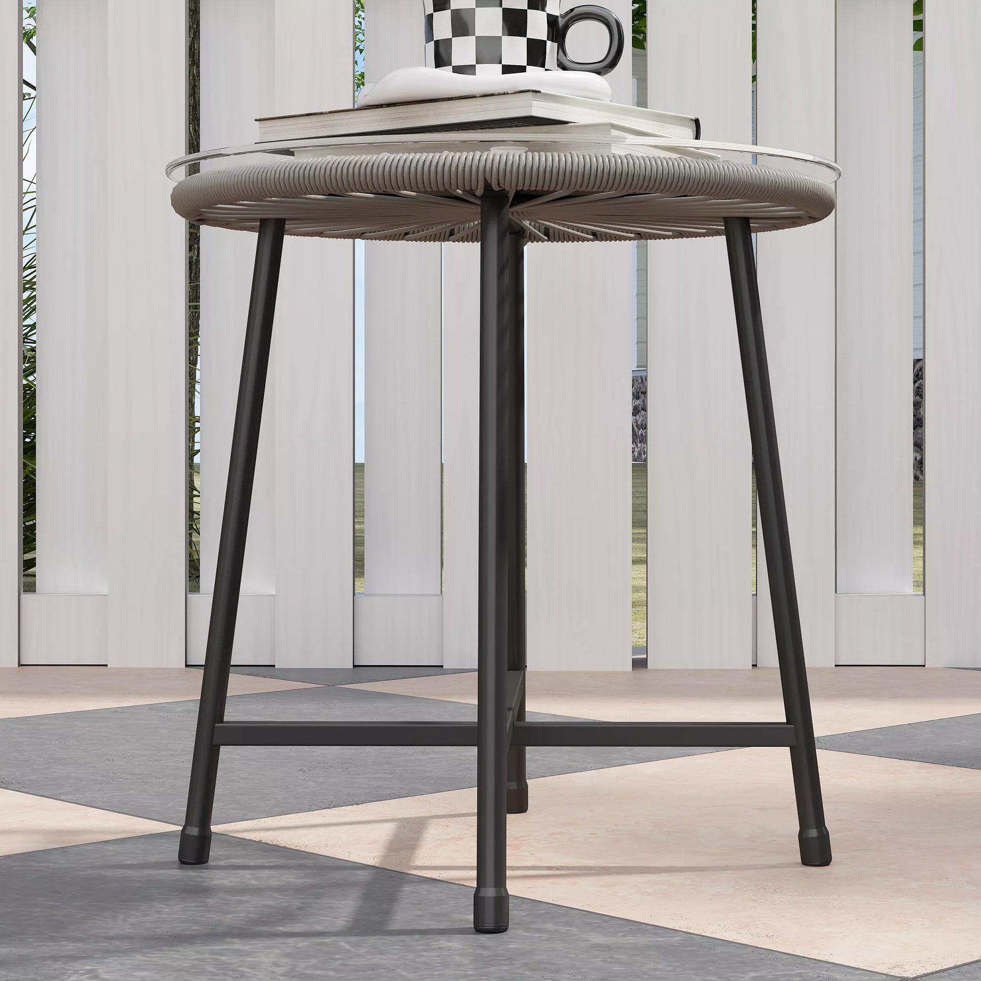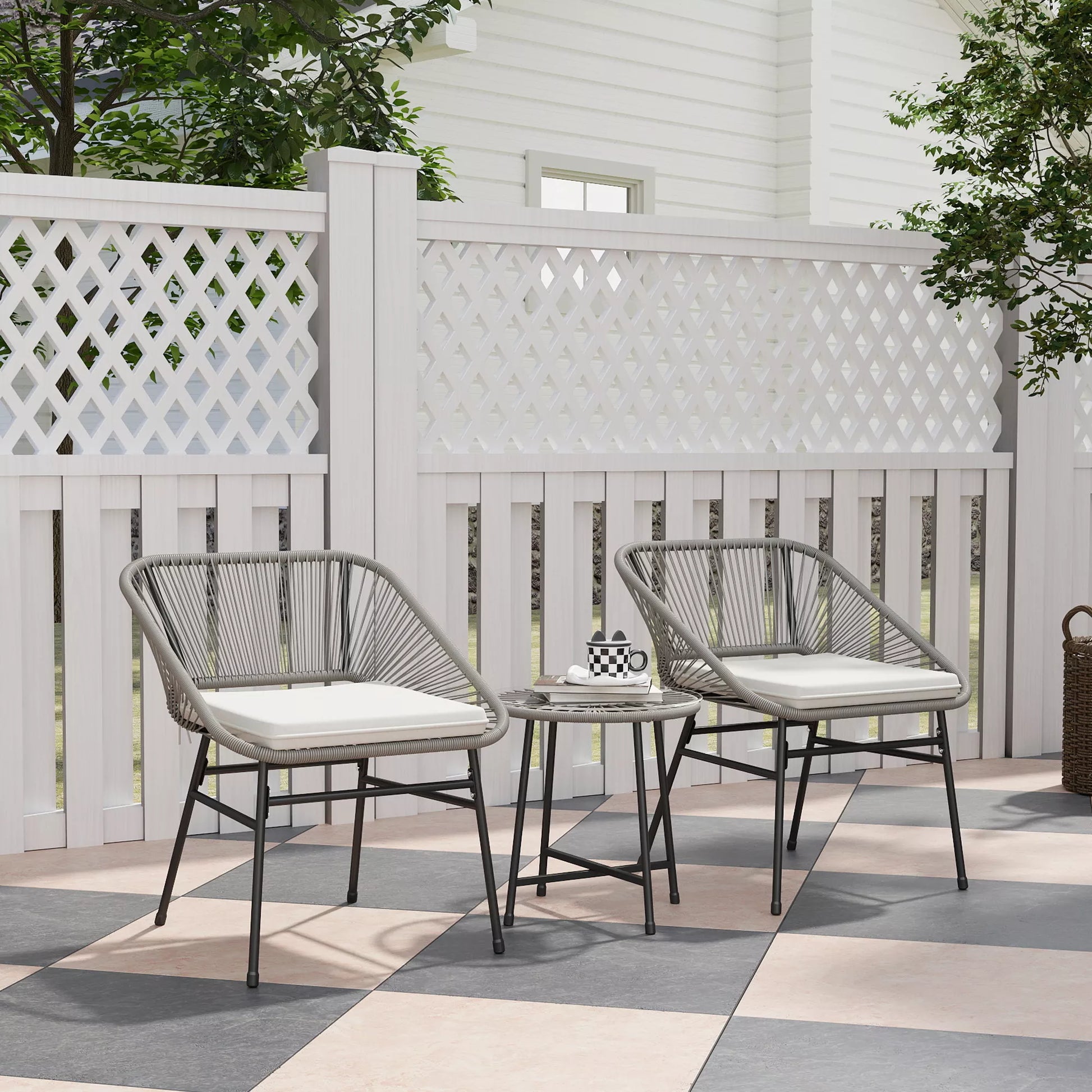 3 dalių lauko baldų komplektas, 1 stalas, 2 kėdės, ratano pynimas, plieninis rėmas, kavos staliukas su stiklo plokšte, tamsiai pilkas