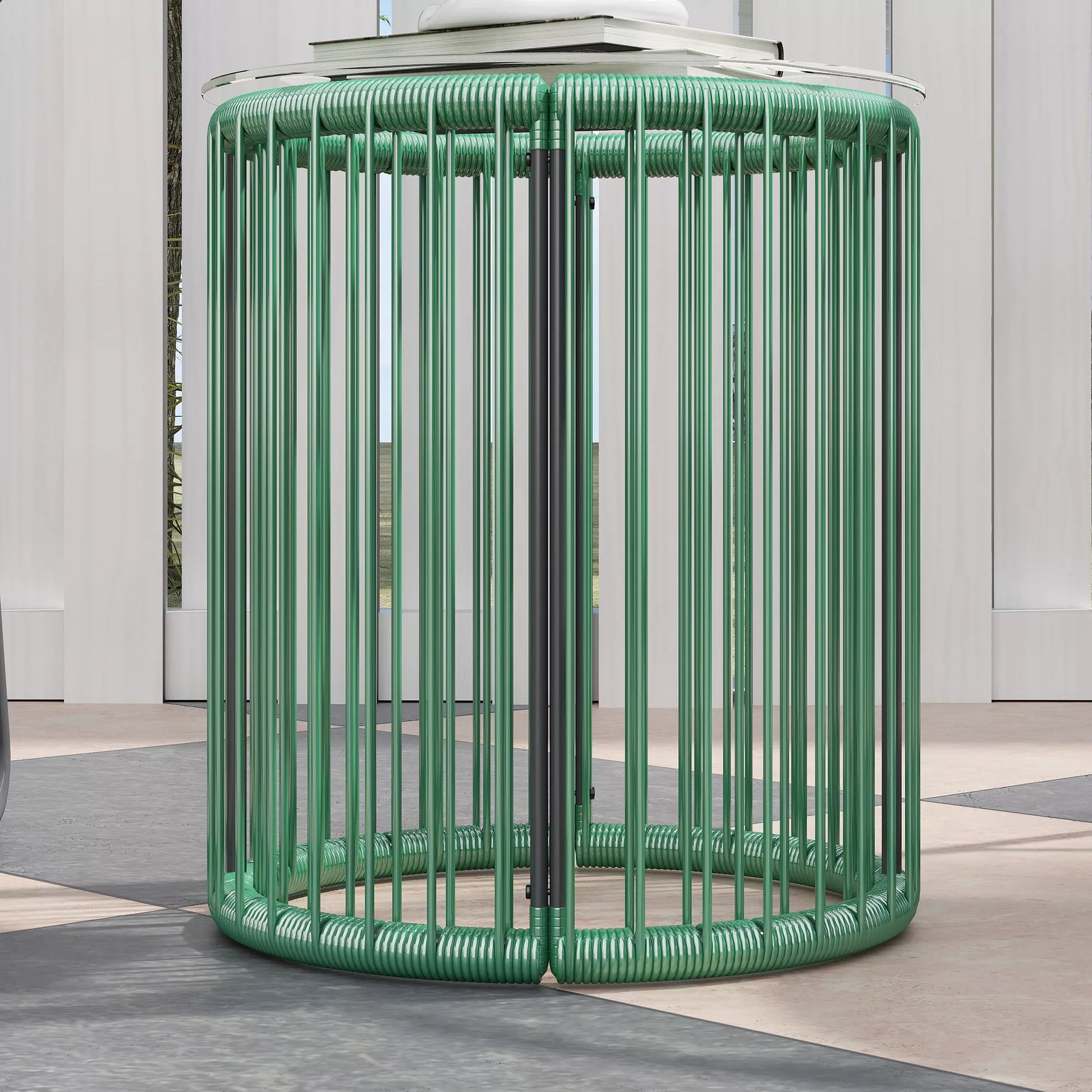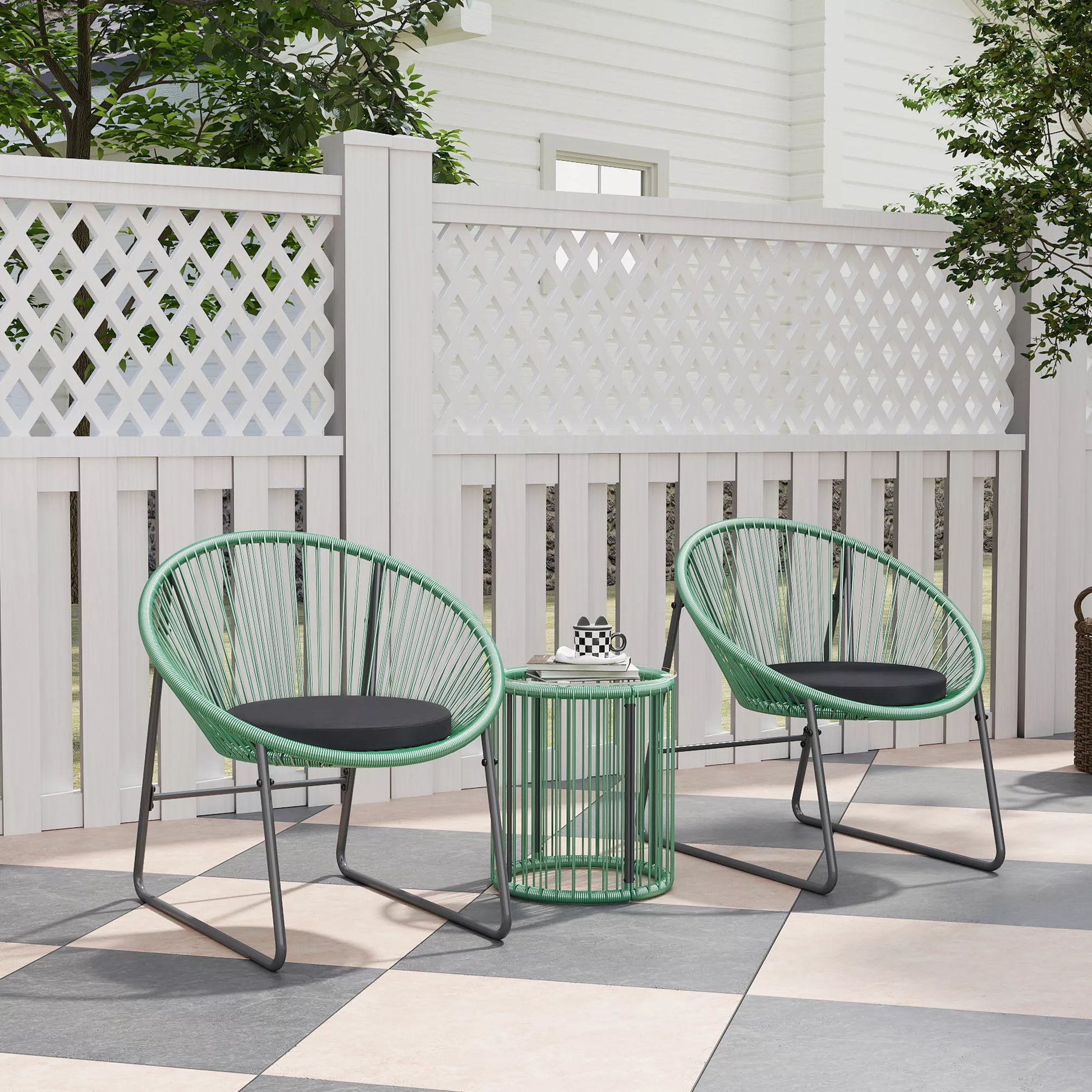 3 dalių lauko baldų komplektas, 1 stalas, 2 kėdės, stiklinis stalviršis, plastikinis rotango (rattan) imitacija ant plieninio rėmo, minkštos pagalvėlės, žalias