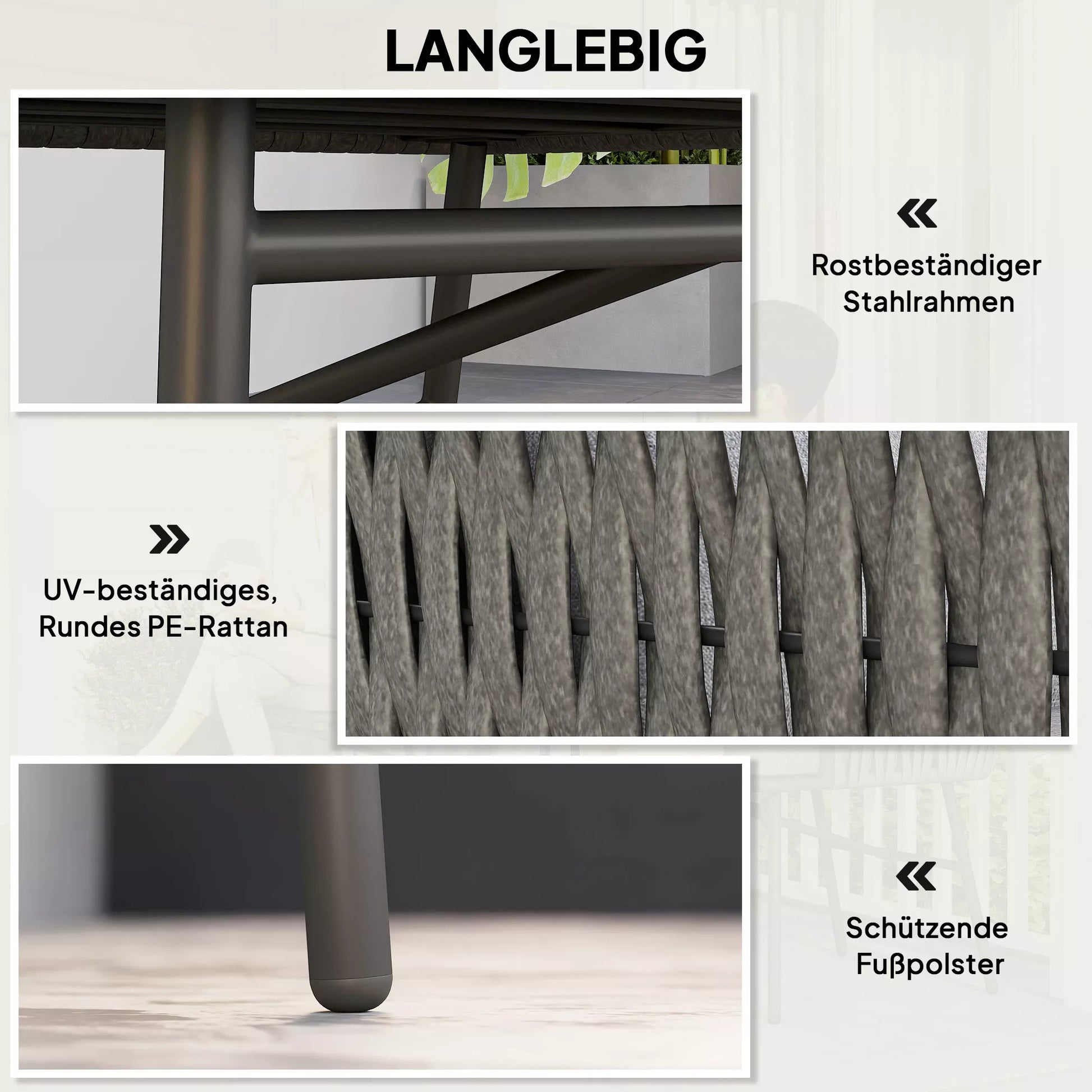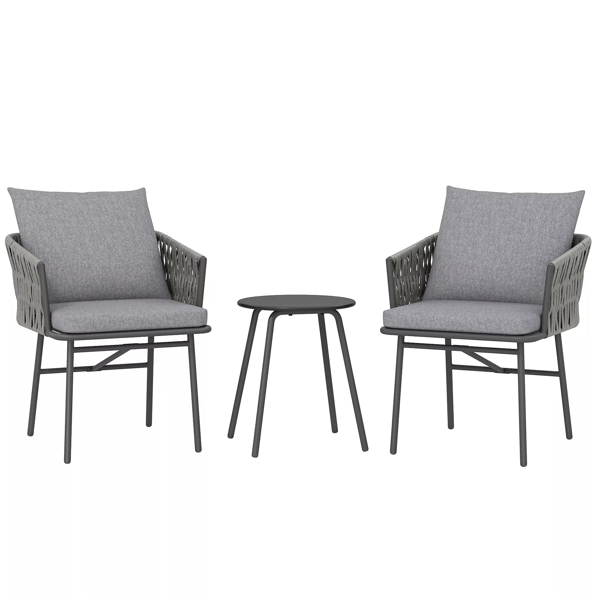 3 dalių lauko baldų komplektas, 2 kėdės, 1 stalas, bistro komplektas, sintetinio rotango, plieninis rėmas, metalinis stalas, 4 pagalvėlės, pilkos spalvos