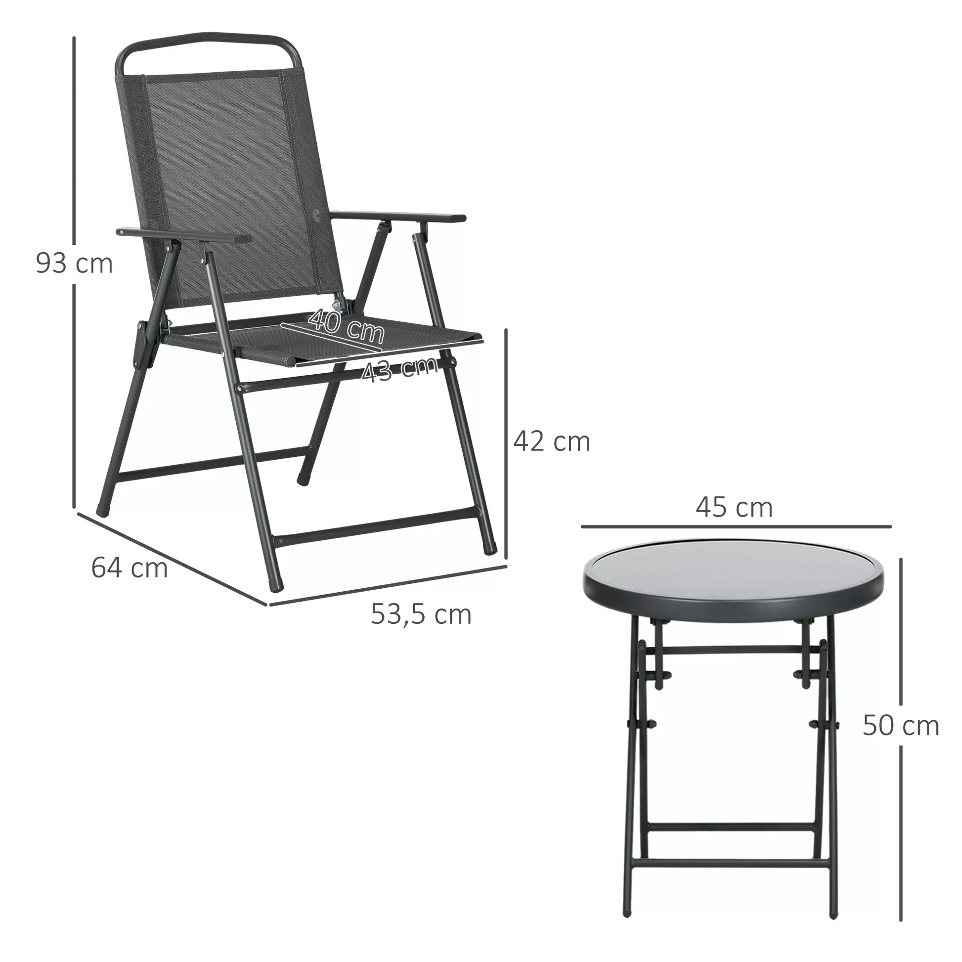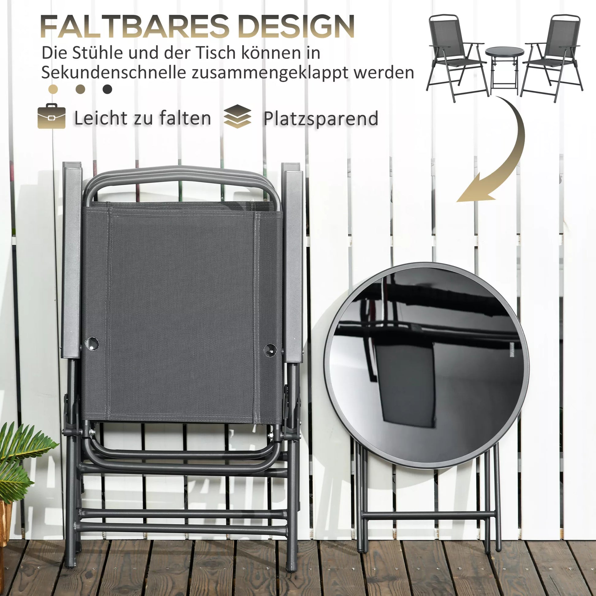 3 dalių bistros komplektas iš metalo, atsparus oro sąlygoms, sodo baldų komplektas su sulankstomu stikliniu staliuku ir sodo kėdėmis, tamsiai pilkos spalvos