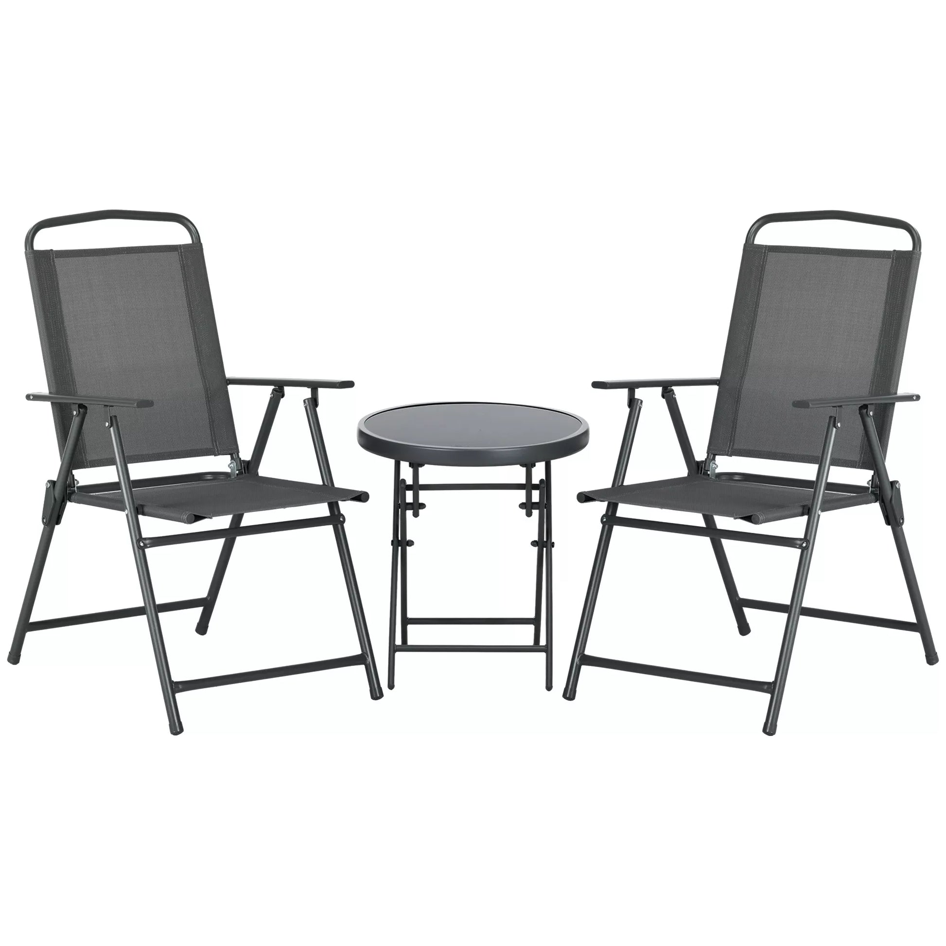 Šis trijų dalių sodo baldų komplektas, kurį gamina , susideda iš kavos staliuko su grūdinto stiklo stalviršiu ir dviejų sulankstomų kėdžių su porankiais. Bistro komplekto stalas ir kėdės pagamintos iš metalinio rėmo su milteliniu dažymu, todėl jos yra stabilios ir tvirtos. Dėl sulankstomos balkono baldų komplekto konstrukcijos stalą ir kėdes lengva laikyti ir transportuoti. Tai puiki galimybė mėgautis diena tiesiai prie savo namų durų.
